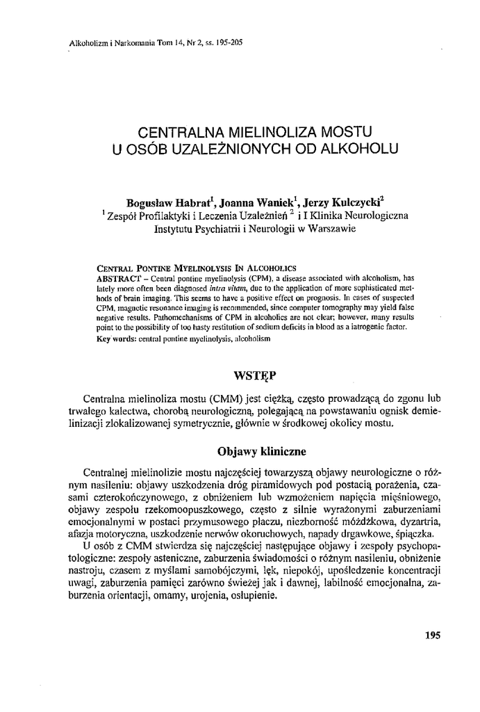74. Waniek J., Habrat B., Kulczycki J., Łysiak J.: Przebieg celllrallle} mielinolizy mostu li
