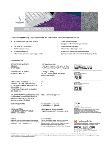 Obiektowe wykładziny i płytki dywanowe do zastosowań o dużym natężeniu ruchu Wyprodukowane w Wielkiej Brytanii Powierzchnia welurowa Dostępne w 18 standardowych kolorach Nie prują się i nie strzępią Niskie koszty konserwacji Niskie koszty montażu Właściwości zatrzymujące kurz Antyelektrostatyczne Właściwości akustyczne redukujące hałas Właściwości termiczne zachowujące ciepło Spełniają kryteria odpowiednich testów trudnopalności Dane techniczne STRUKTURA WŁÓKIEN: CIĘŻAR: GRUBOŚĆ: 100% polypropylen 1180 g/m2 (rulon), 4180 g/m2 (płytka) 10,00 mm (rulon), 11,20 mm (płytka) SZEROKOŚĆ RULONU: WYMIARY PŁYTKI: 2 metry i 4 metry 50 cm x 50 cm (płytki posiadają bitumiczne spody) TRWAŁOŚĆ KOLORU ŚWIATŁO (BS EN ISO 105:B02): POCIERANIE NA MOKRO (BS EN ISO 105:B01): POCIERANIE NA SUCHO (BS EN ISO 105:X12): >6 5 5 TRUDNOPALNOŚĆ (BS5287) Ocena i oznaczanie wykładzin tekstylnych badanych wg BS4790 (Badanie gorącą metalową śrubką): Niski promień zwęglania BS EN 13501:2002 Euroclass Cfl-s1 (rulon) Euroclass Bfl-s1 (płytka) Właściwości Standardy System zarządzania jakością BS EN ISO 9001 Standardy System zarządzania środowiskiem BS EN ISO 14001 Zalecany rozkład płytek WŁAŚCIWOŚCI ANTYELEKTROSTATYCZNE: BS ISO 6356:2000 Odpowiednie do stosowania w pomieszczeniach komputerowych Montaż Konserwacja Dokładne informacje dotyczące przygotowania podłoża i pełne zalecenia dot. montażu znajdują dostępne w Polflor Polska Sp. z o.o.. W celu osiągnięcia pełnej długości cyklu życia produktu koniecznym jest wprowadzenie harmonogramu konserwacji od chwili montażu. Pełne zalecenia dotyczące czyszczenia i konserwacji dostępne w Polflor Polska Sp. z o.o. Montaż Przed montażem płytki Momentum powinny zostać poddane klimatyzowaniu przez 24 godziny w przewidywanej temperaturze i wilgotności użytkowania. Płytki Momentum powinno się kłaść rotacyjnie zmieniając naprzemiennie kierunek płytek o 90o. Heckmondwike FB jest oddziałem National Floorcoverings Ltd. Wellington Mills, Liversedge, West Yorkshire WF15 7FH Przedstawiciel na terenie Polski: Polflor Sp. z o.o. Ul. Smolna 13A/U3, 61-008 Poznań Tel. 061-8203155, , e-mail: [email protected] WAŻNE: z przyczyn technicznych, tak jak w przypadku wszystkich materiałów tekstylnych, nie jest możliwe dopasowanie odcieni z różnych partii. Zamówienia, których odcienie muszą być dopasowane powinny być składane w jednym terminie. Produkcja może wykazywać odchylenia w stosunku do wzornika. Heckmondwike FB zastrzega sobie prawo do zmiany specyfikacji produktów bez uprzedzenia.