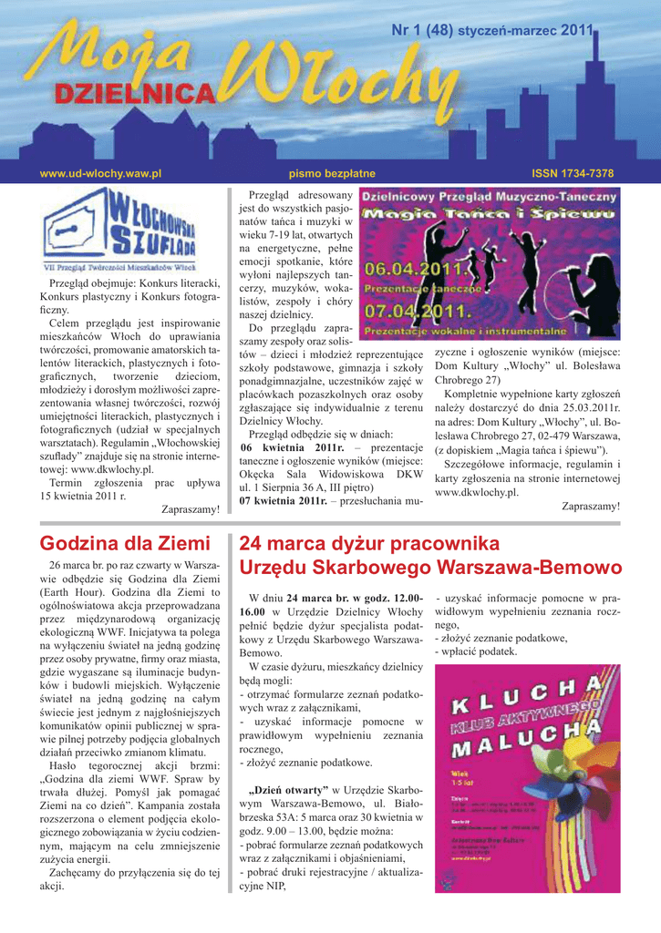 Nr 1 (48) styczeń-marzec 2011 www.ud-wlochy.waw.pl Przegląd obejmuje: Konkurs literacki, Konkurs plastyczny i Konkurs fotograficzny. Celem przeglądu jest inspirowanie mieszkańców Włoch do uprawiania twórczości, promowanie amatorskich talentów literackich, plastycznych i fotograficznych, tworzenie dzieciom, młodzieży i dorosłym możliwości zaprezentowania własnej twórczości, rozwój umiejętności literackich, plastycznych i fotograficznych (udział w specjalnych warsztatach). Regulamin „Włochowskiej szuflady” znajduje się na stronie internetowej: www.dkwlochy.pl. Termin zgłoszenia prac upływa 15 kwietnia 2011 r. Zapraszamy! Godzina dla Ziemi 26 marca br. po raz czwarty w Warszawie odbędzie się Godzina dla Ziemi (Earth Hour). Godzina dla Ziemi to ogólnoświatowa akcja przeprowadzana przez międzynarodową organizację ekologiczną WWF. Inicjatywa ta polega na wyłączeniu świateł na jedną godzinę przez osoby prywatne, firmy oraz miasta, gdzie wygaszane są iluminacje budynków i budowli miejskich. Wyłączenie świateł na jedną godzinę na całym świecie jest jednym z najgłośniejszych komunikatów opinii publicznej w sprawie pilnej potrzeby podjęcia globalnych działań przeciwko zmianom klimatu. Hasło tegorocznej akcji brzmi: „Godzina dla ziemi WWF. Spraw by trwała dłużej. Pomyśl jak pomagać Ziemi na co dzień”. Kampania została rozszerzona o element podjęcia ekologicznego zobowiązania w życiu codziennym, mającym na celu zmniejszenie zużycia energii. Zachęcamy do przyłączenia się do tej akcji. pismo bezpłatne Przegląd adresowany jest do wszystkich pasjonatów tańca i muzyki w wieku 7-19 lat, otwartych na energetyczne, pełne emocji spotkanie, które wyłoni najlepszych tancerzy, muzyków, wokalistów, zespoły i chóry naszej dzielnicy. Do przeglądu zapraszamy zespoły oraz solistów – dzieci i młodzież reprezentujące szkoły podstawowe, gimnazja i szkoły ponadgimnazjalne, uczestników zajęć w placówkach pozaszkolnych oraz osoby zgłaszające się indywidualnie z terenu Dzielnicy Włochy. Przegląd odbędzie się w dniach: 06 kwietnia 2011r. – prezentacje taneczne i ogłoszenie wyników (miejsce: Okęcka Sala Widowiskowa DKW ul. 1 Sierpnia 36 A, III piętro) 07 kwietnia 2011r. – przesłuchania mu- ISSN 1734-7378 zyczne i ogłoszenie wyników (miejsce: Dom Kultury „Włochy” ul. Bolesława Chrobrego 27) Kompletnie wypełnione karty zgłoszeń należy dostarczyć do dnia 25.03.2011r. na adres: Dom Kultury „Włochy”, ul. Bolesława Chrobrego 27, 02-479 Warszawa, (z dopiskiem „Magia tańca i śpiewu”). Szczegółowe informacje, regulamin i karty zgłoszenia na stronie internetowej www.dkwlochy.pl. Zapraszamy! 24 marca dyżur pracownika Urzędu Skarbowego Warszawa-Bemowo W dniu 24 marca br. w godz. 12.0016.00 w Urzędzie Dzielnicy Włochy pełnić będzie dyżur specjalista podatkowy z Urzędu Skarbowego WarszawaBemowo. W czasie dyżuru, mieszkańcy dzielnicy będą mogli: - otrzymać formularze zeznań podatkowych wraz z załącznikami, - uzyskać informacje pomocne w prawidłowym wypełnieniu zeznania rocznego, - złożyć zeznanie podatkowe. „Dzień otwarty” w Urzędzie Skarbowym Warszawa-Bemowo, ul. Białobrzeska 53A: 5 marca oraz 30 kwietnia w godz. 9.00 – 13.00, będzie można: - pobrać formularze zeznań podatkowych wraz z załącznikami i objaśnieniami, - pobrać druki rejestracyjne / aktualizacyjne NIP, - uzyskać informacje pomocne w prawidłowym wypełnieniu zeznania rocznego, - złożyć zeznanie podatkowe, - wpłacić podatek. Dyżury radnych Dzielnicy Włochy m.st. Warszawy Lp. 1 Nazwisko i imię dzień godzina miejsce I wtorek m-ca 17.00 – 18.00 Ratusz, Al. Krakowska 257, p.225 każdy piątek m-ca 16.00 – 17.00 Klub „Stokrotka”, Al. Krakowska 274 I poniedziałek m-ca 18.00 – 19.00 III wtorek m-ca 18.00 – 19.00 ul. ks. J. Chrościckiego 2, Biblioteka w Parku Kombatantów 501-127-802 DK „Włochy”, ul. B. Chrobrego 27 Baranowska Teresa 2 503-724-670 Berłowska Halina 3 Bieliński Marek I środa m-ca 17.00 -18.00 DK „Włochy” ul. B. Chrobrego 27 [email protected] 4 Czuma Krzysztof I wtorek m-ca 18.00-19.00 ul. ks. J. Chrościckiego 2, Biblioteka w Parku Kombatantów [email protected] 5 Gembarzewski Roman po uprzednim telefonicznym uzgodnieniu 6 Jopowicz Jacek 7 Kałwajtys Dariusz 8 Karczewska Bernadeta telefon I poniedziałek m-ca 18.00 -19.00 III wtorek m-ca 18.00 -19.00 601-265-428 ul. ks. J. Chrościckiego 2, Biblioteka w Parku Kombatantów DK „Włochy”,ul. B. Chrobrego 27 po uprzednim telefonicznym uzgodnieniu [email protected] IV poniedziałek m-ca 17.00 – 18.00 886-477-436 22 868-06-65 501-080-674 Ratusz, Al. Krakowska 257, p. 215 [email protected] 504-064-277 po uprzednim telefonicznym uzgodnieniu z Wydziałem Obsługi Rady 22 575-88-02 po uprzednim telefonicznym uzgodnieniu [email protected] 601-283-040 po uprzednim telefonicznym uzgodnieniu z Wydziałem Obsługi Rady 22 57-58-802 11 Kułakowska Elżbieta po uprzednim telefonicznym uzgodnieniu z Wydziałem Obsługi Rady 22 57-58-802 9 Kostrzewski Juliusz 10 Kozłowska Hanna 12 Mazur Jolanta III wtorek m-ca 18.00 – 19.00 I środa m-ca 17.00 - 18.00 III środa m-ca 17.00 - 18.00 13 Młynarek Christian 14 Pawlik Andrzej 15 Piecuch Jolanta Ratusz, Al. Krakowska 257, p. 225 [email protected] OPS, ul. Czereśniowa 35 Ratusz, Al. Krakowska 257, p.225 [email protected] po uprzednim telefonicznym uzgodnieniu z Wydziałem Obsługi Rady I poniedziałek m-ca: 07.03, 04.04, 18.00-19.00 06.06 (z wyjątkiem 2 maja) III poniedziałek m-ca: 21.03, 18.04, 16.05, 20.06 16 Sosnowski Radosław II wtorek m-ca Szczepańska Elżbieta 22 57-58-802 DK „Włochy”, ul. B. Chrobrego 27 602-498-257 18.00-19.00 Przedszkole Nr 71 ul. Śląska 50/52 [email protected] 18.00 – 19.00 Ratusz, Al. Krakowska 257, p. 225 radosł[email protected] 17 Sosnowski Sławomir po uprzednim uzgodnieniu telefonicznym 18 605-196-228 602-712-947 III ś