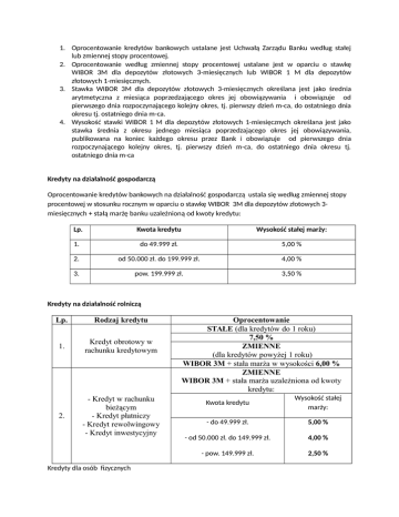 1. Oprocentowanie kredytów bankowych ustalane jest Uchwałą Zarządu Banku według stałej lub zmiennej stopy procentowej. 2. Oprocentowanie według zmiennej stopy procentowej ustalane jest w oparciu o stawkę WIBOR 3M dla depozytów złotowych 3-miesięcznych lub WIBOR 1 M dla depozytów złotowych 1-miesięcznych. 3. Stawka WIBOR 3M dla depozytów złotowych 3-miesięcznych określana jest jako średnia arytmetyczna z miesiąca poprzedzającego okres jej obowiązywania i obowiązuje od pierwszego dnia rozpoczynającego kolejny okres, tj. pierwszy dzień m-ca, do ostatniego dnia okresu tj. ostatniego dnia m-ca. 4. Wysokość stawki WIBOR 1 M dla depozytów złotowych 1-miesięcznych określana jest jako stawka średnia z okresu jednego miesiąca poprzedzającego okres jej obowiązywania, publikowana na koniec każdego okresu przez Bank i obowiązuje od pierwszego dnia rozpoczynającego kolejny okres, tj. pierwszy dzień m-ca, do ostatniego dnia okresu tj. ostatniego dnia m-ca Kredyty na działalność gospodarczą Oprocentowanie kredytów bankowych na działalność gospodarczą ustala się według zmiennej stopy procentowej w stosunku rocznym w oparciu o stawkę WIBOR 3M dla depozytów złotowych 3miesięcznych + stałą marżę banku uzależnioną od kwoty kredytu: Lp. Kwota kredytu Wysokość stałej marży: 1. do 49.999 zł. 5,00 % 2. od 50.000 zł. do 199.999 zł. 4,00 % 3. pow. 199.999 zł. 3,50 % Kredyty na działalność rolniczą Lp. Rodzaj kredytu 1. Kredyt obrotowy w rachunku kredytowym 2. - Kredyt w rachunku bieżącym - Kredyt płatniczy - Kredyt rewolwingowy - Kredyt inwestycyjny Kredyty dla osób fizycznych Oprocentowanie STAŁE (dla kredytów do 1 roku) 7,50 % ZMIENNE (dla kredytów powyżej 1 roku) WIBOR 3M + stała marża w wysokości 6,00 % ZMIENNE WIBOR 3M + stała marża uzależniona od kwoty kredytu: Kwota kredytu Wysokość stałej marży: - do 49.999 zł. 5,00 % - od 50.000 zł. do 149.999 zł. 4,00 % - pow. 149.999 zł. 2,50 % Lp. Rodzaj kredytu Oprocentowanie STAŁE (dla kredytów do 1 roku) 7,90 % 1. Kredyt gotówkowy ZMIENNE „Bezpieczna Gotówka” WIBOR 3M + marża w wysokości: Kredyt w ROR 2. Debet w ROR do 3 lat od 3 lat do 8 lat 5,00 % 6,00 % ZMIENNE WIBOR 3M + marża 5,00 % ZMIENNE 0,85 oprocentowania kredytu przeterminowanego ZMIENNE 3. Kredyt mieszkaniowy „Mój Dom” WIBOR 3M + marża w wysokości: LtV do 30 % LtV od 31 % do 80 % do 10 lat 3,00 % 3,50 % powyżej 10 lat 3,25 % 4,00 % ZMIENNE 4. Uniwersalny kredyt hipoteczny WIBOR 3M + marża w wysokości: LtV do 50 % LtV od 51 % do 80 % do 10 lat 3,25 % 3,75 % powyżej 10 lat 3,50 % 4,00 % ZMIENNE 5. 6. Kredyt mieszkaniowy „Mieszkanie dla Młodych” WIBOR 3M + marża w wysokości: LtV do 50 % LtV od 51 % do 80 % do 10 lat 3,25 % 3,75 % powyżej 10 lat 3,50 % 4,00 % Kredyt konsolidacyjny ZMIENNE WIBOR 3M + marża w wysokości: do 100 tyś. zł. powyżej 100 tyś. zł. do 5 lat 4,00 % 5,00 % powyżej 5 lat: 5,00 % 6,00 % Oprocentowanie zadłużenia przeterminowanego z tytułu kredytów bankowych ustala się w stosunku rocznym wg zmiennej stopy procentowej określonej w wysokości dwukrotności odsetek ustawowych za opóźnienie w stosunku rocznym i obowiązującej w okresie, za który odsetki są naliczane. Odsetki ustawowe za opóźnienie są równe wysokości sumy stopy referencyjnej Narodowego Banku Polskiego i 5,5 p.p