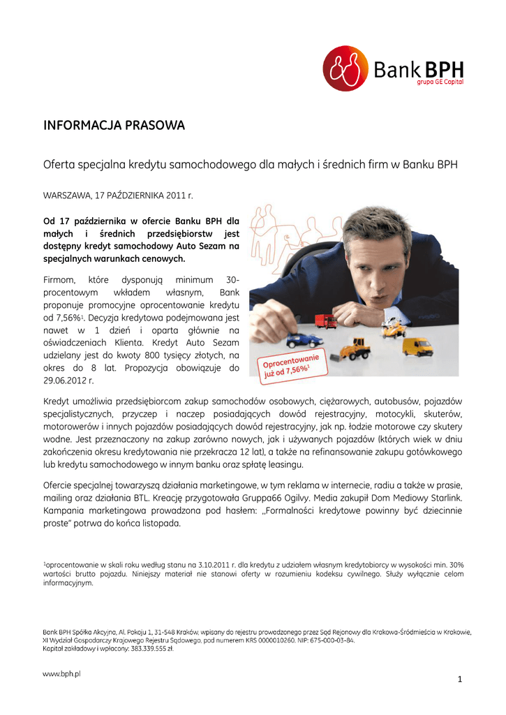 INFORMACJA PRASOWA Oferta specjalna kredytu samochodowego dla małych i średnich firm w Banku BPH WARSZAWA, 17 PAŹDZIERNIKA 2011 r. Od 17 października w ofercie Banku BPH dla małych i średnich przedsiębiorstw jest dostępny kredyt samochodowy Auto Sezam na specjalnych warunkach cenowych. Firmom, które dysponują minimum 30procentowym wkładem własnym, Bank proponuje promocyjne oprocentowanie kredytu od 7,56%1. Decyzja kredytowa podejmowana jest nawet w 1 dzień i oparta głównie na oświadczeniach Klienta. Kredyt Auto Sezam udzielany jest do kwoty 800 tysięcy złotych, na okres do 8 lat. Propozycja obowiązuje do 29.06.2012 r. Kredyt umożliwia przedsiębiorcom zakup samochodów osobowych, ciężarowych, autobusów, pojazdów specjalistycznych, przyczep i naczep posiadających dowód rejestracyjny, motocykli, skuterów, motorowerów i innych pojazdów posiadających dowód rejestracyjny, jak np. łodzie motorowe czy skutery wodne. Jest przeznaczony na zakup zarówno nowych, jak i używanych pojazdów (których wiek w dniu zakończenia okresu kredytowania nie przekracza 12 lat), a także na refinansowanie zakupu gotówkowego lub kredytu samochodowego w innym banku oraz spłatę leasingu. Ofercie specjalnej towarzyszą działania marketingowe, w tym reklama w internecie, radiu a także w prasie, mailing oraz działania BTL. Kreację przygotowała Gruppa66 Ogilvy. Media zakupił Dom Mediowy Starlink. Kampania marketingowa prowadzona pod hasłem: ,,Formalności kredytowe powinny być dziecinnie proste” potrwa do końca listopada. 1oprocentowanie w skali roku według stanu na 3.10.2011 r. dla kredytu z udziałem własnym kredytobiorcy w wysokości min. 30% wartości brutto pojazdu. Niniejszy materiał nie stanowi oferty w rozumieniu kodeksu cywilnego. Służy wyłącznie celom informacyjnym. 1 *** Bank BPH oferuje swoje produkty i usługi Klientom indywidualnym, małym i średnim przedsiębiorstwom oraz Klientom korporacyjnym. Bogata oferta Banku zawiera m.in.: kredyty, w tym gotówkowe i hipoteczne, konta osobiste, rachunki oszczędnościowe i lokaty oraz karty kredytowe. Bank BPH prowadzi również działalność w zakresie zintegrowanych usług maklerskich, bankowości skarbowej oraz zarządzania aktywami poprzez spółkę zależną BPH TFI. Klienci Banku mogą korzystać z sieci blisko 300 oddziałów własnych, a także placówek partnerskich i agencji uniwersalnych, jak również z nowoczesnej bankowości internetowej oraz telefonicznej. Bank BPH jest obecny na polskim rynku od ponad 20 lat. Jest spółką publiczną notowaną na Giełdzie Papierów Wartościowych w Warszawie. Siedzibą prawną Banku BPH jest Kraków, biuro centrali znajduje się w Warszawie, a główne centra operacyjne w Gdańsku i Krakowie. Bank BPH wchodzi w skład grupy kapitałowej GE, jednej z największych korporacji na świecie. Katarzyna Ewert, Specjalista ds. Public Relations Departament Public Relations Bank BPH e-mail: [email protected] Telefon: +48 22 531 86 28 2