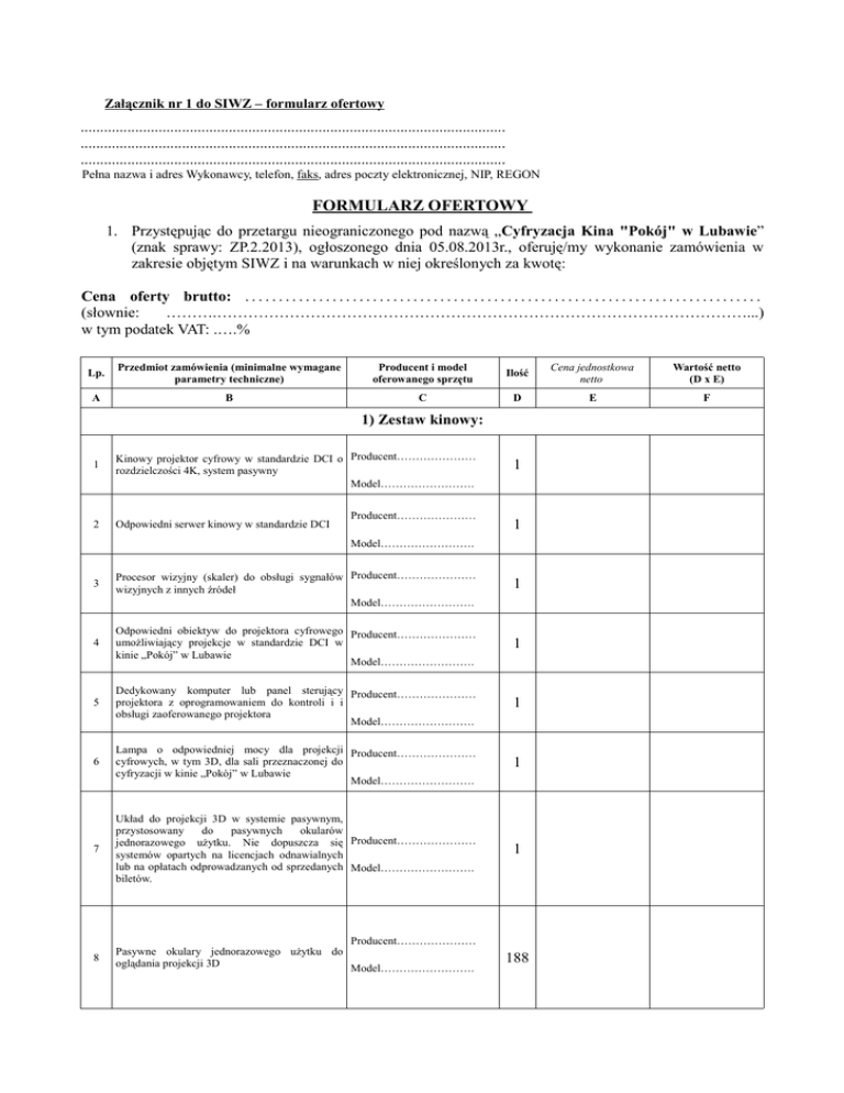 Załącznik nr 1 do SIWZ – formularz ofertowy ............................................................................................................. ............................................................................................................. ............................................................................................................. Pełna nazwa i adres Wykonawcy, telefon, faks, adres poczty elektronicznej, NIP, REGON FORMULARZ OFERTOWY 1. Przystępując do przetargu nieograniczonego pod nazwą „Cyfryzacja Kina "Pokój" w Lubawie” (znak sprawy: ZP.2.2013), ogłoszonego dnia 05.08.2013r., oferuję/my wykonanie zamówienia w zakresie objętym SIWZ i na warunkach w niej określonych za kwotę: Cena oferty brutto: . . . . . . . . . . . . . . . . . . . . . . . . . . . . . . . . . . . . . . . . . . . . . . . . . . . . . . . . . . . . . . . . . . . . . . . . . . . . . (słownie: ……….…………………………………………………………………………………………...) w tym podatek VAT: .….% Lp. Przedmiot zamówienia (minimalne wymagane parametry techniczne) Producent i model oferowanego sprzętu Ilość Cena jednostkowa netto Wartość netto (D x E) A B C D E F 1) Zestaw kinowy: 1 2 Kinowy projektor cyfrowy w standardzie DCI o Producent………………… rozdzielczości 4K, system pasywny Model……………………. Odpowiedni serwer kinowy w standardzie DCI Producent………………… 1 1 Model……………………. 3 Procesor wizyjny (skaler) do obsługi sygnałów Producent………………… wizyjnych z innych źródeł Model……………………. 1 4 Odpowiedni obiektyw do projektora cyfrowego Producent………………… umożliwiający projekcje w standardzie DCI w kinie „Pokój” w Lubawie Model……………………. 1 5 Dedykowany komputer lub panel sterujący Producent………………… projektora z oprogramowaniem do kontroli i i obsługi zaoferowanego projektora Model……………………. 1 6 Lampa o odpowiedniej mocy dla projekcji Producent………………… cyfrowych, w tym 3D, dla sali przeznaczonej do cyfryzacji w kinie „Pokój” w Lubawie Model……………………. 1 7 Układ do projekcji 3D w systemie pasywnym, przystosowany do pasywnych okularów jednorazowego użytku. Nie dopuszcza się Producent………………… systemów opartych na licencjach odnawialnych lub na opłatach odprowadzanych od sprzedanych Model……………………. biletów. 1 8 Producent………………… Pasywne okulary jednorazowego użytku do oglądania projekcji 3D Model……………………. 188 Cyfryzacja Kina "Pokój" w Lubawie 9 Odpowiedni stolik pod zestaw cyfrowy Producent………………… 1 Model……………………. 10 Dostawa, instalacja, uruchomienie i zestrojenie urządzeń wraz z niezbędnym wyposażeniem kina cyfrowego oraz szkolenie kinooperatorów --- 1 1) Łącznie netto: 2) Zestaw nagłośnieniowy i pozostały przedmiot zamówienia 11 Ekran do projekcji 3D materiału „srebrnego metalizowanego” Producent………………… Model……………………. 1 12 Procesor kinowy cyfrowy, odpowiedni dla Producent………………… współpracy z serwerami kina cyfrowego Standardu DCI Model……………………. 1 13 Szafa aparaturowa, rack 19”, okablowana z panelem zasilająco bezpiecznikowym, Producent………………… wyposażona w monitor odsłuchowo – kontrolny, umożliwiający kontrolę pracy poszczególnych Model……………………. kanałów systemu nagłośnienia kina 1 14 Wzmacniacz mocy – np. DSI 2000 Crown lub równoważny. Kinowy wzmacniacz mocy z wbudowanym procesorem dla głośników zaekranowych ScreenArray ( Lewy, Centralny, Prawy). Procesor zawiera zwrotnice, graficzny Producent………………… EQ, limiter, linie opóźniające. Moc: 2x1000W/2, 2x800W/4, br.1x2000W/4, 1x1600W/8, zakres Model……………………. odtwarzanych częstotliwości: 20Hz-20kHz, zniekształcenia harmoniczne 0,5%-1%, stosunek sygnał/szum: > 100dB 6 15 Głośnik zaekranowy – np. JBL 3732 lub równoważny. Trójdrożna kolumna głośnikowa zaekranowa przeznaczona dla kanałów: Lewy, Producent………………… Centralny, Prawy. Moc:LF-500W;M/HF -150W Zakres odtwarzanych częstotliwości (+/- dB): 30Hz-20 kHz, częstotliwość podziału: 350 Hz, Model……………………. max. poziom odtwarzanego sygnału :125 dB @ 1m. 3 16 Głośnik superbasowy – np. JBL 4642 A lub równoważny. Głośnik zaekranowy przeznaczony Producent………………… dla kanału superbasowego, wyposażony w osłony membran typu "grill" i koła jezdne. Moc: 1200W, Model……………………. poziom odtwarzanego sygnału: 101 dB SPL 1 17 Głośnik efektowy (surround) – np. JBL 8340A lub równoważny. Dwudrożny głośnik efektowy przeznaczony do systemów analogowych i Producent………………… cyfrowych. Zakres odtwarzanych częstotliwości (+/- dB): 45Hz-18kHz, kąty pokrycia (poziom x pion):100˚ x 80˚, moc przy ciągłym różowym Model……………………. szumie: 250W, moc muzyczna: 500W, poziom odtwarzanego sygnału: 96 dB@ SPL. 12 18 Montaż urządzeń w szafie Rack, wykonanie instalacji elektroakustycznej i przyłącza na scenie, regulacje, przeszkolenie obsługi. Komplet niezbędnego okablowania głośnikowego i sygnałowego montaż z uruchomieniem i zestrojeniem systemu DCI. --- 1 Str. 2/6 Cyfryzacja Kina "Pokój" w Lubawie 19 Okulary pasywne, jednorazowego użytku do systemu 3D w tym: Producent………………… - 3 000 sztuk okularów przeznaczonych do oglądania dla osób dorosłych - 3 000 sztuk okularów przeznaczonych do Model……………………. oglądania dla dzieci 6000 2) Łącznie netto: Razem wartość netto (poz. 1 + 2) Razem wartość brutto 2. Oświadczam(y), że oferowany sprzęt spełnia minimalne, określone przez Zamawiającego, parametry techniczne. 3. Oświadczam(y), że wykonam(y) przedmiot 