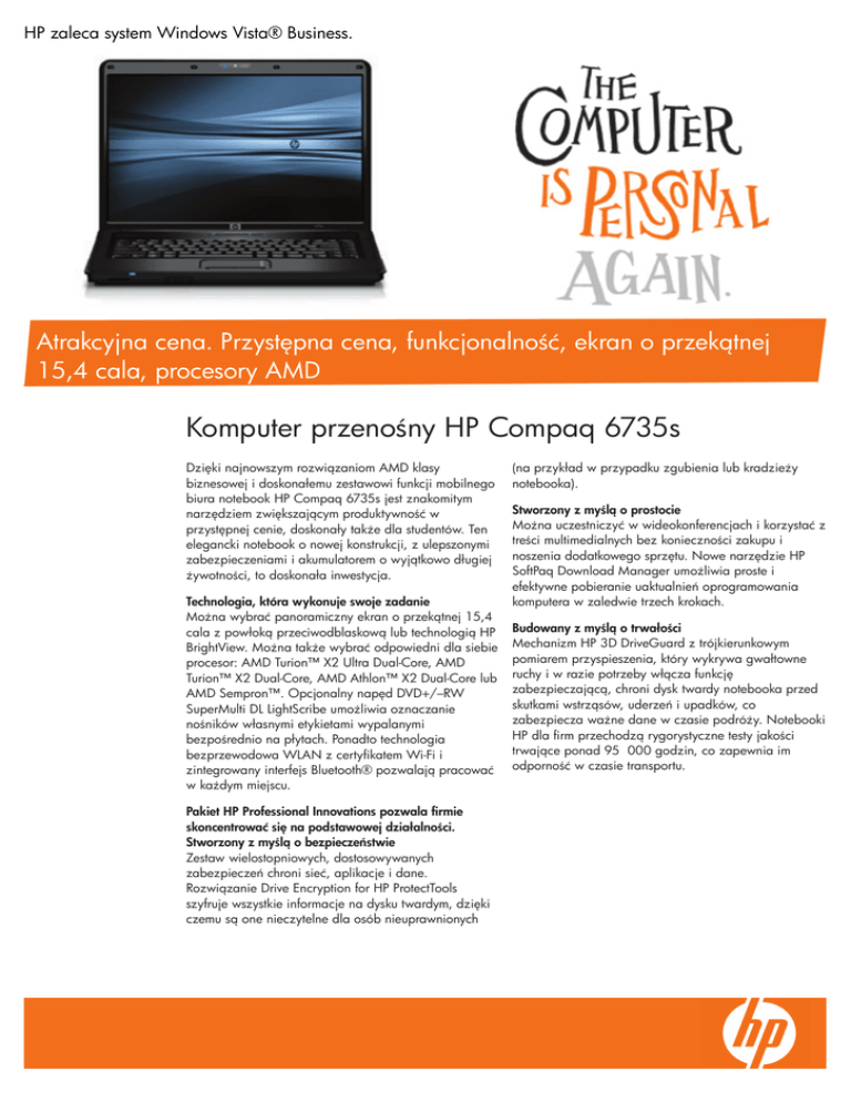 HP zaleca system Windows Vista® Business. Atrakcyjna cena. Przystępna cena, funkcjonalność, ekran o przekątnej 15,4 cala, procesory AMD Komputer przenośny HP Compaq 6735s Dzięki najnowszym rozwiązaniom AMD klasy biznesowej i doskonałemu zestawowi funkcji mobilnego biura notebook HP Compaq 6735s jest znakomitym narzędziem zwiększającym produktywność w przystępnej cenie, doskonały także dla studentów. Ten elegancki notebook o nowej konstrukcji, z ulepszonymi zabezpieczeniami i akumulatorem o wyjątkowo długiej żywotności, to doskonała inwestycja. Technologia, która wykonuje swoje zadanie Można wybrać panoramiczny ekran o przekątnej 15,4 cala z powłoką przeciwodblaskową lub technologią HP BrightView. Można także wybrać odpowiedni dla siebie procesor: AMD Turion™ X2 Ultra Dual-Core, AMD Turion™ X2 Dual-Core, AMD Athlon™ X2 Dual-Core lub AMD Sempron™. Opcjonalny napęd DVD+/–RW SuperMulti DL LightScribe umożliwia oznaczanie nośników własnymi etykietami wypalanymi bezpośrednio na płytach. Ponadto technologia bezprzewodowa WLAN z certyfikatem Wi-Fi i zintegrowany interfejs Bluetooth® pozwalają pracować w każdym miejscu. Pakiet HP Professional Innovations pozwala firmie skoncentrować się na podstawowej działalności. Stworzony z myślą o bezpieczeństwie Zestaw wielostopniowych, dostosowywanych zabezpieczeń chroni sieć, aplikacje i dane. Rozwiązanie Drive Encryption for HP ProtectTools szyfruje wszystkie informacje na dysku twardym, dzięki czemu są one nieczytelne dla osób nieuprawnionych (na przykład w przypadku zgubienia lub kradzieży notebooka). Stworzony z myślą o prostocie Można uczestniczyć w wideokonferencjach i korzystać z treści multimedialnych bez konieczności zakupu i noszenia dodatkowego sprzętu. Nowe narzędzie HP SoftPaq Download Manager umożliwia proste i efektywne pobieranie uaktualnień oprogramowania komputera w zaledwie trzech krokach. Budowany z myślą o trwałości Mechanizm HP 3D DriveGuard z trójkierunkowym pomiarem przyspieszenia, który wykrywa gwałtowne ruchy i w razie potrzeby włącza funkcję zabezpieczającą, chroni dysk twardy notebooka przed skutkami wstrząsów, uderzeń i upadków, co zabezpiecza ważne dane w czasie podróży. Notebooki HP dla firm przechodzą rygorystyczne testy jakości trwające ponad 95 000 godzin, co zapewnia im odporność w czasie transportu. Komputer przenośny HP Compaq 6735s HP zaleca system Windows Vista® Business. System operacyjny Oryginalny Windows Vista® Business 32-bitowy Oryginalny Windows Vista® Home Basic 32-bitowy Oryginalny Windows Vista® Home Premium (32-bitowy) FreeDOS System Red Flag Linux (może być różny w zależności od kraju) Procesor AMD Turion™ X2 Ultra Dual-Core ZM-82 / ZM-84 (do 2,3 GHz, 2 MB pamięci podręcznej L2), AMD Turion™ X2 Dual-Core RM-70 / RM-72 (do 2,1 GHz, 1 MB pamięci podręcznej L2), AMD Athlon™ X2 Dual-Core QL-62 (do 2,0 GHz, 1 MB pamięci podręcznej L2) lub AMD Sempron SI-42 (do 2,1 GHz, 512 KB pamięci podręcznej L2) Zestaw układów Zestaw układów AMD M780G Pamięć DDR2, 800 MHz, 1024, 2048 lub 4096 MB; 2 gniazda SODIMM z obsługą pamięci dwukanałowej; Możliwość rozszerzenia do 8192 MB Oprogramowanie HP Recovery Manager, HP SoftPaq Download Manager, Roxio Creator Business 10, Microsoft® Office 2007 Ready (60-dniowa wersja próbna) Dysk twardy Dysk twardy Serial ATA 160, 250 lub 320 GB (5400 obr./min), HP 3D DriveGuard Urządzenie optyczne Napęd DVD+/–RW SuperMulti DL LightScribe Wyświetlacz 15,4" WXGA (rozdzielczość 1280x800) lub 15,4" WXGA z technologią BrightView (rozdzielczość 1280x800), możliwość korzystania z połączeń głosowych (VoIP) — opcjonalna kamera internetowa VGA z wbudowanym mikrofonem Grafika ATI Radeon™ HD 3200 Wymiary (szer. x głęb. x wys.) 3,2 (z przodu) x 35,8 x 26,7 cm Waga Od 2,5 kg Zasilanie 6-ogniwowy (47 Wh) lub 8-ogniwowy (63 Wh) akumulator litowy; Zasilacz zewnętrzny HP Smart 65 W, technologia HP Fast Charge Czas pracy akumulatora Maks. 3 godz. (maks. 7 godz. 45 min z akumulatorem HP Extended Life, maks. 11 godz. 20 min z akumulatorem HP Ultra-Capacity) Karta dźwiękowa Dźwięk High Definition, głośniki stereo, wyjście słuchawek stereo/wyjście sygnałowe audio (line out), wejście mikrofonu stereo, wbudowany mikrofon Obsługa komunikacji bezprzewodowej Komunikacja Broadcom 802,11 a/b/g/draft-n (draft-n nie jest dostępny w Rosji), Broadcom 802.11b/g, opcjonalnie Bluetooth® 2.0, HP Wireless Assistant Gniazda rozszerzeń Dostępne gniazda urządzeń dodatkowych: jedno gniazdo na kartę ExpressCard/54, czytnik kart pamięci I/O porty i zlacza 4 porty USB 2.0, VGA, wejście mikrofonu stereo, wyjście słuchawek stereo/wyjście sygnałowe audio, złącze zasilania, RJ-11, RJ-45 Klawiatura Pełnowymiarowa klawiatura Urządzenie wskazujące Tabliczka dotykowa z przewijaniem Bezpieczeństwo HP ProtectTools, Enhanced Drive Lock, Enhanced Pre-Boot Security, Drive Encryption for HP ProtectTools, HP Spare Key, HP Disk Sanitizer Blokada Kensington, McAfee Security Solution (opcja) Gwarancja Roczna gwarancja z naprawą w punkcie serwisowym, w niektórych krajach z odbiorem i zwrotem do klienta (dostępne są rozszerzenia gwarancji sprzedawane oddzielnie), roczna gwarancja na akumulator podstawowy Modem 56 Kb/s; Marvell Ethernet PCI Controller (karta sieciowa 10/100) Więcej informacji można znaleźć na stronie HP z zastrzeżeniami pod adresem www.hp.eu/disclaimer © 2008 Hewlett-Packard Development Company L.P. Niniejsze informacje mogą ulec zmianie bez powiadomienia. Jedyne gwarancje, jakich HP udziela na produkty i usługi, są określone w oświadczeniach gwarancyjnych dostarczanych wraz z takimi produktami i usługami. Żaden zapis niniejszego dokumentu nie może być uważany za dodatkową gwarancję. HP nie ponosi odpowiedzialności za błędy techniczne lub redakcyjne oraz braki występujące w niniejszym dokumencie. Niektóre funkcje syste