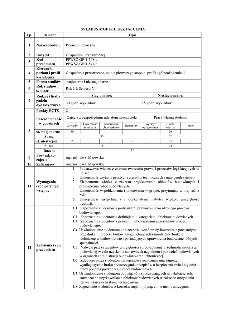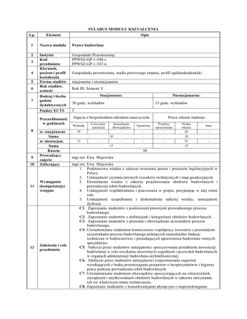 SYLABUS MODUŁU KSZTAŁCENIA Lp. Element 1 Nazwa modułu Prawo budowlane 2 Instytut Kod przedmiotu Kierunek, poziom i profil kształcenia Forma studiów Rok studiów, semestr Rodzaj i liczba godzin dydaktycznych Punkty ECTS Gospodarki Przestrzennej PPWSZ-GP-1-548-s PPWSZ-GP-1-547-n 3 4 5 6 7 Pracochłonność w godzinach 8 9 10 st. stacjonarne Suma st. niestacjon. Suma Razem Prowadzący zajęcia Zaliczający 11 Wymagania (kompetencje) wstępne 12 Założenia i cele przedmiotu Opis Gospodarka przestrzenna, studia pierwszego stopnia, profil ogólnoakademicki stacjonarne i niestacjonarne Rok III, Semestr V Stacjonarne: Niestacjonarne: 30 godz. wykładów 15 godz. wykładów 2 Zajęcia z bezpośrednim udziałem nauczyciela Wykłady 30 Ćwiczenia/ seminaria - Konsultacje obowiązkowe - Egzaminy - Praca własna studenta Projekty/ opracowania - 30 15 - Nauka własna 20 Inne - 20 - - 15 - 35 - 35 50 mgr inż. Ewa Majewska mgr inż. Ewa Majewska 1. Podstawowa wiedza z zakresu tworzenia prawa i procesów legislacyjnych w Polsce. 2. Umiejętność czytania prostych rysunków technicznych i map geodezyjnych. 3. Elementarna wiedza z zakresu projektowania obiektów budowlanych i prowadzenia robót budowlanych. 4. Umiejętność współdziałania i pracowania w grupie, przyjmując w niej różne role. 5. Umiejętność uzupełniania i doskonalenia nabytej wiedzy, umiejętność dyskusji. C1. Zapoznanie studentów z podstawami prawnymi prowadzonego procesu budowlanego. C2. Zapoznanie studentów z definicjami i kategoriami obiektów budowlanych. C3. Zapoznanie studentów z prawami i obowiązkami uczestników procesu budowlanego. C4. Uświadomienie studentom konieczności współpracy inwestora z pozostałymi uczestnikami procesu budowlanego pełniących samodzielne funkcje techniczne w budownictwie i posiadających uprawnienia budowlane różnych specjalności. C5. Nabycie przez studentów umiejętności sprecyzowania przedmiotu inwestycji budowlanej w celu uzyskania stosownych uzgodnień i pozwoleń budowlanych w organach administracji budowlano-architektonicznej. C6. Zdobycie przez studentów umiejętności rozpoznawania zagrożeń wynikających z braku przestrzegania przepisów o bezpieczeństwie i higienie pracy podczas prowadzenia robót budowlanych. C7. Uświadomienie studentom obowiązków spoczywających na właścicielach, zarządcach i użytkownikach obiektów budowlanych w zakresie utrzymania ich we właściwym stanie technicznym. C8. Zapoznanie studentów z konsekwencjami płynącymi z nieprzestrzegania przepisów wynikających z ustawy Prawo budowlane. Odniesienie do Efekt (Wiedza, Umiejętności, Kompetencje efektów społeczne) kierunkowych WIEDZA Odniesienie do efektów obszarowych Definiuje, wymienia, opisuje poszczególne kategorie obiektów budowlanych. GP_W15 InzA_W01 P1A_W08 T1A_W06 Rozróżnia uprawnienia budowlane poszczególnych specjalności posiadane przez osoby pełniące samodzielne funkcje techniczne w budownictwie. GP_W13 InzA_W02 InzA_W05 T1A_W06 GP_U15 T1A_U14 T1A_U15 InzA_U06 InzA_U07 P1A_U03 P1A_U07 UMIEJĘTNOŚCI Rozwiązuje proste zagadnienia inżynierskie stanowiące podstawę uruchomienia procesu inwestycyjnego. 13 Efekty kształcenia Potrafi odróżnić obiekty i roboty budowlane, których realizacja wymaga uzyskania przez inwestora decyzji o pozwoleniu na budowę od obiektów i robót budowlanych nie wymagających uzyskania pozwolenia na budowę, lecz dokonania skutecznego zgłoszenia w organach administracji budowlanoarchitektonicznej. GP_U01 Potrafi określić krąg osób i wykaz instytucji koniecznych do wdrożenia, przeprowadzenia i zakończenia procesu budowlanego. GP_U13 S1A_U01 S1A_U02 T1A_U01 T1A_U13 InzA_U05 InzA_U04 S1A_U08 T1A_U12 KOMPETENCJE SPOŁECZNE Student wie w jaki sposób samodzielnie pozyskać konieczne dokumenty formalno-prawne i jak wypełnić wnioski do organów administracji budowlano-architektonicznej. Efekt kształcenia WIEDZA WIEDZA 14 Forma i warunki potwierdzenia efektu kształcenia UMIEJĘTNOŚCI UMIEJĘTNOŚCI UMIEJĘTNOŚCI KOMPETENCJE SPOŁECZNE GP_K04 S1A_K06 T1A_K01 Sposób potwierdzenia (weryfikacji) Student definiuje, wymienia, opisuje poszczególne kategorie obiektów budowlanych. Student rozróżnia uprawnienia budowlane poszczególnych specjalności posiadane przez osoby pełniące samodzielne funkcje techniczne w budownictwie. Student rozwiązuje proste zagadnienia inżynierskie stanowiące podstawę uruchomienia procesu inwestycyjnego. Student potrafi odróżnić obiekty i roboty budowlane, których realizacja wymaga uzyskania przez inwestora decyzji o pozwoleniu na budowę od obiektów i robót budowlanych nie wymagających uzyskania pozwolenia na budowę lecz dokonania skutecznego zgłoszenia w organach administracji budowlano-architektonicznej. Student potrafi określić krąg osób i wykaz instytucji koniecznych do wdrożenia, przeprowadzenia i zakończenia procesu budowlanego. Student wie w jaki sposób samodzielnie pozyskać konieczne dokumenty formalnoprawne i jak wypełnić wnioski do organów administracji budowlano-architektonicznej. Stosowane metody dydaktyczne wykład z wykorzystaniem prezentacji multimedialnej, wykład informacyjny, wykład problemowy, dyskusja 16 Treści merytoryczne przedmiotu Rys historyczny Prawa budowlanego w Polsce. Definicje i kategorie obiektów budowlanych. Samodzielne funkcje techniczne w budownictwie, proces zdobywania uprawnień budowlanych w Polsce, omówienie roli samorządu zawodowego – okręgowe izby inżynierów budownictwa. Prawa i obowiązki uczestników procesu budowlanego (inwestor, inspektor nadzoru inwestorskiego, projektant, kierownik budowy lub kierownik robót). Postępowanie poprzedzające rozpoczęcie robót budowlanych (sporządzenie projektu budowlanego, procedura uzyskiwania pozwolenia na budowę, obiekty wyłączone z obowiązku uzyskania decyzji o pozwoleniu na budowę). Budowa i oddawanie do użytkowania obiektów budowlanych. Konsekwencje prowadzenia robót 