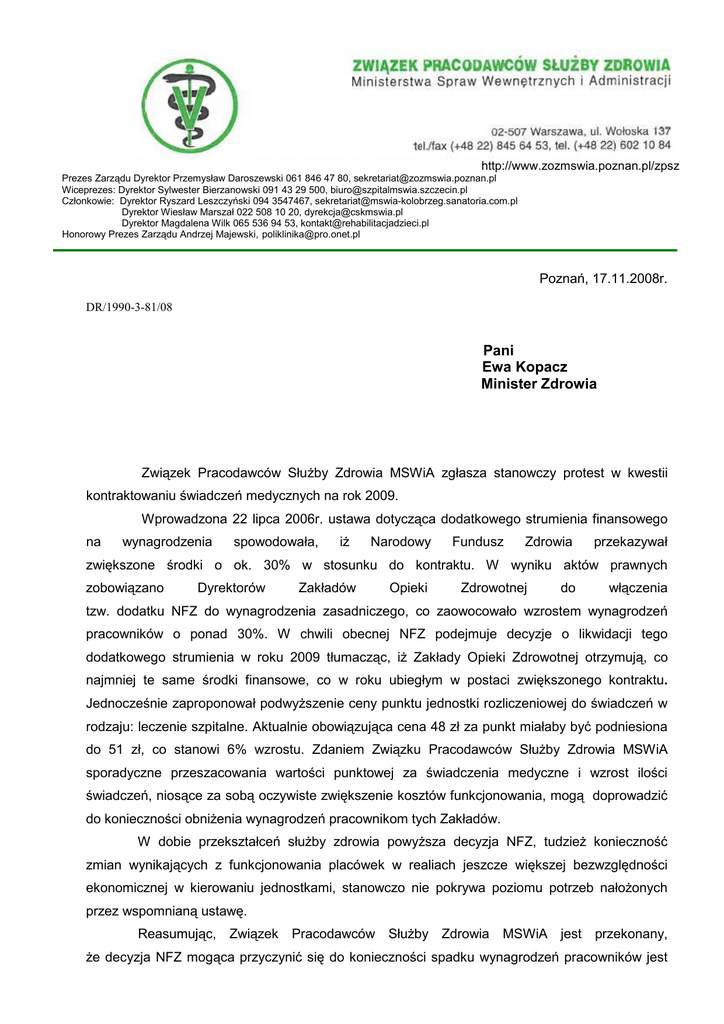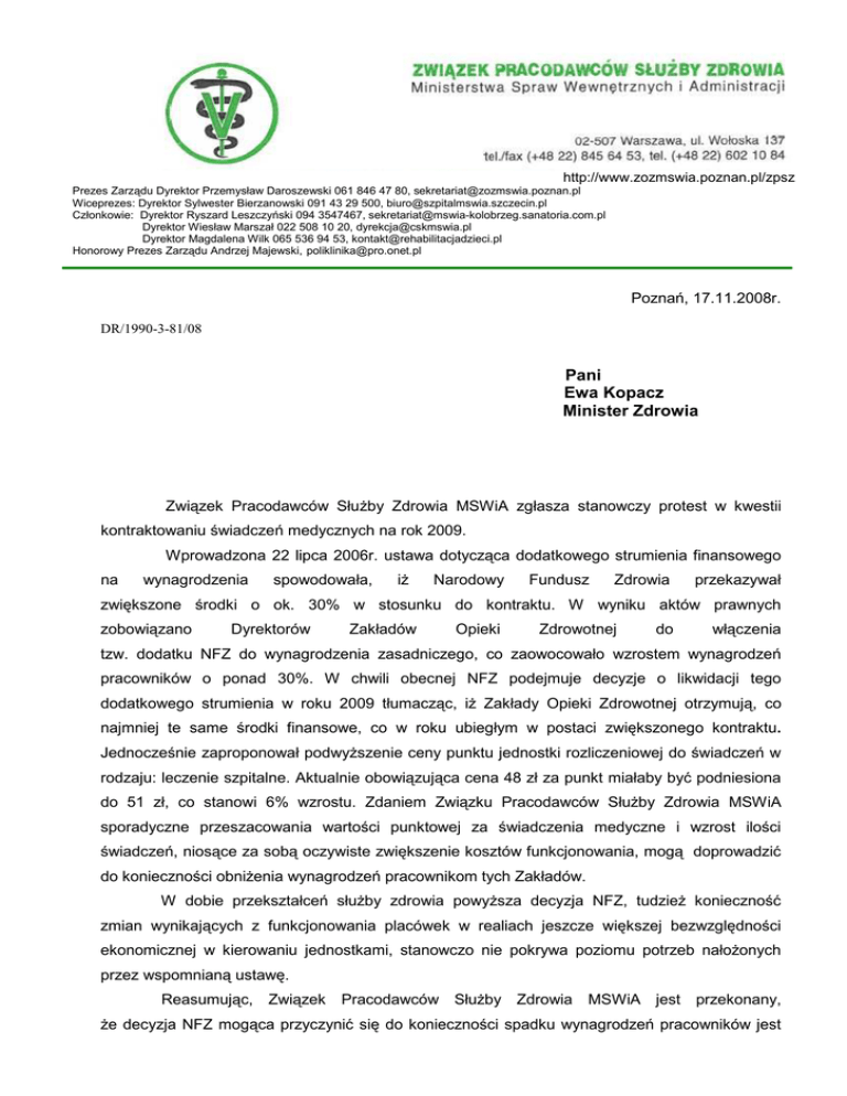 http://www.zozmswia.poznan.pl/zpsz Prezes Zarządu Dyrektor Przemysław Daroszewski 061 846 47 80, [email protected] Wiceprezes: Dyrektor Sylwester Bierzanowski 091 43 29 500, [email protected] Członkowie: Dyrektor Ryszard Leszczyński 094 3547467, [email protected] Dyrektor Wiesław Marszał 022 508 10 20, [email protected] Dyrektor Magdalena Wilk 065 536 94 53, [email protected] Honorowy Prezes Zarządu Andrzej Majewski, [email protected] Poznań, 17.11.2008r. DR/1990-3-81/08 Pani Ewa Kopacz Minister Zdrowia Związek Pracodawców SłuŜby Zdrowia MSWiA zgłasza stanowczy protest w kwestii kontraktowaniu świadczeń medycznych na rok 2009. Wprowadzona 22 lipca 2006r. ustawa dotycząca dodatkowego strumienia finansowego na wynagrodzenia spowodowała, iŜ Narodowy Fundusz Zdrowia przekazywał zwiększone środki o ok. 30% w stosunku do kontraktu. W wyniku aktów prawnych zobowiązano Dyrektorów Zakładów Opieki Zdrowotnej do włączenia tzw. dodatku NFZ do wynagrodzenia zasadniczego, co zaowocowało wzrostem wynagrodzeń pracowników o ponad 30%. W chwili obecnej NFZ podejmuje decyzje o likwidacji tego dodatkowego strumienia w roku 2009 tłumacząc, iŜ Zakłady Opieki Zdrowotnej otrzymują, co najmniej te same środki finansowe, co w roku ubiegłym w postaci zwiększonego kontraktu. Jednocześnie zaproponował podwyŜszenie ceny punktu jednostki rozliczeniowej do świadczeń w rodzaju: leczenie szpitalne. Aktualnie obowiązująca cena 48 zł za punkt miałaby być podniesiona do 51 zł, co stanowi 6% wzrostu. Zdaniem Związku Pracodawców SłuŜby Zdrowia MSWiA sporadyczne przeszacowania wartości punktowej za świadczenia medyczne i wzrost ilości świadczeń, niosące za sobą oczywiste zwiększenie kosztów funkcjonowania, mogą doprowadzić do konieczności obniŜenia wynagrodzeń pracownikom tych Zakładów. W dobie przekształceń słuŜby zdrowia powyŜsza decyzja NFZ, tudzieŜ konieczność zmian wynikających z funkcjonowania placówek w realiach jeszcze większej bezwzględności ekonomicznej w kierowaniu jednostkami, stanowczo nie pokrywa poziomu potrzeb nałoŜonych przez wspomnianą ustawę. Reasumując, Związek Pracodawców SłuŜby Zdrowia MSWiA jest przekonany, Ŝe decyzja NFZ mogąca przyczynić się do konieczności spadku wynagrodzeń pracowników jest dalece niesłuszna. Konsekwencja tego posunięcia niechybnie doprowadziłaby do niepokojów społecznych i pogorszenia jakości świadczonych usług medycznych. Według skrupulatnych wyliczeń w przypadku likwidacji wyodrębnionego strumienia środków finansowych na wynagrodzenia cena punktu jednostki rozliczeniowej powinna mieścić się w wartościach ok.60 zł. W związku z powyŜszymi argumentami Związek Pracodawców SłuŜby Zdrowia MSWiA zwraca się do Pani Minister jak na wstępie, informując równieŜ, iŜ pismo dotyczące tych problemów zostało przekazane na ręce Pana Ministra Tomasza Siemoniaka oraz Pani Dyrektor Ireny Waleckiej - Herniczek. Wyk. w 3 egz. oraz a/a Egz. nr 1. Tomasz Siemoniak Sekretarz Stanu MSWiA Egz. nr 2. Ewa Kopacz Minister Zdrowia Egz. nr 3. Irena Walecka – Herniczek Dyrektor Departamentu Zdrowia MSWiA Oprac.: E. Fidyka tel. 061 8464 702