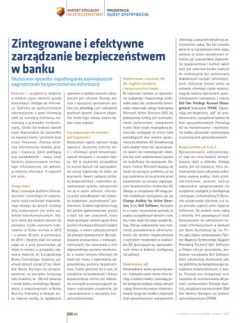 RAPORT SPECJALNY PREZENTACJA BEZPIECZEŃSTWO QUEST DYSTRYBUCJA Zintegrowane i efektywne zarządzanie bezpieczeństwem w banku Skuteczne sposoby zapobiegania największym zagrożeniom bezpieczeństwa informacji Internet i urządzenia mobilne w krótkim czasie zmieniły sposób komunikacji i dostępu do informacji. Staliśmy się społeczeństwem informacyjnym, a sama informacja stała się wartością biznesową stanowiącą o przewadze konkurencyjnej. Utrata lub kradzież danych może doprowadzić do uszczerbku na reputacji banku i przynieść duże straty finansowe. Złożona struktura informatyczna banków, przepisy i regulacje, jakim podlegają oraz paradoksalnie – nowe, coraz bardziej zaawansowane technologie informatyczne, nie ułatwiają ochrony informacji. A zagrożeń jest wiele… Uwaga haker Wraz z rozwojem platform informatycznych i technologii ich wykorzystania rosną możliwości niepowołanego dostępu do danych. Każdego dnia atakowanych jest wiele systemów teleinformatycznych, których celem jest kradzież danych lub pieniędzy. Liczba wykrytych cyberataków w Polsce wzrosła w 2015 r. o prawie 50 proc. w porównaniu do 2014 r. Niestety ataki nie zawsze udaje się w porę powstrzymać, jak miało to miejsce w przypadku włamania hakerów do Europejskiego Banku Centralnego, kradzieży poufnych danych ponad 27 tys. klientów Banku Barclays czy przeprowadzonej na początku bieżącego roku kradzieży ok. 100 mln dolarów z konta banku centralnego Bangladeszu, a zdeponowanych w Banku Rezerwy Federalnej w Nowym Jorku. Hakerzy wiedzą, że najsłabszym ogniwem w każdym systemie zabezpieczeń jest człowiek. Dlatego jednym z najczęściej spotykanych ataków jest phishing, czyli wyłudzenie poufnych danych. Zdaniem ekspertów liczba tego rodzaju ataków będzie coraz większa. Czy organizacja od wewnątrz jest bezpieczna? Nowoczesne zapory ogniowe mogą zapewnić skuteczną ochronę sieci i informacji przed nieautoryzowanym dostępem z zewnątrz banku. Ale w większości przypadków za wyciek danych lub wprowadzenie wirusa odpowiada nie haker, ale pracownik. Nawet najlepsza polityka bezpieczeństwa i najbardziej zaawansowane systemy zabezpieczeń nie są w stanie ochronić informacji przed zaniedbaniami lub celowymi działaniami „wywrotowymi” pracowników. Źródłem zagrożenia mogą być portale społecznościowe, poczta e-mail lub sam pracownik, który może przekazać osobom spoza firmy poufne informacje o klientach, kodach dostępu, a nawet zabezpieczeniach lub planach strategicznych. Bez edukowania pracowników o niebezpieczeństwach, bez stworzenia u nich odpowiedniego poziomu świadomości w kwestii ochrony informacji nie może być mowy o zapewnieniu odpowiedniego poziomu bezpieczeństwa. Trzeba pamiętać też o tym, że niezależnie od świadomości i kultury bezpieczeństwa istotne jest wdrożenie rozwiązań automatyzujących zarówno wykrywanie incydentów, jak i powiadamianie o naruszeniu bezpieczeństwa banku. 60 Niedoceniane znaczenie AD dla ciągłości działania i bezpieczeństwa banku W większości banków za zapewnienie wydajnego i bezpiecznego środowiska pracy dla użytkownika końcowego odpowiada usługa katalogowa Microsoft Active Directory (AD). Jej podstawową funkcją jest uwierzytelnianie użytkowników i komputerów w sieci. Duże ryzyko niepożądanej aktywności występuje ze strony osób posiadających zbyt wysokie uprawnienia do obiektów AD. Konsekwencją tych działań może być spowodowanie awarii lub niedostępności obiektów (np. kont użytkowników) poprzez ich modyfikacje lub skasowanie. Natywne funkcje Microsoft skupiają się raczej na usunięciu problemu już po jego zaistnieniu niż na ochronie przed pojawieniem się sytuacji zagrażających bezpieczeństwu środowiska AD. Dlatego w zarządzaniu AD mogą pomóc dodatkowe rozwiązania, jak np. Change Auditor for Active Directory firmy Dell Software. Narzędzie to w czasie rzeczywistym pozwala na analizę szczegółowych danych o tym, kto, kiedy, skąd i do czego uzyskał dostęp. Oferuje audytowanie oraz możliwość powiadamiania administratorów lub działów bezpieczeństwa o wykrytych incydentach w środowisku AD, dotyczących np. wprowadzonych zmian w domenie, konfiguracji lub aplikacji. Elektroniczny sejf Niezarządzane konta uprzywilejowane – niezwykle ważne konta, które istnieją w każdym banku i posiadają pełen dostęp do każdego rodzaju danych i usług. Niemonitorowane i niekontrolowane mogą być źródłem znacznych strat spowodowanych wykradzeniem informacji, usunięciem danych czy zatrzymaniem usług. Nie bez powodu konta te są najczęstszym celem ataku, zarówno ze strony zewnętrznych intruzów, jak i pracowników. Zapewnienie bezpieczeństwa i kontroli takich kont jest zadaniem bardzo trudnym do zrealizowania bez zastosowania dodatkowych narzędzi informatycznych. Instytucje, którym zależy na ochronie informacji często wykorzystują do nadzoru nad kontami uprzywilejowanymi rozwiązania z rodziny Dell One Privilege Account Management (nazywane TPAM). Zapewniają one bezpieczny „sejf” do przechowywania i zarządzania hasłami do kont uprzywilejowanych. Pozwalają też na monitorowanie i rejestrowanie każdej aktywności wykonywanej za pomocą kont uprzywilejowanych. Bezpieczeństwo od A do Z Oprogramowanie zabezpieczające staje się coraz bardziej skomplikowane, także w obsłudze. Dlatego ważny jest też dostawca, który pomoże przejść przez cały proces wdrożenia: wykona analizy i testy przedwdrożeniowe, pomoże wybrać odpowiednie oprogramowanie czy urządzenie, następnie je skonfiguruje i zintegruje z infrastrukturą IT. Na koniec przeprowadzi szkolenie, a w razie potrzeby zapewni pełne wsparcie techniczne. Na polskim rynku jedną z niewielu firm posiadających duże doświadczenie we wdrożeniach narzędzi informatycznych w bankach jest Quest Dystrybucja Sp. o.o. Firma jako jedyny autoryzowany Partner Wsparcia Technicznego (Suppo