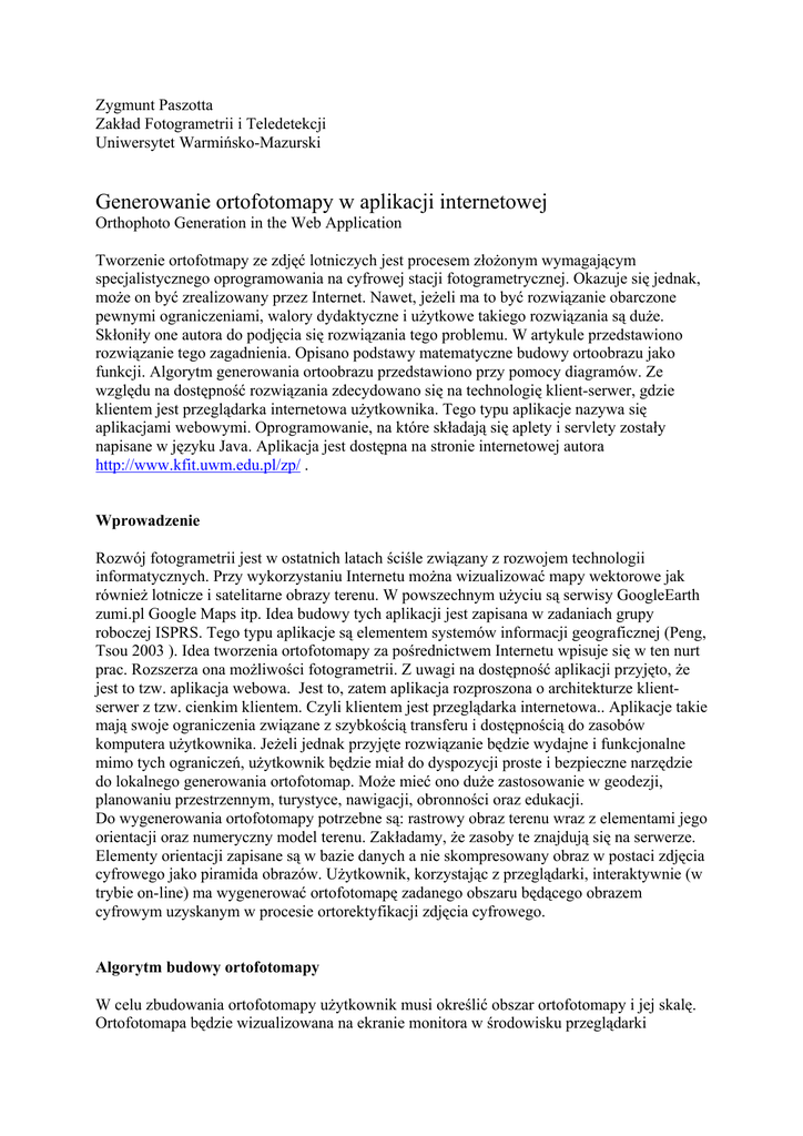 Zygmunt Paszotta Zakład Fotogrametrii i Teledetekcji Uniwersytet Warmińsko-Mazurski Generowanie ortofotomapy w aplikacji internetowej Orthophoto Generation in the Web Application Tworzenie ortofotmapy ze zdjęć lotniczych jest procesem złożonym wymagającym specjalistycznego oprogramowania na cyfrowej stacji fotogrametrycznej. Okazuje się jednak, może on być zrealizowany przez Internet. Nawet, jeżeli ma to być rozwiązanie obarczone pewnymi ograniczeniami, walory dydaktyczne i użytkowe takiego rozwiązania są duże. Skłoniły one autora do podjęcia się rozwiązania tego problemu. W artykule przedstawiono rozwiązanie tego zagadnienia. Opisano podstawy matematyczne budowy ortoobrazu jako funkcji. Algorytm generowania ortoobrazu przedstawiono przy pomocy diagramów. Ze względu na dostępność rozwiązania zdecydowano się na technologię klient-serwer, gdzie klientem jest przeglądarka internetowa użytkownika. Tego typu aplikacje nazywa się aplikacjami webowymi. Oprogramowanie, na które składają się aplety i servlety zostały napisane w języku Java. Aplikacja jest dostępna na stronie internetowej autora http://www.kfit.uwm.edu.pl/zp/ . Wprowadzenie Rozwój fotogrametrii jest w ostatnich latach ściśle związany z rozwojem technologii informatycznych. Przy wykorzystaniu Internetu można wizualizować mapy wektorowe jak również lotnicze i satelitarne obrazy terenu. W powszechnym użyciu są serwisy GoogleEarth zumi.pl Google Maps itp. Idea budowy tych aplikacji jest zapisana w zadaniach grupy roboczej ISPRS. Tego typu aplikacje są elementem systemów informacji geograficznej (Peng, Tsou 2003 ). Idea tworzenia ortofotomapy za pośrednictwem Internetu wpisuje się w ten nurt prac. Rozszerza ona możliwości fotogrametrii. Z uwagi na dostępność aplikacji przyjęto, że jest to tzw. aplikacja webowa. Jest to, zatem aplikacja rozproszona o architekturze klientserwer z tzw. cienkim klientem. Czyli klientem jest przeglądarka internetowa.. Aplikacje takie mają swoje ograniczenia związane z szybkością transferu i dostępnością do zasobów komputera użytkownika. Jeżeli jednak przyjęte rozwiązanie będzie wydajne i funkcjonalne mimo tych ograniczeń, użytkownik będzie miał do dyspozycji proste i bezpieczne narzędzie do lokalnego generowania ortofotomap. Może mieć ono duże zastosowanie w geodezji, planowaniu przestrzennym, turystyce, nawigacji, obronności oraz edukacji. Do wygenerowania ortofotomapy potrzebne są: rastrowy obraz terenu wraz z elementami jego orientacji oraz numeryczny model terenu. Zakładamy, że zasoby te znajdują się na serwerze. Elementy orientacji zapisane są w bazie danych a nie skompresowany obraz w postaci zdjęcia cyfrowego jako piramida obrazów. Użytkownik, korzystając z przeglądarki, interaktywnie (w trybie on-line) ma wygenerować ortofotomapę zadanego obszaru będącego obrazem cyfrowym uzyskanym w procesie ortorektyfikacji zdjęcia cyfrowego. Algorytm budowy ortofotomapy W celu zbudowania ortofotomapy użytkownik musi określić obszar ortofotomapy i jej skalę. Ortofotomapa będzie wizualizowana na ekranie monitora w środowisku przeglądarki internetowej. Ponadto ortorektyfikacja na serwerze, kompresja oraz przesłanie adresu do pobrania ortoobrazu ma być wykonane w trakcie jednego połączenia z klientem. Z tego względu oraz z powodu szybkości transmisji ortofotomapa powinna zmieścić się na ekranie monitora. W chwili określenia stereogramu zwracane są z serwera elementy orientacji zdjęć, co pozwala nałożyć w sposób przybliżony siatkę układu współrzędnych terenowych. Siatkę tę nakładamy na lewe zdjęcie obliczone są także przybliżone współrzędne terenowe punktu wskazywanego przez kursor (rys. 1.). Rys.1 Wybrany obszar generowania ortofotomapy. Przyjmiemy, że numeryczny model terenu nie jest znany, dlatego potrzebny jest stereogram zdjęć. Proces budowy ortoofotomapy będzie przebiegał jak na rysunku 2. Klient Server Użytkownik Wybór parametrów Wybór stereogramu zdjęć, obszaru i skali ortoobrazu Wybór punktu startowych punktów homologicznych Wybór punktów do wyznaczenia płaszczyzny Z=Z(X,Y) Automatyczne spasowanie otoczeń pikseli w obszarze Obliczenie współrzędnych terenowych punktów Budowa NMT Wyznaczenie równania płaszczyzny Ortorektyfikacja Wizualizacja ortoobrazu Transformacja do formatu JPEG Zapis w formacie BMP Budowa i nałożenie siatki układu współrzędnych Generowanie ortofotomapy Rys. 2. Diagram budowy ortofotomapy Budowa uproszczonego numerycznego modelu terenu Po zadaniu początkowej pary punktów homologicznych spasowanie pozostałych otoczeń pikseli przebiega automatycznie (Paszotta 2003). Miarą podobieństwa obrazów jest współczynnik korelacji między obrazami. Kolory pikseli przekształcane są na poziomy szarości. Użytkownik określa wartość progową współczynnika korelacji, wielkość spasowywanych otoczeń oraz zakres zmiany współrzędnej pikselowej x na prawym obrazie. Ze względu na mały obszar ortofotomapy model terenu aproksymuje się płaszczyzną o równaniu Z = AX + BY + C Parametry tej płaszczyzny estymuje się metodą najmniejszych kwadratów. Punkty wybierane są przez użytkownika przez określenie wagi równej 1. Zgodność między automatycznymi pomiarami współrzędnej Z a przyjętym modelem przez oceniana przez obliczenie RMS. Posłuży on dalej do określania błędu położenia punktów na ortofotomapie. Metoda aproksymacji NMT nie jest istotą przedstawianej metody budowy ortofotomapy. Można korzystać z gotowego modelu lub przyjąć inną metodę budowy NMT. Rys. 3. Rozmieszczenie punktów matchingu. Rys. 4. Wybór punktów i aproksymacja płaszczyzną. Generowanie ortofotomapy Parametry do generowania ortofotomapyna serwerze pobierane są z kilku źródeł: elementy orientacji zdjęć z bazy danych, fragmenty zdjęcia ze zbioru graficznego na serwerze, pozostałe dane-parametry ortofotomapy od klienta. Ort