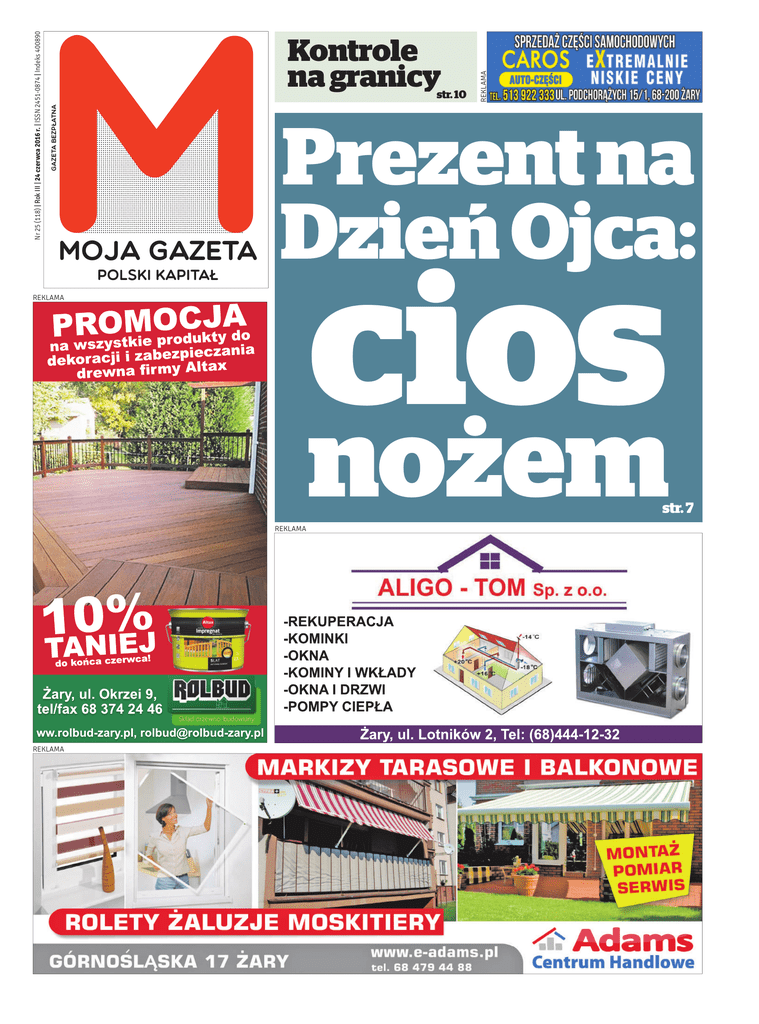 GAZETA BEZPŁATNA MOJA GAZETA POLSKI KAPITAŁ str. 10 Prezent na Dzień Ojca: cios A J C O M O R P dukty do na wszystkie pro REKLAMA zpieczania dekoracji i zabey Altax drewna firm YNKU! R A N Ć Ś O gi NOW tarzanej podło Imitacja pos Pinia Mountain k047 % 0 1 TANIEJ nożem str. 7 REKLAMA Dąb Main k056 ca! do końca czerw Żary, ul. Okrzei 9, tel/fax 68 374 24 46 ww.rolbud-zary.pl, [email protected] REKLAMA REKLAMA Nr 25 (118) | Rok III | 24 czerwca 2016 r. | ISSN 2451-0874 | Indeks 400890 M Kontrole na granicy -REKUPERACJA -KOMINKI -OKNA -KOMINY I WKŁADY -OKNA I DRZWI -POMPY CIEPŁA Żary, ul. Lotników 2, Tel: (68)444-12-32 2 OPINIE KOMENTARZE 24 czerwca 2016 Doniesienia medialne to woda na młyn dowcipnisiów podinsp. Sylwia Woroniec Oficer Prasowy Komendy Powiatowej Policji w Żaganiu Piątek 24 czerwca 34° MojaGazeta SO ND PN WT ŚR CZ 33° 23° 24° 21° 25° 27° 18° 20° 11° 15° 7° 10° Krezus i ubogi krewny REGION Burmistrzowie Żar i Żagania nie powinni narzekać. Zarówno Danuta Madej jak i Daniel Marchewka nie muszą martwić się o lekarza, zapłacenie rachunków i ogrzewanie na zimę. Burmistrz Żar ma odłożoną na czarną godzinę niezłą sumę. Uciułała już przeszło 223 tysiące. To pozwoli spokojnie patrzeć w przyszłość. Tylko w ostatnim roku ta kwota powiększyła się o kilkadziesiąt tysięcy. Co ciekawe, burmistrz Madej nie posiada żadnych zobowiązań wobec banków. Wieloletnie piastowanie stanowisk w samorządzie przyniosło efekty. Było z czego odkładać. Kredyty widocznie nie były potrzebne. W ostatnim roku pieniądze też było z czego odłożyć. Danuta Madej zarobiła blisko 154 tysiące. To jednak nie cały majątek, bo oprócz domu i dwóch samochodów, burmistrz posiada działki o sporej wartości. Nie licząc tej pod domem, to zadeklarowana wartość pozostałych wynosi ok. 37 tysięcy. To też kapitał, który można spieniężyć. Na tle danuty Madej dorobek Daniela Marchewki wypada blado. Do skarpety odłożył „tylko” 13 tysięcy. I to pomimo tego, że zarobił blisko 144 tysiące., co dla przeciętnego mieszkańca Żagania jest kwotą wręcz kosmiczną. Brak oszczędności nie jest raczej wynikiem rozrzutnego trybu życia żagańskiego burmistrza. Powód wydaje się być bardzo prozaiczny. Marchewka ma spore zobowiązania finansowe. Nabrał kredytów, które teraz trzeba spłacać. Kredyt hipoteczny i na zakup samochodu potrafią nieźle drenować kieszeń. Do kolejnych wyborów jeszcze ponad dwa lata. Nic nie zapowiada, żeby mieszkańcy Żagania chcieli w referendum odwoływać burmistrza. To czas na to, żeby wyjść na prostą. Wówczas Daniel Marchewka doszlusuje do Danuty Madej - będzie mógł stanąć w szranki wyborcze w roli finansowego i majątkowego krezusa. Paweł Skrzypczyński. Wyniki pomiarów powietrza w Żarach Miesiąc - dzień 16 czerwca 2016 r. 17 czerwca 2016 r. 18 czerwca 2016 r. 19 czerwca 2016 r. 20 czerwca 2016 r. 21 czerwca 2016 r. 22 czerwca 2016 r. Formaldehyd Pył PM-10 Pył PM-2,5 Formaldehyd Pył PM-10 Pył PM-2,5 Dwutlenek siarki (SO2) Tlenek azotu (NO) Dwutlenek azotu (NO2) Tlenek węgla (CO) brak wyników brak wyników brak wyników brak wyników brak wyników brak wyników brak wyników 8 µg/m3 10 µg/m3 13 µg/m3 12 µg/m3 17 µg/m3 15 µg/m3 16 µg/m3 brak wyników brak wyników brak wyników brak wyników brak wyników brak wyników brak wyników 4,9 µg/m3 4,9 µg/m3 4,1 µg/m3 3,2 µg/m3 1,6 µg/m3 3,5 µg/m3 2,9 µg/m3 nie badano nie badano nie badano nie badano nie badano 20 µg/m3 31 µg/m3 nie badano nie badano nie badano nie badano nie badano 27 µg/m3 18 µg/m3 177 µg/m3 213 µg/m3 208 µg/m3 212 µg/m3 243 µg/m3 299 µg/m3 382 µg/m3 powoduje podrażnienia górnych dróg oddechowych oraz śluzówkek oczu, nosa i gardła. Przy wyższej koncentracji dochodzi ból głowy, duszności, nudności i łzawienia oczu. Badania przeprowadzone na szczurach wykazywały jego rakotwórcze działanie. Poziom dopuszczalny 4 μg/m3 powoduje zwiększenie zachorowalności na choroby układu oddechowego. Poziom dopuszczalny 40 μg/m3 powoduje podrażnienie naskórka i śluzówki, zapalenie górnych dróg oddechowych oraz wywołuje choroby alergiczne, astmę, nowotwory płuc, gardła i krtani. Poziom dopuszczalny 25 μg/m3 MojaGazeta NA PIERWSZYM PLANIE 3 24 czerwca 2016 Gimnazja do poprawki REGION Znamy wyniki jakie osiągnęli w tym roku gimnazjaliści z naszego regionu. Uczniowie z Żar i z Żagania nie wypadli na tle kolegów z innych regionów Polski najlepiej. O poziomie nauczania w żarskich i żagańskich szkołach można napisać wiele, ale na pewno nie to, że jest on na najwyższym poziomie. Tezę tę potwierdzają wyniki egzaminu gimnazjalnego ogłoszone przez Okręgową Komisję Egzaminacyjną. Poniżej średniej Jak się okazuje średnia osiągnięta przez tegorocznych absolwentów żarskich i żagańskich gimnazjów nie powala. W części humanistycznej wynik jest poniżej średniej krajowej. Jeszcze gorzej jest z wiedzą matematyczną. Na palcach jednej ręki można policzyć szkoły, które poziomem nauczania ocierają się o średnią krajową. Poliglotów nie znajdziesz Marnie też wygląda u młodych ludzi kończących gimnazjum znajomość języków obcych. Zwłaszcza języka niemieckiego, który przecież dla mieszkańców przygranicznych regionów jest bardzo ważny. Słaba znajomość tego języka przez dzisiejszych gimnazjalistów może się zemścić w niedalekiej przyszłości. Młody człowiek bez możliwości posługiwania się tym językiem ma znacznie mniejsze szanse na dobrą pracę na chłonnym niemieckim rynku. A przecież właśnie tam wielu młodych ludzi chce pracować i zarabiać. Wioski górą Z zestawienia wyników można wyciągnąć jeszcze jeden zadziwiający wniosek. Uczniowie szkół z Żar i z Żagania osiągają znacznie gorsze wyniki niż ich koledzy uczący się w szkołach wokół tych miejscowości. To dziwna sytuacja. Bowiem w niemal w całej P