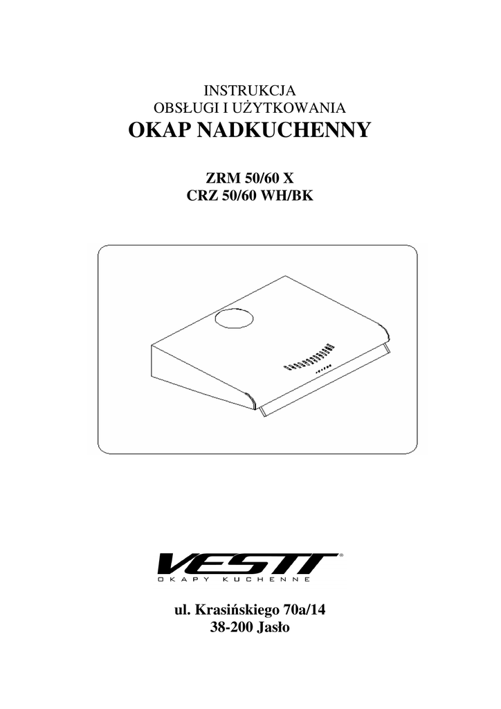 INSTRUKCJA OBSŁUGI I UŻYTKOWANIA OKAP NADKUCHENNY ZRM 50/60 X CRZ 50/60 WH/BK ul. Krasińskiego 70a/14 38-200 Jasło Szanowni Państwo! Staliście się użytkownikami okapu kuchennego typu CRZ, ZRM. Okap ten został zaprojektowany z myślą o spełnieniu Państwa oczekiwań i z pewnością będzie stanowić część nowocześnie wyposażonej kuchni. Zastosowane w nim nowoczesne rozwiązania konstrukcyjne i użycie najnowszej technologii produkcji zapewnia mu wysoką funkcjonalność oraz estetykę. Przed przystąpieniem do montażu okapu prosimy o dokładne zapoznanie się z treścią niniejszej instrukcji. Dzięki temu unikną Państwo błędnej instalacji i obsługi okapu. Życzymy satysfakcji i zadowolenia z wyboru okapu. UWAGA: Producent nie bierze na siebie żadnej odpowiedzialności za uszkodzenia powstałe w skutek montażu i użytkowania niezgodnego z instrukcją obsługi. Waga poszczególnych okapów : Nazwa okapu CRZ 50 CRZ 60 ZRM 50 ZRM 60 Waga netto (kg) 3,9 4,3 3,9 4,3 SPIS TREŚCI: INSTRUKCJA OBSŁUGI CRZ, ZRM I. Charakterystyka II. Wyposażenie III. Dane techniczne IV. Warunki eksploatacji V. Montaż VI. Obsługa i konserwacja KARTA GWARANCYJNA …………………………………………… …………………………………………… …………………………………………… …………………………………………… …………………………………………… …………………………………………… …………………………………………… …………………………………………… 2 3 3 4 5 5 6 6 11 INSTRUKCJA OBSŁUGI CRZ, ZRM Okap kuchenny przeznaczony jest do oczyszczania powietrza z oparów i zapachów powstających w kuchni podczas gotowania i smażenia potraw. Okap kuchenny posiadający wkładkę filtrującą oczyszcza powietrze bez konieczności podłączenia do przewodu wentylacyjnego. Charakterystyka techniczna Typ: Napięcie znamionowe Częstotliwość znamionowa Znamionowy pobór mocy Klasa ochrony obsługi przed porażeniem elektrycznym Oświetlenie Wydatek powietrza (Bieg 1) Wydatek powietrza (Bieg 2) Wydatek powietrza (Bieg 3) Kolor CRZ, ZRM 230V 50Hz 150W II 1 żarówka 40W 220 m3/h 260m3/h 320 m3/h biały, czarny, inox W zależności od klasy ochrony okap należy podłączyć do gniazda z uziemieniem lub bez uziemienia. Instalowanie: Okap należy zamocować na dwóch wkrętach Ø5 wkręconych w kołki rozporowe na ścianie. Minimalna wysokość zamocowania okapu od kuchenki wynosi 7580cm. Włączanie i wyłączanie odbywa się za pomocą dwóch przycisków: 1 – włączanie bieg 1, bieg 2 i wyłączanie silnika 2 – włączanie i wyłączanie światła W przypadku: wymiany żarówki, przeprowadzania wymiany włókniny filtracyjnej lub czyszczenia i konserwacji okap należy odłączyć od gniazdka sieci elektrycznej przez wyciągnięcie wtyczki. Czyszczenie i konserwacja: W czasie eksploatacji wyrobu brudzi się (głównie zatłuszcza) przede wszystkim włóknina filtracyjna. Należy ją prać przynajmniej raz na trzy miesiące w wodzie z dodatkiem środków do prania delikatnych tkanin. Wyjęcie włókniny 3 filtracyjnej z zespołu filtra, dzięki elastyczności drutowego docisku, nie przedstawia trudności. Zużytą włókninę wymienić na nową. Uwaga! Pochłaniacze w kolorze czarnym należy czyścić miękką ściereczką, nie należy używać środków czyszczących o właściwościach ściernych – ich działanie może uszkodzić powierzchnię pochłaniacza! Okap można podłączyć tylko do przewodu wentylacyjnego. Nie wolno go podłączać do przewodu kominowego lub dymowego! I Charakterystyka Okap nadkuchenny CRZ, ZRM służy do usuwania lub neutralizacji oparów kuchennych. W trybie pracy jako wyciąg oparów, wymaga on zainstalowania przewodu odprowadzającego powietrze na zewnątrz. Długość przewodu (rura ø 120 mm) nie powinna być dłuższa niż 4-5 m. Po zainstalowaniu filtra z węglem aktywnym okap może pracować jako pochłaniacz zapachów. W tym przypadku nie wymaga się instalowania się przewodu odprowadzającego powietrze na zewnątrz. Okap nadkuchenny jest urządzeniem elektrycznym wykonanym w II klasie ochrony przeciwpożarowej z zamocowanym na stałe sznurem przyłączeniowym i wtyczką. Ponadto posiada niezależne oświetlenie oraz wentylator wyciągowy z możliwością ustawienia jednej z 3-ch prędkości obrotowych. Okap jest przeznaczony do trwałego zamocowania na pionowej ścianie ponad kuchenką gazową lub elektryczną. II Wyposażenie Okap jest złożony z następujących elementów (rys. 1): 1) obudowy okapu 2) zespołu wyłączników 3) zyki do podłączenia przewodu wentylacyjnego 4) siatka 4 III Dane techniczne CRZ, ZRM Typ okapu : Napięcie zasilania Silnik wentylatora Oświetlenie Ilość filtrów przeciwtłuszczowych Stopnie prędkości Szerokość (cm) Głębokość (cm) Wysokość (cm) Wylot powietrza (ø mm) Wydajność (m3/h) Pobór mocy (W) Głośność (dBa) Rodzaj pracy Kolor AC 230V 50 Hz 1 40 W 1 3 50, 60 50 13 120 od 220 do 320 max. 150 max. 51 ciągła biały, czarny, inox IV Warunki eksploatacji 1. Okap do usuwania oparów kuchennych na zewnątrz należy podłączyć do odpowiedniego kanału wentylacyjnego (nie podłączać do kanałów kominowych , dymowych lub spalinowych będących w eksploatacji). 2. Bezpieczna odległość pomiędzy płytą kuchenną a okapem nadkuchennym powinna wynosić przynajmniej 650 mm. 3. Pod okapem nadkuchennym nie wolno pozostawiać odkrytego płomienia ; podczas zdejmowania naczyń znad gazu należy ustawić płomień minimalny. 4. Potrawy przygotowywane na tłuszczach powinny być stale nadzorowane, gdyż przegrzany tłuszcz może się zapalić. 5. Czyszczenie filtra przeciwtłuszczowego do okapu nadkuchennego należy przeprowadzać zgodnie z instrukcją i co najmniej co 2 miesiące, w związku z istniejącym ryzykiem pożaru (nasycony tłuszcz jest łatwopalny). 6. Przed każdą operacją czy
