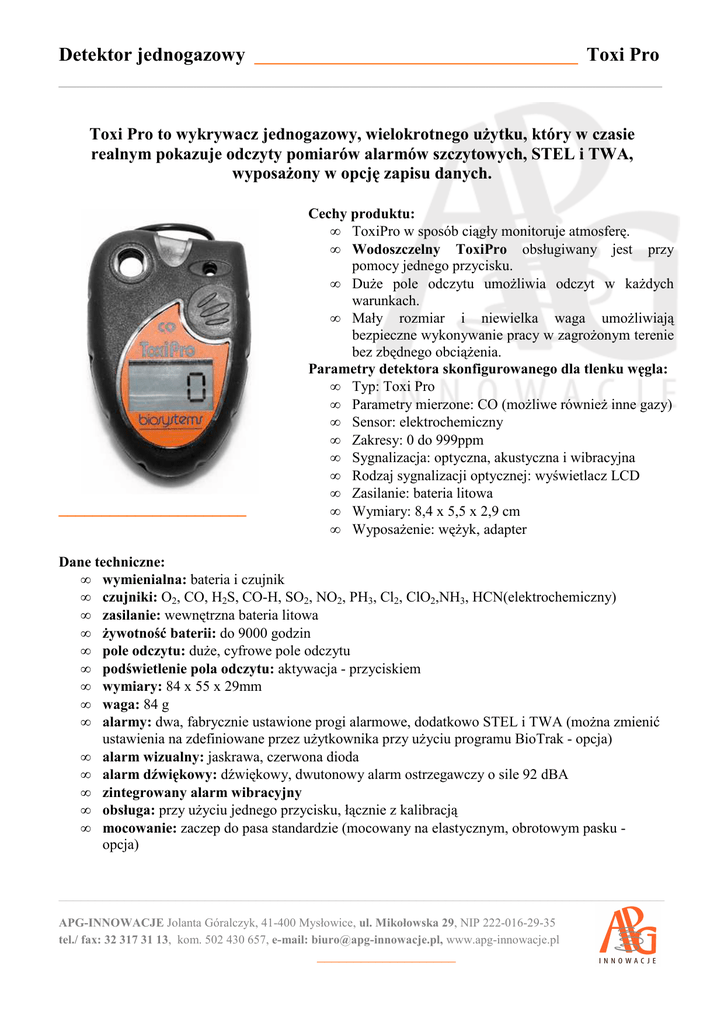 Detektor jednogazowy ______________________________________ Toxi Pro ______________________________________________________________ Toxi Pro to wykrywacz jednogazowy, wielokrotnego użytku, który w czasie realnym pokazuje odczyty pomiarów alarmów szczytowych, STEL i TWA, wyposażony w opcję zapisu danych. ______________________ Cechy produktu: • ToxiPro w sposób ciągły monitoruje atmosferę. • Wodoszczelny ToxiPro obsługiwany jest przy pomocy jednego przycisku. • Duże pole odczytu umożliwia odczyt w każdych warunkach. • Mały rozmiar i niewielka waga umożliwiają bezpieczne wykonywanie pracy w zagrożonym terenie bez zbędnego obciążenia. Parametry detektora skonfigurowanego dla tlenku węgla: • Typ: Toxi Pro • Parametry mierzone: CO (możliwe również inne gazy) • Sensor: elektrochemiczny • Zakresy: 0 do 999ppm • Sygnalizacja: optyczna, akustyczna i wibracyjna • Rodzaj sygnalizacji optycznej: wyświetlacz LCD • Zasilanie: bateria litowa • Wymiary: 8,4 x 5,5 x 2,9 cm • Wyposażenie: wężyk, adapter Dane techniczne: • wymienialna: bateria i czujnik • czujniki: O2, CO, H2S, CO-H, SO2, NO2, PH3, Cl2, ClO2,NH3, HCN(elektrochemiczny) • zasilanie: wewnętrzna bateria litowa • żywotność baterii: do 9000 godzin • pole odczytu: duże, cyfrowe pole odczytu • podświetlenie pola odczytu: aktywacja - przyciskiem • wymiary: 84 x 55 x 29mm • waga: 84 g • alarmy: dwa, fabrycznie ustawione progi alarmowe, dodatkowo STEL i TWA (można zmienić ustawienia na zdefiniowane przez użytkownika przy użyciu programu BioTrak - opcja) • alarm wizualny: jaskrawa, czerwona dioda • alarm dźwiękowy: dźwiękowy, dwutonowy alarm ostrzegawczy o sile 92 dBA • zintegrowany alarm wibracyjny • obsługa: przy użyciu jednego przycisku, łącznie z kalibracją • mocowanie: zaczep do pasa standardzie (mocowany na elastycznym, obrotowym pasku opcja) ___________________________________________________________________________________ APG-INNOWACJE Jolanta Góralczyk, 41-400 Mysłowice, ul. Mikołowska 29, NIP 222-016-29-35 tel./ fax: 32 317 31 13, kom. 502 430 657, e-mail: [email protected], www.apg-innowacje.pl ___________________ Detektor jednogazowy ______________________________________ Toxi Pro ______________________________________________________________ • • • • • • • • budowa: przeźroczysty polycarbonat i obudowa wykonana z elastycznego, termoplastycznego tworzywa (TPE) trwałość (w jednostkach IP) Odpowiada klasie IP67 odnośnie odporności na wodę wodoodporny i wodoszczelny odczyty: czas realny, szczyt, STEAL, TWA oraz czas codziennego odczytu logowanie zdarzeń: 20 zdarzeń, z włączeniem: czasu aktywacji, czasu zakończenia, czas pracy, odczyty szczytowe i średnie logowanie danych: średnio 120 godzin, 1 minutowy czasookres (czas można zmienić przy pomocy programu BioTrack - opcja, konieczny port podczerwieni) standardowe akcesoria: adapter do kalibracji, przewód, instrukcja, karta numerów katalogowych bezpieczeństwo wewnętrzne/ Certyfikaty: CE: (DEMKO), c-UL-us: Klasa I, Oddział I, Grupa A, B, C & D odnośnie niebezpiecznych lokalizacji, ATEX ___________________________________________________________________________________ APG-INNOWACJE Jolanta Góralczyk, 41-400 Mysłowice, ul. Mikołowska 29, NIP 222-016-29-35 tel./ fax: 32 317 31 13, kom. 502 430 657, e-mail: [email protected], www.apg-innowacje.pl ___________________