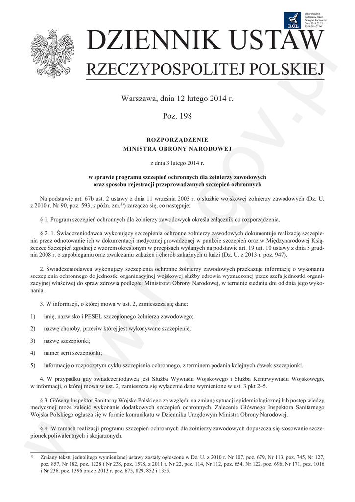 Elektronicznie podpisany przez Grzegorz Paczowski Data: 2014.02.12 15:14:58 +01'00' DZIENNIK USTAW v.p l RZECZYPOSPOLITEJ POLSKIEJ Warszawa, dnia 12 lutego 2014 r. Poz. 198 ROZPORZĄDZENIE MINISTRA OBRONY NARODOWEJ .go z dnia 3 lutego 2014 r. w sprawie programu szczepień ochronnych dla żołnierzy zawodowych oraz sposobu rejestracji przeprowadzanych szczepień ochronnych Na podstawie art. 67b ust. 2 ustawy z dnia 11 września 2003 r. o służbie wojskowej żołnierzy zawodowych (Dz. U. z 2010 r. Nr 90, poz. 593, z późn. zm.1)) zarządza się, co następuje: § 1. Program szczepień ochronnych dla żołnierzy zawodowych określa załącznik do rozporządzenia. w. rcl § 2. 1. Świadczeniodawca wykonujący szczepienia ochronne żołnierzy zawodowych dokumentuje realizację szczepienia przez odnotowanie ich w dokumentacji medycznej prowadzonej w punkcie szczepień oraz w Międzynarodowej Książeczce Szczepień zgodnej z wzorem określonym w przepisach wydanych na podstawie art. 19 ust. 10 ustawy z dnia 5 grudnia 2008 r. o zapobieganiu oraz zwalczaniu zakażeń i chorób zakaźnych u ludzi (Dz. U. z 2013 r. poz. 947). 2. Świadczeniodawca wykonujący szczepienia ochronne żołnierzy zawodowych przekazuje informację o wykonaniu szczepienia ochronnego do jednostki organizacyjnej wojskowej służby zdrowia wyznaczonej przez szefa jednostki organizacyjnej właściwej do spraw zdrowia podległej Ministrowi Obrony Narodowej, w terminie siedmiu dni od dnia jego wykonania. 3. W informacji, o której mowa w ust. 2, zamieszcza się dane: 1) 2) 3) 4) 5) imię, nazwisko i PESEL szczepionego żołnierza zawodowego; nazwę choroby, przeciw której jest wykonywane szczepienie; nazwę szczepionki; numer serii szczepionki; informację o rozpoczętym cyklu szczepienia ochronnego, z terminem podania kolejnych dawek szczepionki. ww 4. W przypadku gdy świadczeniodawcą jest Służba Wywiadu Wojskowego i Służba Kontrwywiadu Wojskowego, w informacji, o której mowa w ust. 2, zamieszcza się wyłącznie dane wymienione w ust. 3 pkt 2–5. § 3. Główny Inspektor Sanitarny Wojska Polskiego ze względu na zmianę sytuacji epidemiologicznej lub postęp wiedzy medycznej może zalecić wykonanie dodatkowych szczepień ochronnych. Zalecenia Głównego Inspektora Sanitarnego Wojska Polskiego ogłasza się w formie komunikatu w Dzienniku Urzędowym Ministra Obrony Narodowej. § 4. W ramach realizacji programu szczepień ochronnych dla żołnierzy zawodowych dopuszcza się stosowanie szczepionek poliwalentnych i skojarzonych. 1) Zmiany tekstu jednolitego wymienionej ustawy zostały ogłoszone w Dz. U. z 2010 r. Nr 107, poz. 679, Nr 113, poz. 745, Nr 127, poz. 857, Nr 182, poz. 1228 i Nr 238, poz. 1578, z 2011 r. Nr 22, poz. 114, Nr 112, poz. 654, Nr 122, poz. 696, Nr 171, poz. 1016 i Nr 236, poz. 1396 oraz z 2013 r. poz. 675, 829, 852 i 1355. Dziennik Ustaw –2– Poz. 198 v.p l § 5. 1. Dane o szczepieniach ochronnych żołnierzy zawodowych objęte informacją o wykonaniu szczepienia ochronnego, o której mowa w § 2 ust. 2, gromadzi się w Centralnym Rejestrze Szczepień Żołnierzy Zawodowych, zwanym dalej „rejestrem”. 2. Dane, o których mowa w ust. 1, gromadzi się dla potrzeb analizy epidemiologicznej działań profilaktycznych podejmowanych w Siłach Zbrojnych Rzeczypospolitej Polskiej. 3. Rejestr prowadzi się w Systemie Ewidencji Wojskowej ,,SEW on-line”. 4. Minister Obrony Narodowej na wniosek szefa jednostki organizacyjnej właściwej do spraw zdrowia podległej Ministrowi Obrony Narodowej wyznaczy jednostkę organizacyjną wojskowej służby zdrowia do prowadzenia rejestru. § 6. Traci moc rozporządzenie Ministra Obrony Narodowej z dnia 30 kwietnia 2010 r. w sprawie programu szczepień ochronnych dla żołnierzy zawodowych oraz sposobu rejestracji przeprowadzanych szczepień ochronnych (Dz. U. Nr 87, poz. 564). .go § 7. Rozporządzenie wchodzi w życie po upływie 14 dni od dnia ogłoszenia. ww w. rcl Minister Obrony Narodowej: T. Siemoniak w. rcl Informacji uzupełniających. II. v.p l Kalendarza szczepień ochronnych dla żołnierzy zawodowych narażonych na określone czynniki chorobotwórcze oraz wykonywanych z przyczyn epidemiologicznych, I. .go PROGRAM SZCZEPIEŃ OCHRONNYCH DLA ŻOŁNIERZY ZAWODOWYCH Program szczepień ochronnych dla żołnierzy zawodowych składa się z: ww Załącznik do rozporządzenia Ministra Obrony Narodowej z dnia 3 lutego 2014 r. (poz. 198) Dziennik Ustaw –3– Poz. 198 w. rcl – dawka przypominająca nie powinna być podana wcześniej niż po upływie 3 lat od ostatniej wakcynacji szczepionką Td, – szczepionka dTPolio powinna być użyta do doszczepiania osób uprzednio zaszczepionych w trybie podstawowym zgodnie z programem szczepień w pojedynczej dawce – ze wskazań indywidualnych, żołnierze zawodowi pełniący zawodową służbę wojskową w styczności z chorymi na błonicę, – żołnierze zawodowi pełniący zawodową służbę wojskową wymagającą kontaktu z osobami przybywającymi z obszarów epidemicznego występowania błonicy lub związaną z wyjazdem na te obszary, – żołnierze zawodowi szczepieni podstawowo, tzn. objęci szczepieniem obowiązkowym dzieci i młodzieży, pojedyncze dawki przypominające co 10 lat, – w zależności od sytuacji epidemiologicznej Przeciw BŁONICY – podskórnie, 1)szczepionką monowalentną błoniczą (d); 2)szczepionką skojarzoną tężcowo-błoniczą (Td) – domięśniowo; 3)szczepionka skojarzona poliwalentna, inaktywowana przeciwko błonicy-tężcowi i poliomyelitis (dTPolio) Dziennik Ustaw v.p l .go – szczepienia w ramach profilaktyki poekspozycyjnej należy prowadzić szczepionką monowalentną lub szczepionką skojarzoną tężcowo-błoniczą (T lub Td), – szczegółowe wytyczne dla szczepień przeciw tężcowi u osób zranionych zawiera część II: Informacje uzupełniające, – dawka przypominająca powinna być podawana po ocenie statusu immunologicznego żołnierza i zgodnie z zalece