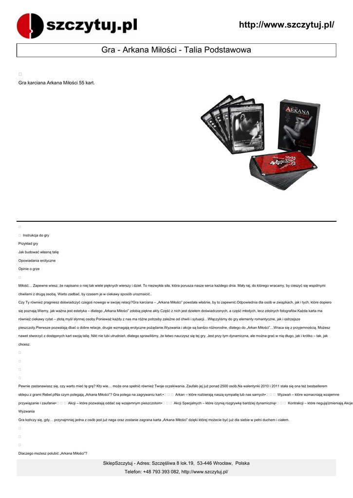 http://www.szczytuj.pl/ Gra - Arkana Miłości - Talia Podstawowa Gra karciana Arkana Miłości 55 kart. Instrukcja do gry Przykład gry Jak budować własną talię Opowiadania erotyczne Opinie o grze Miłość… Zapewne wiesz, że napisano o niej tak wiele pięknych wierszy i dzieł. To niezwykła siła, która porusza nasze serca każdego dnia. Mały raj, do którego wracamy, by cieszyć się wspólnymi chwilami z drugą osobą. Warto zadbać, by czasem je w ciekawy sposób urozmaicić.. Czy Ty również pragniesz doświadczyć czegoś nowego w swojej relacji?Gra karciana – „Arkana Miłości” powstała właśnie, by to zapewnić.Odpowiednia dla osób w związkach, jak i tych, które dopiero się poznają.Wiemy, jak ważna jest estetyka – dlatego „Arkana Miłości” zdobią piękne akty.Część z nich jest dziełem doświadczonych, a część młodych, lecz zdolnych fotografów.Każda karta ma również ciekawy cytat – złotą myśl słynnej osoby.Ponieważ każdy z nas ma różne potrzeby zależne od chwili i sytuacji…Włączyliśmy do gry elementy romantyczne, jak i ostrzejsze pieszczoty.Pierwsze pozwalają dbać o dobre relacje, drugie wzmagają erotyczne pożądanie.Wyzwania i akcje są bardzo różnorodne, dlatego do „Arkan Miłości”…Wraca się z przyjemnością. Możesz nawet stworzyć z dostępnych kart swoją talię. Nikt nie lubi utrudnień, dlatego sprawiliśmy, że łatwo nauczysz się tej gry. Jest przy tym dynamiczna, ale można grać w nią długo, jak i krótko – tak, jak chcesz. Pewnie zastanawiasz się, czy warto mieć tę grę? Kto wie… może ona spełnić również Twoje oczekiwania. Zaufało jej już ponad 2500 osób,Na walentynki 2010 i 2011 stała się ona też bestsellerem sklepu z grami Rebel.plNa czym polegają „Arkana Miłości”? Gra polega na zagrywaniu kart:• Arkan – które rozbierają naszą sympatię lub nas samych• Wyzwań – które wzmacniają wzajemne przywiązanie i zaufanie• Akcji – które pozwalają oddać się wzajemnym pieszczotom• Akcji Specjalnych – które czynią rozgrywkę bardziej dynamiczną• Kontrakcji – które negują/zmieniają Akcje Wyzwania Gra kończy się, gdy… przynajmniej jedna z osób jest już naga oraz zostanie zagrana karta „Arkana Miłości” dzięki której możecie być już dla siebie w pełni duchem i ciałem. Dlaczego możesz polubić „Arkana Miłości”? SklepSzczytuj - Adres: Szczęśliwa 8 lok.19, 53-446 Wrocław, Polska Telefon: +48 793 393 082, http://www.szczytuj.pl/ • Pozwoli wam się odkrywać, wnieść coś nowego, przełamać nieśmiałość. http://www.szczytuj.pl/ • Da dużo możliwości, bo jest różnorodna. Możesz nawet stworzyć własną talię (zgodną z Twoimi potrzebami i preferencjami). • Gra cały czas się rozwija i pojawiają się do niej dodatki… • Jest estetyczna i ładna, doskonale nadaje się na prezent. • Jest karciana, więc weźmiesz ją wszędzie - a w grach planszowych pionki spadają z łóżka ;) Liczba graczy: od 2 osób Wiek: od 18 lat Czas gry: 20 - 60 minut Zawartość pudełka: • 55 kart • Instrukcja (polska) Aby złożyć zamówienie - wykonaj jedną z poniższych czynności: Klikając w "Kupuję", oraz dorzucając produkty do koszyka Zadzwoń, lub wyślij sms-a na jeden z podanych numerów telefonów (znajdziesz je w zakładce o nas) podając swoje dane i numer produktu, lub nazwę i cenę. Wyślij e-maila na adres [email protected] podając swoje dane i numer produktu Rozmawiając z konsultantem na Gadu-Gadu - nr 25974923 SklepSzczytuj - Adres: Szczęśliwa 8 lok.19, 53-446 Wrocław, Polska Telefon: +48 793 393 082, http://www.szczytuj.pl/