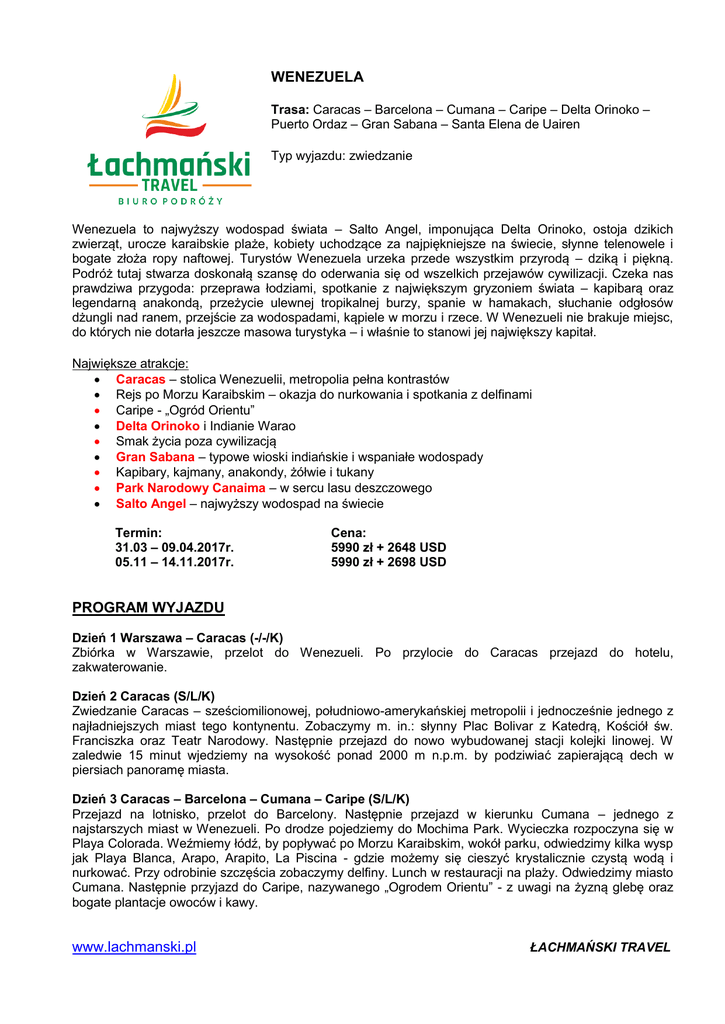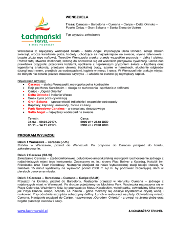 WENEZUELA Trasa: Caracas – Barcelona – Cumana – Caripe – Delta Orinoko – Puerto Ordaz – Gran Sabana – Santa Elena de Uairen Typ wyjazdu: zwiedzanie Wenezuela to najwyższy wodospad świata – Salto Angel, imponująca Delta Orinoko, ostoja dzikich zwierząt, urocze karaibskie plaże, kobiety uchodzące za najpiękniejsze na świecie, słynne telenowele i bogate złoża ropy naftowej. Turystów Wenezuela urzeka przede wszystkim przyrodą – dziką i piękną. Podróż tutaj stwarza doskonałą szansę do oderwania się od wszelkich przejawów cywilizacji. Czeka nas prawdziwa przygoda: przeprawa łodziami, spotkanie z największym gryzoniem świata – kapibarą oraz legendarną anakondą, przeżycie ulewnej tropikalnej burzy, spanie w hamakach, słuchanie odgłosów dżungli nad ranem, przejście za wodospadami, kąpiele w morzu i rzece. W Wenezueli nie brakuje miejsc, do których nie dotarła jeszcze masowa turystyka – i właśnie to stanowi jej największy kapitał. Największe atrakcje: Caracas – stolica Wenezuelii, metropolia pełna kontrastów Rejs po Morzu Karaibskim – okazja do nurkowania i spotkania z delfinami Caripe - „Ogród Orientu” Delta Orinoko i Indianie Warao Smak życia poza cywilizacją Gran Sabana – typowe wioski indiańskie i wspaniałe wodospady Kapibary, kajmany, anakondy, żółwie i tukany Park Narodowy Canaima – w sercu lasu deszczowego Salto Angel – najwyższy wodospad na świecie Termin: 31.03 – 09.04.2017r. 05.11 – 14.11.2017r. Cena: 5990 zł + 2648 USD 5990 zł + 2698 USD PROGRAM WYJAZDU Dzień 1 Warszawa – Caracas (-/-/K) Zbiórka w Warszawie, przelot do Wenezueli. Po przylocie do Caracas przejazd do hotelu, zakwaterowanie. Dzień 2 Caracas (S/L/K) Zwiedzanie Caracas – sześciomilionowej, południowo-amerykańskiej metropolii i jednocześnie jednego z najładniejszych miast tego kontynentu. Zobaczymy m. in.: słynny Plac Bolivar z Katedrą, Kościół św. Franciszka oraz Teatr Narodowy. Następnie przejazd do nowo wybudowanej stacji kolejki linowej. W zaledwie 15 minut wjedziemy na wysokość ponad 2000 m n.p.m. by podziwiać zapierającą dech w piersiach panoramę miasta. Dzień 3 Caracas – Barcelona – Cumana – Caripe (S/L/K) Przejazd na lotnisko, przelot do Barcelony. Następnie przejazd w kierunku Cumana – jednego z najstarszych miast w Wenezueli. Po drodze pojedziemy do Mochima Park. Wycieczka rozpoczyna się w Playa Colorada. Weźmiemy łódź, by popływać po Morzu Karaibskim, wokół parku, odwiedzimy kilka wysp jak Playa Blanca, Arapo, Arapito, La Piscina - gdzie możemy się cieszyć krystalicznie czystą wodą i nurkować. Przy odrobinie szczęścia zobaczymy delfiny. Lunch w restauracji na plaży. Odwiedzimy miasto Cumana. Następnie przyjazd do Caripe, nazywanego „Ogrodem Orientu” - z uwagi na żyzną glebę oraz bogate plantacje owoców i kawy. www.lachmanski.pl ŁACHMAŃSKI TRAVEL Dzień 4 Caripe – Delta Orinoko (S/L/K) Odwiedzimy grotę Guacharo. Miejsce to, odkryte przez Alexandra von Humboldta, dziś zachwyca obfitymi formacjami skalnymi, stalaktytami i stalagmitami. Przejazd do Boca de Uracoa położonego w Delcie Orinoko, zamieszkałej przez plemiona Indian Warao. Rejs w głąb największej na świecie Delty Orinoko. Wzdłuż kanałów tej słynnej rzeki można zobaczyć szałasy zbudowane i zamieszkałe przez Indian. Przy odrobinie szczęścia zobaczymy słodkowodne delfiny, żółwie, krokodyle, papugi, małpy… Zakwaterowanie w obozie nad rzeką, lunch i krótki odpoczynek. Następnie wycieczka w głąb dżungli oraz do wiosek lokalnych Indian – możliwość zakupu oryginalnych pamiątek i rękodzieła artystycznego. Wieczorem powrót do obozu. Dzień 5 Delta Orinoko – Puerto Ordaz (S/L/K) Udamy się na niezwykle ekscytujący rejs przez „borę” (wodne hiacynty o purpurowych i białych kwiatach) na połów piranii oraz poszukiwanie dzikich zwierząt i podglądanie ich życia. Powrót do obozowiska na lunch. Następnie rejs do Boca de Uracoa, skąd autokarem udamy się Puerto Ordaz. Dzień 6 Puerto Ordaz – Gran Sabana (S/L/K) Wyjazd w kierunku Parku Narodowego Gran Sabana. Przejazd przez typowe wioski indiańskie, obserwacja życia ich mieszkańców. Pokonamy olbrzymie masywy skalne, aby wznieść się na wysokość ponad 1300 m n.p.m., gdzie podziwiać będziemy ponad 100-metrowej wysokości wodospad Chinak-Merú. Przejazd do obozowiska, lunch. Odpoczynek po podróży. Dzień 7 Gran Sabana – Santa Elena de Uairen (S/L/K) Podróż na południe Gran Sabany, po obszarze bogatym w liczne wodospady, kaskady wodne, malownicze wioski indiańskie i niepowtarzalne formacje skalne. Poznamy uroki Parku Narodowego Canaima. Następnie podróż na południe, na granicę z Brazylią („La Linea”), do miasteczka o nazwie Santa Elena de Uairem. Dzień 8 Santa Elena de Uairen – Puerto Ordaz (S/-/K) Po wczesnym śniadaniu przejazd do Luepa, jednego z najstarszych miejsc naszej planety, położonego w Parku Canaima. Przelot helikopterem z Luepa do Canaima nad Salto Angel (fakultatywnie, w zależności od pogody). Spacer przez dżunglę do wyjątkowych wodospadów Salto Sapo, rejs łodzią po lagunie. Powrót do Puerto Ordaz. Dzień 9 Puerto Ordaz – Caracas - Warszawa (S/-/-) Transfer na lotnisko, przelot do Caracas i dalej do Europy. Dzień 10 Warszawa (-/-/-) Przylot do Warszawy. Cena obejmuje: przelot na trasie Warszawa/Caracas/Warszawa, 02 przeloty wewnętrzne Caracas/Barcelona, Puerto Ordaz/Caracas, noclegi w hotelach 3* (dopłata do pokoju 1-os. 720 USD), wyżywienie wg programu (S-śniadanie, L-obiad, K-kolacja), transfery i przejazdy podczas zwiedzania, wycieczki i atrakcje zgodnie z programem, bilety wstępu do Parków Narodowych i obiektów, usługi lokalnych przewodników, pilota/tłumacza ze strony B.P. Łachmański Travel, opłatę wjazdową do Wenezueli oraz lokalne podatki i opłaty rządowe, ubezpieczenie KL i NNW w SIGNAL IDUNA Polska Towarzystwo Ubezpieczeń S.A. 01-