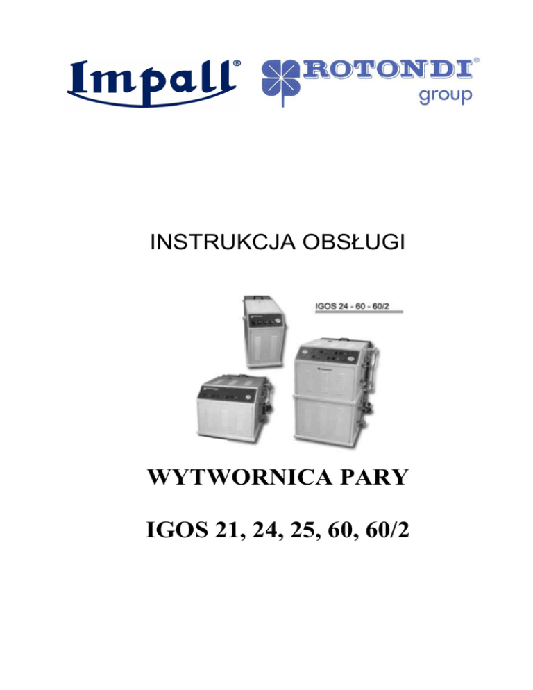 INSTRUKCJA OBSŁUGI WYTWORNICA PARY IGOS 21, 24, 25, 60, 60/2 KAśDA MODYFIKACJA URZĄDZENIA, PRZEPROWADZONA PRZEZ UśYTKOWNIKA BĄDŹ MONTUJĄCY URZĄDZENIE PERSONEL TECHNICZNY SKUTKUJE NATYCHMIASTOWYM UNIEWAśNIENIEM CERTYFIKATU ZGODNOŚCI Wszystkie czynności konserwujące i regulacyjne, opisane w niniejszej instrukcji winny być wykonywane wyłącznie po uprzednim odłączeniu urządzenia od wszystkich źródeł zasilania. Wszystkie czynności konserwujące i regulacyjne, nie opisane w niniejszej instrukcji winny być wykonywane wyłącznie przez wykwalifikowanych techników, aby uniknąć wszelkiego rodzaju uszkodzeń urządzenia lub teŜ wypadków ludzkich. Przed przystąpieniem do pracy z urządzeniem naleŜy uwaŜnie przeczytać niniejszą instrukcję obsługi. Instrukcję naleŜy przechowywać w bezpiecznym miejscu, gdzie w razie potrzeby będzie dostępna, aŜ do czasu ostatecznej likwidacji maszyny. UŜytkowanie i procedury konserwacyjne naleŜy przeprowadzać z naleŜytą starannością. W przeciwnym wypadku monter nie ponosi odpowiedzialności za wszelkiego rodzaju szkody i wypadki na ludziach, zwierzętach bądź przedmiotach, będące skutkiem postępowania niezgodnego z instrukcją. Po rozpakowaniu urządzenia naleŜy sprawdzić czy ono samo lub jej części nie są uszkodzone. W przypadku wątpliwości naleŜy skontaktować się z autoryzowanym dystrybutorem. Instalacji urządzenia dokonać moŜe jedynie wykwalifikowany operator, przeprowadzając ją zgodnie z instrukcjami konstruktora. Przed podłączeniem urządzenia naleŜy sprawdzić sprawność elektrycznej instalacji zasilającej. Urządzenie jest elektrycznie bezpieczne jedynie pod warunkiem sprawnego i odpowiedniego uziemienia. W przypadku wątpliwości naleŜy skontaktować się z wykwalifikowanym technikiem. W przypadku awarii i/lub nieprawidłowego działania naleŜy odłączyć urządzenie od wszystkich źródeł zasilania, nie uszkadzając aparatów kontrolnych i wyposaŜenia maszyny. Do usunięcia awarii angaŜować jedynie serwisantów autoryzowanych przez producenta i wykorzystywać tylko oryginalne części zamienne. KaŜdy rodzaj uŜytkowania urządzenia, niezgodny z jego przeznaczeniem, moŜe spowodować powaŜne uszkodzenia maszyny jak i jest bardzo niebezpieczne dla operatora. 2 SPIS TREŚCI 1. 1.1 1.2 1.3 1.4 1.5 Informacje ogólne ........................................................................................................................................4 Wstęp..............................................................................................................................................................4 Odniesienie do norm i przepisów....................................................................................................................4 Cel niniejszej instrukcji....................................................................................................................................4 UŜywanie instrukcji i jej bezpieczne przechowywanie.....................................................................................4 Dodatkowe kopie instrukcji..............................................................................................................................5 2. 2.1 2.2 2.3 Opis ogólny ...................................................................................................................................................6 Dodatkowe ryzyka ..........................................................................................................................................6 OstrzeŜenia......................................................................................................................................................6 Urządzenia zabezpieczające ..........................................................................................................................7 3. 3.1 Dane techniczne ...........................................................................................................................................8 Tabliczka znamionowa ...................................................................................................................................8 4. 4.1 Prawidłowe i niedozwolone uŜytkowanie ...................................................................................................8 Przeciwwskazania i ryzyko, wynikające z niedozwolonego uŜytkowania........................................................8 5. Transport i przenoszenie..............................................................................................................................9 6. 6.1 6.2 6.3 Instalacja......................................................................................................................................................10 Wolna przestrzeń...........................................................................................................................................10 Widok ogólny urządzenia, z zaznaczonymi głównymi jego częściami...........................................................10 Wymiary podstawy maszyny..........................................................................................................................10 7. 7.1 7.2 7.3 7.3.1 7.4 7.5 7.5.1 7.5.2 7.5.3 7.5.4 7.5.5 ZłoŜenie i przygotowanie maszyny.............................................................................................................11 Przygotowania maszyny do uŜycia.................................................................................................................11 ZłoŜenie akcesoriów urządzenia.....................................................................................................................11 Prewencyjne sprawdzenie i kontrola...............................................................................................................11 Sprawdzenie uszkodzeń, powstałych na skutek transportu......