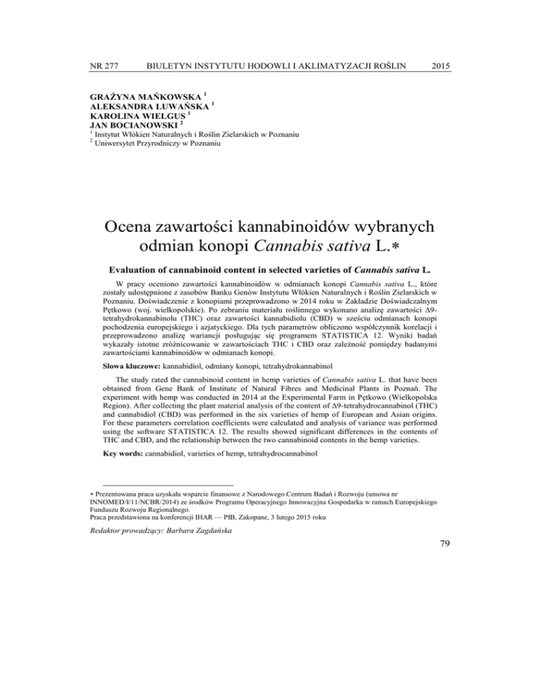 NR 277 BIULETYN INSTYTUTU HODOWLI I AKLIMATYZACJI ROŚLIN 2015 GRAŻYNA MAŃKOWSKA 1 ALEKSANDRA LUWAŃSKA 1 KAROLINA WIELGUS 1 JAN BOCIANOWSKI 2 1 2 Instytut Włókien Naturalnych i Roślin Zielarskich w Poznaniu Uniwersytet Przyrodniczy w Poznaniu Ocena zawartości kannabinoidów wybranych odmian konopi Cannabis sativa L.∗ Evaluation of cannabinoid content in selected varieties of Cannabis sativa L. W pracy oceniono zawartości kannabinoidów w odmianach konopi Cannabis sativa L., które zostały udostępnione z zasobów Banku Genów Instytutu Włókien Naturalnych i Roślin Zielarskich w Poznaniu. Doświadczenie z konopiami przeprowadzono w 2014 roku w Zakładzie Doświadczalnym Pętkowo (woj. wielkopolskie). Po zebraniu materiału roślinnego wykonano analizę zawartości ∆9tetrahydrokannabinolu (THC) oraz zawartości kannabidiolu (CBD) w sześciu odmianach konopi pochodzenia europejskiego i azjatyckiego. Dla tych parametrów obliczono współczynnik korelacji i przeprowadzono analizę wariancji posługując się programem STATISTICA 12. Wyniki badań wykazały istotne zróżnicowanie w zawartościach THC i CBD oraz zależność pomiędzy badanymi zawartościami kannabinoidów w odmianach konopi. Słowa kluczowe: kannabidiol, odmiany konopi, tetrahydrokannabinol The study rated the cannabinoid content in hemp varieties of Cannabis sativa L. that have been obtained from Gene Bank of Institute of Natural Fibres and Medicinal Plants in Poznań. The experiment with hemp was conducted in 2014 at the Experimental Farm in Pętkowo (Wielkopolska Region). After collecting the plant material analysis of the content of ∆9-tetrahydrocannabinol (THC) and cannabidiol (CBD) was performed in the six varieties of hemp of European and Asian origins. For these parameters correlation coefficients were calculated and analysis of variance was performed using the software STATISTICA 12. The results showed significant differences in the contents of THC and CBD, and the relationship between the two cannabinoid contents in the hemp varieties. Key words: cannabidiol, varieties of hemp, tetrahydrocannabinol ∗ Prezentowana praca uzyskała wsparcie finansowe z Narodowego Centrum Badań i Rozwoju (umowa nr INNOMED/I/11/NCBR/2014) ze środków Programu Operacyjnego Innowacyjna Gospodarka w ramach Europejskiego Funduszu Rozwoju Regionalnego. Praca przedstawiona na konferencji IHAR — PIB, Zakopane, 3 lutego 2015 roku Redaktor prowadzący: Barbara Zagdańska 79 Grażyna Mańkowska ... WSTĘP Zainteresowanie konopiami, od czasu kiedy ich uprawa ponownie stała się legalna, utrzymuje się na wysokim poziomie praktycznie na całym świecie. Tradycyjne zastosowania konopi koncentrują się na wykorzystaniu włókna do produkcji wyrobów technicznych, takich jak artykuły powroźnicze, brezenty i inne zastosowania techniczne. W ostatnich latach wzrasta jednak zainteresowanie przydatnością konopi do celów medycznych. Z surowca konopnego wyizolowano do tej pory ponad 61 różnych związków zwanych kannabinoidami. Dotychczas przebadano zaledwie kilka z nich pod względem właściwości farmakologicznych, m.in. ∆9-tetrahydrokannabinol (THC) i kannabidiol (CBD). Lekarze i farmaceuci odwołują się do korzystania z leczniczych właściwości konopi i wysuwają hipotezę o szerokim terapeutycznym oddziaływaniu pochodnych tejże rośliny na organizm człowieka. Syntetyzowane głównie w żeńskich kwiatostanach kannabinoidy wykazują szereg aktywności w kierunku działania przeciwbólowego, przeciwwymiotnego i neuroprotekcyjnego. Tkaczyk, Florek i Piekoszewski (2012) zwracają uwagę na stosowanie produktów z konopi przy łagodzeniu zaburzeń autoimmunologicznych — stwardnieniu rozsianym, reumatoidalnym zapaleniu stawów i nieswoistym zapaleniu jelit. Istotną rolę przypisują kannabinoidom również w hamowaniu rozprzestrzeniania się komórek nowotworowych. Z uwagi na mnóstwo form o zróżnicowanych biologicznych i morfologicznych cechach (Bialousowa, 1958; Bosca, 1997) i łatwej adaptacji do warunków środowiska konopi rozróżnia się szereg odmian botanicznych i typów użytkowych, częściowo uzależnionych od lokalizacji geograficznej. Według tych kryteriów rozróżnia się odmiany typu północnego i południowego oraz formy pośrednie. Konopie typu północnego to rośliny niższe od form południowych, o mniejszej zawartości substancji narkotycznych i zawartości włókna, wyższym plonie nasion oraz wyższej zawartości tłuszczu (Mańkowska i in., 2010). Barierą w zastosowaniu konopi, które bez względu na warunki środowiskowe mogą być uprawiane bez ograniczeń geograficznych od równika aż po koło podbiegunowe, jest możliwość narkotycznego wykorzystania niektórych odmian. Potencjał narkotyczny konopi wynika z obecności ∆9-tetrahydrokannabinolu (THC) (Mackie i in., 2007). Zachodzi więc konieczność rozgraniczenia odmian zawierających wysoki poziom ∆9tetrahydrokannabinolu (THC) od odmian zawierających wysoki poziom jego izomeru o potencjale medycznym kannabidiolu (CBD). Konopie można podzielić na trzy typy fenotypowe: fenotyp I (typ narkotyczny), w którym zawartość ∆9-tetrahydrokannabinolu (THC) wynosi > 0,5% a kannabidiolu (CBD) < 0,5%; fenotyp II (typ pośredni), w którym głównym składnikiem jest CBD, ale THC jest również obecny w różnych stężeniach oraz fenotyp III (typ włóknisty) z niską zawartością THC. Głównym składnikiem typu włóknistego są na ogół kannabinoidy nie mające działania psychoaktywnego (De Backer i in., 2009; Galal i in., 2009). Jednak stężenia poszczególnych składników w konopiach są zmienne, zależą nie tylko od cech genetycznych tej rośliny, warunków klimatycznych, lecz również od sposobu prowadzenia uprawy (Mechoulam i Hanus, 2013). Zawartość ∆9-tetrahydrokannabinolu 80 Grażyna Mańkowska ... (THC) w zależności od czynników środowiskowych (temperatura, naświetlenie) i genetycznych może się waha