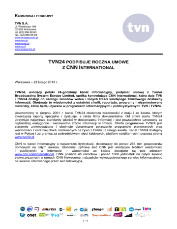 KOMUNIKAT PRASOWY TVN S.A. ul. Wiertnicza 166 02-952 Warszawa tel. (22) 856 60 60 fax. (22) 856 66 66 www.investor.tvn.pl www.tvn.pl www.onet.pl www.n.pl www.prasa.tvn.pl TVN24 PODPISUJE ROCZNĄ UMOWĘ Z CNN INTERNATIONAL Warszawa – 22 lutego 2013 r. TVN24, wiodący polski 24-godzinny kanał informacyjny, podpisał umowę z Turner Broadcasting System Europe Limited, spółką kontrolującą CNN International, która daje TVN i TVN24 dostęp do szeregu zasobów wideo i innych treści wiodącego światowego dostawcy informacji. Obejmuje to wiadomości z ostatniej chwili, reportaże, programy i niezmontowane materiały, które będą używane w programach informacyjnych i publicystycznych TVN i TVN24. Uruchomiony w sierpniu 2001 r. kanał TVN24 dostarcza wiadomości z kraju i ze świata, którym towarzyszą raporty specjalne i dyskusje, a także filmy dokumentalne. Od chwili startu TVN24 utrzymuje najwyższe standardy jakości w dostarczaniu informacji i jest powszechnie uznawany za najbardziej wiarygodne i niezawodne źródło informacji w Polsce. Oferta programowa TVN24 jest starannie zrównoważona i obejmuje dynamiczne połączenie programów planowanych oraz wiadomości z ostatniej chwili, nadawanych na żywo z Polski i z całego świata. Kanał TVN24 dostępny jest w Polsce i za granicą za pośrednictwem sieci kablowych, platform satelitarnych i poprzez stronę www.tvn24.pl. CNN to kanał informacyjny o najszerszej dystrybucji, docierający do ponad 268 mln gospodarstw domowych na całym świecie. Globalnie, cyfrowa sieć CNN jest wiodącym źródłem wiadomości i publicystyki w Internecie – wiadomości ze świata dostępne są pod adresem www.cnn.com/international. CNN posiada 45 ośrodków i ponad 1000 jednostek na całym świecie stowarzyszonych w ramach CNN Newsource, najczęściej wykorzystywanego serwisu informacyjnego na świecie oferowanego przez sieć telewizyjną. 1/4 *** Grupa TVN jest wiodącą prywatną grupą medialną w Polsce. Nadaje jedenaście kanałów telewizyjnych. TVN, główny kanał telewizyjny Grupy, jest na polskim rynku uznawany za czołowy program telewizyjny, oferujący wysokiej jakości programy rozrywkowe oraz rzetelne i niezależne audycje informacyjne. TVN7 to kanał telewizyjny o profilu filmowo-serialowym, uzupełniający ofertę programową TVN. TVN24 jest pierwszym polskim 24-godzinnym informacyjno-publicystycznym kanałem telewizyjnym. TVN CNBC jest kanałem informacyjnym o tematyce biznesowej, przygotowywanym we współpracy z CNBC Europe. TVN Meteo to pierwszy polski kanał telewizyjny o pogodzie. TVN Turbo jest pierwszym polskim kanałem tematycznym adresowanym do mężczyzn i zarazem pierwszym poświęconym głównie motoryzacji. TVN Style jest kanałem telewizyjnym poświęconym urodzie, stylom życia, modzie oraz zdrowiu adresowanym do kobiet. ITVN jest kanałem telewizyjnym skierowanym do widowni pochodzenia polskiego zamieszkałej za granicą, dostępnym w Europie, Ameryce Północnej i w Australii. Telezakupy Mango to jedyny w Polsce całodobowy kanał telesprzedażowy. NTL jest lokalnym kanałem telewizyjnym adresowanym do mieszkańców Radomska i okolic. Grupa TVN posiada 50,55% udziałów w firmie Stavka sp. z o.o., nadawcy TTV. TTV - kanał oferujący publicystykę, informację i dokument społeczny - dostępny w sieciach kablowych, na platformach cyfrowych oraz w ramach naziemnej telewizji cyfrowej. Do Grupy TVN należy również: TVN News & Services Agency, najbardziej wszechstronnie działająca agencja mediowa w Europie Środkowej i Wschodniej, która jako jedyna w regionie oferuje pełną kompleksowość usług. Fundacja TVN “nie jesteś sam”, skupiająca się na pomocy ludziom cierpiącym na nieuleczalne, wymagające kosztownego leczenia choroby. Przez wiele lat podopiecznymi Fundacji TVN były dzieci głuche i niedosłyszące, starające się o implanty ślimakowe oraz chorzy na mukowiscydozę. Ponadto, Fundacja TVN wspiera finansowo szpitale, domy dziecka i ośrodki rehabilitacji, pokrywając koszty remontów, zakupu sprzętu medycznego oraz karetek. 2/4 Do Grupy TVN należy również: tvn.pl - codzienne źródło informacji rozrywkowej związanej z show-biznesem. Na bieżąco aktualizowany serwis opisujący wydarzenia, bohaterów i programy znane nie tylko z anteny TVN. Umożliwia dostęp do szerokiej bazy materiałów wideo i fotogalerii oraz pełnych odcinków seriali i show telewizji TVN. tvnplayer.pl - platforma wideo na żądanie, umożliwiająca bezpłatny dostęp do największej biblioteki seriali, show i programów emitowanych w kanałach TVN. Dostępna również w wersjach mobilnych na urządzeniach z systemami Android, iOS, w konsolach PS3, w odbiornikach telewizyjnych wiodących producentów oraz w na platformie nc+. tvn24.pl - pierwszy w Polsce wortal informacyjny, który łączy w sobie tekst, dźwięk i obraz. Znajdują się w nim rozbudowane relacje wideo z najważniejszych wydarzeń w Polsce i na świecie. tvnmeteo.pl - najnowocześniejszy portal pogodowy w Polsce. Tworzony przez profesjonalną redakcję, internautów i widzów zainteresowanych tematyką meteo. Umożliwia sprawdzenie pogody w ponad 80 tys. miejsc w kraju i na świecie. tvnwarszawa.pl - projekt medialny poświęcony Warszawie i jej mieszkańcom. TVN Warszawa koncentrując się na życiu stolicy, oferuje wysokiej jakości treści o charakterze informacyjnym i rozrywkowym. kulinarni.pl – serwis internetowy o tematyce kulinarnej. Interaktywne kompendium wiedzy z zakresu współczesnej kuchni pełne autorskich inspiracji, przepisów najlepszych szefów kuchni prezentowanych w wersji wideo, a także newsów, porad i ciekawostek. Grupa TVN jest też właścicielem platformy n, która 1 grudnia 2012 r. rozpoczęła proces łączenia z CYFRĄ+, tworząc tym samym nc+, wiodącego operatora płatnej telewizji premium w Polsce. Platforma n – największa platforma HD w Polsce - zadebiutowała na rynku w 2006 roku, pozycjonując się jako najb