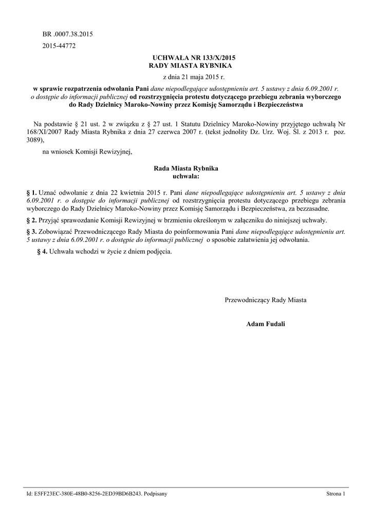 BR .0007.38.2015 2015-44772 UCHWAŁA NR 133/X/2015 RADY MIASTA RYBNIKA z dnia 21 maja 2015 r. w sprawie rozpatrzenia odwołania Pani dane niepodlegające udostępnieniu art. 5 ustawy z dnia 6.09.2001 r. o dostępie do informacji publicznej od rozstrzygnięcia protestu dotyczącego przebiegu zebrania wyborczego do Rady Dzielnicy Maroko-Nowiny przez Komisję Samorządu i Bezpieczeństwa Na podstawie § 21 ust. 2 w związku z § 27 ust. 1 Statutu Dzielnicy Maroko-Nowiny przyjętego uchwałą Nr 168/XI/2007 Rady Miasta Rybnika z dnia 27 czerwca 2007 r. (tekst jednolity Dz. Urz. Woj. Śl. z 2013 r. poz. 3089), na wniosek Komisji Rewizyjnej, Rada Miasta Rybnika uchwala: § 1. Uznać odwołanie z dnia 22 kwietnia 2015 r. Pani dane niepodlegające udostępnieniu art. 5 ustawy z dnia 6.09.2001 r. o dostępie do informacji publicznej od rozstrzygnięcia protestu dotyczącego przebiegu zebrania wyborczego do Rady Dzielnicy Maroko-Nowiny przez Komisję Samorządu i Bezpieczeństwa, za bezzasadne. § 2. Przyjąć sprawozdanie Komisji Rewizyjnej w brzmieniu określonym w załączniku do niniejszej uchwały. § 3. Zobowiązać Przewodniczącego Rady Miasta do poinformowania Pani dane niepodlegające udostępnieniu art. 5 ustawy z dnia 6.09.2001 r. o dostępie do informacji publicznej o sposobie załatwienia jej odwołania. § 4. Uchwała wchodzi w życie z dniem podjęcia. Przewodniczący Rady Miasta Adam Fudali Id: E5FF23EC-380E-48B0-8256-2ED39BD6B243. Podpisany Strona 1 Załącznik do Uchwały Nr 133/X/2015 Rady Miasta Rybnika z dnia 21 maja 2015 r. Sprawozdanie Komisji Rewizyjnej z dnia 11 maja 2015 r. 1. Komisja Rewizyjna na posiedzeniach w dniach 7 i 11 maja br. rozpatrzyła odwołanie Pani dane niepodlegające udostępnieniu art. 5 ustawy z dnia 6.09.2001 r. o dostępie do informacji publicznej od rozstrzygnięcia Komisji Samorządu i Bezpieczeństwa z dnia 8 kwietnia 2015 roku w sprawie wyborów do Rady Dzielnicy Rybnik Maroko-Nowiny. Wydana decyzja była dla Pani dane niepodlegające udostępnieniu art. 5 ustawy z dnia 6.09.2001 r. o dostępie do informacji publicznej niesatysfakcjonująca, dlatego zwróciła się do Rady Miasta Rybnika z prośbą o ponowne przeanalizowanie zarzutów. 2. Komisja Rewizyjna zapoznała się z treścią protestu wyborczego, rozstrzygnięciem Komisji Samorządu i Bezpieczeństwa oraz odwołaniem skarżącej. Pani dane niepodlegające udostępnieniu art. 5 ustawy z dnia 6.09.2001 r. o dostępie do informacji publicznej została zaproszona na posiedzenie Komisji Rewizyjnej na dzień 7 maja, w celu przedstawienia swojego stanowiska, z czego nie skorzystała. Na wspomnianym wyżej posiedzeniu Komisji Rewizyjnej był obecny przewodniczący Komisji Samorządu i Bezpieczeństwa Pan Mariusz Wiśniewski, który omówił poszczególne punkty skargi i przedstawił wypracowane konkluzje. 3. Komisja Rewizyjna ustaliła, że wybory do Rady Dzielnicy Rybnik - Maroko - Nowiny odbyły się 25 marca br. Pani dane niepodlegające udostępnieniu art. 5 ustawy z dnia 6.09.2001 r. o dostępie do informacji publicznej złożyła protest wyborczy w dniu 1 kwietnia, a odwołanie od rozstrzygnięcia Komisji Samorządu i Bezpieczeństwa 22 kwietnia zgodnie z terminami przewidzianymi w statucie Rady Dzielnicy. Protest oraz odwołanie zawierało 5 punktów, które dotyczyły niewłaściwego przebiegu zebrania, co zdaniem skarżącej miało wpływ na ważność przeprowadzonych wyborów. Odnosząc się do poszczególnych punktów skargi: 1) W kontekście braku ustalenia godziny zakończenia zebrania sprawozdawczo-wyborczego oraz braku możliwości pobrania mandatu w trakcie trwania zebrania. Nie ma podstawy prawnej do uznania tego argumentu, bowiem Statut Rady Dzielnicy Rybnik – MarokoNowiny przyjętego uchwałą nr 168/XI/2007 Rady Miasta Rybnika z dnia 27 czerwca 2007 r. z późniejszymi zmianami (Rozdział 3 § 15 p.1) mówi że: „Wyborów do Rady dokonuje się na zebraniu wyborczym mieszkańców Dzielnicy, a zarządza je Rada Miasta, określając równocześnie termin i miejsce zebrania”. 2) W odniesieniu do braku sprawdzania adresu zameldowania przy wydawaniu mandatu. Rozdział 3 § 15 p. 4 Statutu mówi: „Mieszkańcy obecni na zebraniu wpisują się na listę obecności podając imię, nazwisko oraz adres zamieszkania”. Termin: „adres zamieszkania” nie jest tym samym co „adres zameldowania”. Nie ma także możliwości prawnych, by zweryfikować stałe miejsce zamieszkania osób uczestniczących w zebraniu. W tym przypadku podanie adresu zamieszkania ma charakter deklaracyjny i jest oświadczeniem mieszkańca. 3) Statut Rady Dzielnicy nie posiada zapisu umożliwiającego głosowanie przez pełnomocnika, a przepisy Kodeksu Wyborczego nie mają zastosowania do sposobu przeprowadzenia wyborów do jednostek pomocniczych samorządów terytorialnych. Artykuł 5 ustawy o samorządzie gminnym pozostawia swobodę w tym zakresie prawu miejscowemu, co do definicji, zasad tworzenia, łączenia, podziału oraz znoszenia jednostek pomocniczych. 4) Zachowanie tajności głosowania w trakcie wyborów do Rady Dzielnicy zostało dochowane, ponieważ każdy uczestnik zebrania miał możliwość oddania swojego głosu bez obecności osób trzecich. Jest to jednak tylko możliwość, a nie obowiązek. Zasada tajności gwarantuje wyborcy, że nikomu poza nim samym nie będzie znana treść jego decyzji wyborczej. Tym samym tajność głosowania jest gwarancją nieskrępowanego wyrażania indywidualnych preferencji wyborczych, a przez to zapewnieniem braku jakichkolwiek negatywnych konsekwencji dla wyborcy, związanych z kierunkiem głosowania. 5) Wyborcy niepełnosprawni biorą udział w zebraniu sprawozdawczo-wyborczym na takich samych zasadach jak pozostali wyborcy. Nie wszystkie obiekty w których odbywają się wybory do Rad Dzielnic są dostosowane do potrzeb osób niepełnosprawnych – nie posiadają barier architektonicznych. Po uprzednim poinformowaniu Id: E5FF23EC-380E-48B0-8256-2ED39
