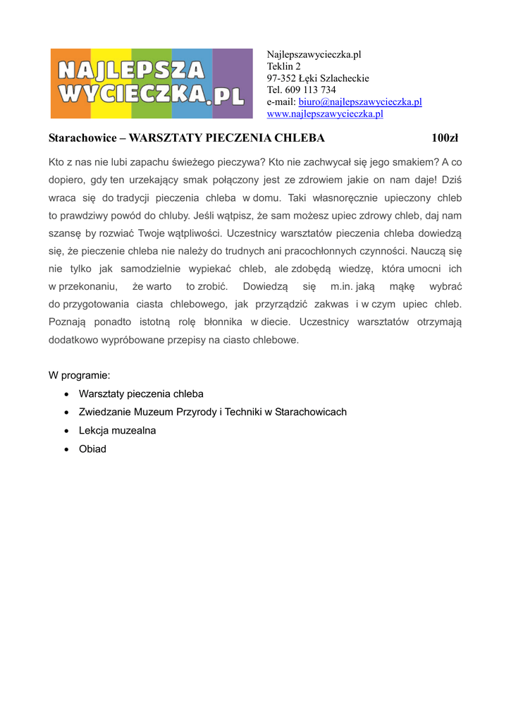 Najlepszawycieczka.pl Teklin 2 97-352 Łęki Szlacheckie Tel. 609 113 734 e-mail: [email protected] www.najlepszawycieczka.pl Starachowice – WARSZTATY PIECZENIA CHLEBA 100zł Kto z nas nie lubi zapachu świeżego pieczywa? Kto nie zachwycał się jego smakiem? A co dopiero, gdy ten urzekający smak połączony jest ze zdrowiem jakie on nam daje! Dziś wraca się do tradycji pieczenia chleba w domu. Taki własnoręcznie upieczony chleb to prawdziwy powód do chluby. Jeśli wątpisz, że sam możesz upiec zdrowy chleb, daj nam szansę by rozwiać Twoje wątpliwości. Uczestnicy warsztatów pieczenia chleba dowiedzą się, że pieczenie chleba nie należy do trudnych ani pracochłonnych czynności. Nauczą się nie tylko jak samodzielnie wypiekać chleb, ale zdobędą wiedzę, która umocni ich w przekonaniu, że warto to zrobić. Dowiedzą się m.in. jaką mąkę wybrać do przygotowania ciasta chlebowego, jak przyrządzić zakwas i w czym upiec chleb. Poznają ponadto istotną rolę błonnika w diecie. Uczestnicy warsztatów otrzymają dodatkowo wypróbowane przepisy na ciasto chlebowe. W programie: Warsztaty pieczenia chleba Zwiedzanie Muzeum Przyrody i Techniki w Starachowicach Lekcja muzealna Obiad