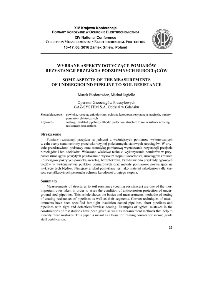 XIV Krajowa Konferencja POMIARY KOROZYJNE W OCHRONIE ELEKTROCHEMICZNEJ XIV National Conference CORROSION MEASUREMENTS IN ELECTROCHEMICAL PROTECTION 15–17. 06. 2016 Zamek Gniew, Poland WYBRANE ASPEKTY DOTYCZĄCE POMIARÓW REZYSTANCJI PRZEJŚCIA PODZIEMNYCH RUROCIĄGÓW SOME ASPECTS OF THE MEASUREMENTS OF UNDREGROUND PIPELINE TO SOIL RESISTANCE Marek Fiedorowicz, Michał Jagiełło Operator Gazociągów Przesyłowych GAZ-SYSTEM S.A. Oddział w Gdańsku Słowa kluczowe: Keywords: powłoka, rurociąg zaizolowany, ochrona katodowa, rezystancja przejścia, punkty pomiarów elektrycznych coating, insulated pipeline, cathodic protection, structure to soil resistance (coating resistance), test stations Streszczenie Pomiary rezystancji przejścia są jednymi z ważniejszych pomiarów wykonywanych w celu oceny stanu ochrony przeciwkorozyjnej podziemnych, stalowych rurociągów. W artykule przedstawiono podstawy oraz metodykę pomiarową wyznaczania rezystancji przejścia rurociągów i ich odcinków. Wskazano właściwe techniki wykonywania pomiarów w przypadku rurociągów pokrytych powłokami o wysokim stopniu szczelności, rurociągów krótkich i rurociągów pokrytych powłoką szczelną, bezdefektową. Przedstawiono przykłady typowych błędów w wykonawstwie punktów pomiarowych oraz metody pomiarowe pozwalające na wykrycie tych błędów. Niniejszy artykuł pomyślany jest jako materiał szkoleniowy dla kursów certyfikacyjnych personelu ochrony katodowej drugiego stopnia. Summary Measurements of structures to soil resistance (coating resistances) are one of the most important ones taken in order to asses the condition of anticorrosion protection of underground steel pipelines. This article shows the basics and measurements methodic of setting of coating resistances of pipelines as well as their segments. Correct techniques of measurements have been specified for: tight insulation coated pipelines, short pipelines and pipelines with tight and defectless/flawless coating. Examples of typical mistakes in the constructions of test stations have been given as well as measurement methods that help to identify these mistakes. This paper is meant as a basis for training courses for second grade staff certification. 23 1. Wstęp Pomiary rezystancji przejścia podziemnych, metalowych rurociągów izolowanych obecnie są bardzo ważnym faktorem w badaniach ochrony przeciwkorozyjnej – z roli pomiarów pomocniczych ewoluowały do roli pomiarów ważkich, a niekiedy – kluczowych. Zwłaszcza w przypadku rurociągów pokrytych powłokami o wysokim poziomie szczelności, wyniki tych pomiarów dostarczają ważnych, pierwszoplanowych informacji. Rezystancja przejścia rurociągu jest zależna od jego zewnętrznej powierzchni bocznej, rodzaju powłoki izolacyjnej (rodzaju materiału powłoki, rezystywności tego materiału i grubości), wielkości powierzchni odsłoniętej rurociągu, stykającej się z otaczającym środowiskiem elektrolitycznym oraz od rezystywności tego środowiska. W przypadku odcinków i całych rurociągów o długościach mniejszych od długości charakterystycznej, rezystancja przejścia rurociągu/powłoki RCO jest wypadkową rezystancją równoległego połączenia zastępczej rezystancji przejścia (uziemienia) w defektach izolacji Rdef i rezystancji przejścia powłoki bez defektów RCO0: 1 1 1 = + RCO Rdef RCO0 gdzie: RCO Rdef RCO0 (1) – rezystancja przejścia odcinka rurociągu, – wypadkowa (zastępcza) rezystancja przejścia w defektach powłoki, – rezystancja przejścia powłoki bez defektów. Zatem RCO = RCO0 × Rdef RCO0 + Rdef (2) Biorąc pod uwagę, że rezystancja przejścia w defektach powłoki Rdef jest wypadkową równoległego połączenia rezystancji przejścia (uziemienia) w poszczególnych defektach powłoki Rdefi, a RCO0 jest o wiele rzędów wielkości większa niż Rdef, to w rezultacie rezystancja przejścia odcinka rurociągu pokrytego powłoką z nieszczelnościami (defektami) jest wypadkową rezystancją równoległego połączenia rezystancji uziemień poszczególnych defektów wg zależności: 1 1 =∑ RCO R i defi (3) gdzie: RCO – rezystancja przejścia odcinka rurociągu, Rdefi – rezystancja przejścia i-tego defektu powłoki. Zatem rezystancja przejścia odcinka rurociągu zależy przede wszystkim ilości i wielkości defektów (nieciągłości) w powłoce izolacyjnej. Wyniki pomiarów rezystancji lub jednostkowych rezystancji przejścia wykorzystuje się w: • 24 ocenach powłok izolacyjnych rurociągów „po zasypaniu” (im większa jest łączna powierzchnia odsłonięta rurociągu, stykająca się ze środowiskiem elektrolitycznym, tym mniejsza jest rezystancja przejścia); • monitorowaniu ingerencji stron trzecich, naruszających powłokę izolacyjną rurociągu (powstanie nowej nieciągłości w powłoce powoduje zmniejszenie rezystancji przejścia odcinka, a czasami – całego rurociągu); • ocenach skuteczności ochrony katodowej rurociągów zaizolowanych powłokami o wysokim poziomie szczelności (zasady tej metody podano w [1]); • ocenach skuteczności ochrony przeciwkorozyjnej opartej na bezdefektowych powłokach izolacyjnych. Tzw. powierzchniowa jednostkowa rezystancja przejścia rCO jest średnią rezystancją przejścia powierzchni rurociągu o wielkości jednostki, np. 1 m2, uwzględniającą występowanie defektów izolacji: rCO = RCO x S (4) gdzie: RCO – rezystancja przejścia odcinka/rurociągu wg zał. (1) w [Ω], S – zewnętrzną powierzchnią boczną ocenianego odcinka/rurociągu w [m2]. Przyjmuje się, że w przypadku rurociągów pokrytych powłokami PE i PP rCO ≥ 108 Ωm2 jest wyznacznikem bezdefektowości powłoki odcinka rurociągu. W gazownictwie od 1995 r. przepisy państwowe - kolejne rozporządzenia, w tym aktualnie obowiązujące [2], w sprawie warunków technicznych, jakim powinny odpowiadać sieci gazowe i ich usytuowanie wymagają, aby w dokumentacji projektowej stalowego gazociągu
