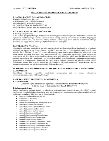 Nr sprawy : TT-15.1-7/2016 Dzierżoniów, dnia 21.01.2016 r. OGŁOSZENIE O ZAMÓWIENIU SEKTOROWYM I. NAZWA I ADRES ZAMAWIAJĄCEGO Wodociągi i Kanalizacja Sp. z o.o. ul. Kilińskiego 25A, 58-200 Dzierżoniów woj. dolnośląskie, powiat Dzierżoniów tel. (74) 832-37-01 do 04, fax (74) 832-37-05 [email protected], www.wik.dzierzoniow.pl II. OKREŚLENIE TRYBU ZAMÓWIENIA 1. Przetarg nieograniczony. 2. W wyniku przeprowadzonego postępowania Zamawiający zawrze maksymalnie dwie umowy ramowe na wykonanie przedmiotowego zadania. Celem zawarcia umowy ramowej jest ustalenie warunków dotyczących przedmiotu zamówienia. Po zawarciu umowy ramowej Zamawiający może udzielić zamówienia, którego przedmiot jest objęty umową ramową, w trybie zamówienia z wolnej ręki. III. PODSTAWA PRAWNA „Regulamin udzielania zamówień o wartości zamówienia nie przekraczającej kwot określonych w przepisach wydanych na podstawie art. 11 ust. 8 ustawy z dnia 29 stycznia 2004 r. Prawo zamówień publicznych (tekst jednolity Dz.U. 2010 nr 113 poz. 759 ze zm.) udzielanych w celu wykonywania działalności sektorowej, przez którą należy rozumieć tworzenie sieci przeznaczonych do świadczenia publicznych usług związanych z produkcją lub dystrybucją wody pitnej lub dostarczania wody pitnej do takich sieci lub kierowania takimi sieciami oraz związanych z kanalizacją i oczyszczaniem ścieków oraz działalnością związaną z pozyskiwaniem wody pitnej w Wodociągach i Kanalizacji Sp. z o.o. w Dzierżoniowie z siedzibą: ul. Kilińskiego 25a, 58-200 Dzierżoniów zwany dalej w treści ogłoszenia „Regulaminem udzielania zamówień”, który dostępny jest na stronie internetowej www.wik.dzierzoniow.pl w folderze „Przetargi”. IV. OKREŚLENIE SPOSOBU UZYSKANIA SPECYFIKACJI ISTOTNYCH WARUNKÓW ZAMÓWIENIA Specyfikacja istotnych warunków zamówienia www.wik.dzierzoniow.pl w folderze „Przetargi”. zamieszczona jest na stronie internetowej V. OKREŚLENIE PRZEDMIOTU ZAMÓWIENIA 1. Nazwa zadania: „Dostawa części zamiennych, ogumienia i akumulatorów do środków transportu WiK Sp. z o.o. w Dzierżoniowie w latach 2016-2017”. 2. Zakres zamówienia: Zakres zamówienia obejmuje dostawy w okresie od dnia podpisania umowy do dnia 31.12.2017 r. części zamiennych, ogumienia i akumulatorów do niżej wymienionego sprzętu transportowego i maszyn budowlanych będących w posiadaniu WiK Sp. z o.o. w Dzierżoniowie: koparko – ładowarki Case 580 SR mini koparka Komatsu mini koparka JCB żuraw samochodowy Star 660 Hydros R061 samochody osobowe Fiat Panda samochód osobowy Skoda Octawia 1600 samochody dostawcze Fiat Doblo samochód dostawczy Fiat Ducato samochody dostawcze Gazela samochody dostawcze Citroen Jumper samochód dostawczy Citroen Jumpy samochód dostawczy Citroen C-15 samochody dostawcze Volkswagen Caddy samochody dostawcze Volkswagen T5 samochód dostawczy Volkswagen Crafter samochód dostawczy Nissan - NP-300 samochód dostawczy Nissan Nawarra samochody ciężarowe Iveco Daily samochody ciężarowe Iveco EuroCargo samochody ciężarowe MAN samochód ciężarowy DAF samochód ciężarowy Jelcz Dostawy części zamiennych, ogumienia i akumulatorów do środków transportu następować będą na podstawie telefonicznych zgłoszeń Zamawiającego potwierdzających potrzebę dostawy loco magazyn na bazie WiK Sp. z o.o. przy ul. Kilińskiego 25A w Dzierżoniowie. W zamówieniu określona zostanie marka i typ pojazdu, nazwa części lub podzespołu, ilość sztuk. Koszty transportu zamówionych części zamiennych do magazynu ponosi Wykonawca. Zamawiający zastrzega sobie prawo do kontroli ilości i jakości dostarczonej partii części zamiennych, ogumienia i akumulatorów. W przypadku konieczności zakupu części zamiennych do środków transportu, ogumienia i akumulatorów nie ujętych w SIWZ Wykonawca dostarczy je z marżą jak w pozostałych pozycjach cennika ofertowego. Zamawiający zastrzega sobie prawo zakupu – w zależności od aktualnych potrzeb - większej lub mniejszej ilości części zamiennych do środków transportu po cenach jednostkowych ustalonych w wyniku przetargu. Wyszczególnienie niektórych części zamiennych, ogumienia i akumulatorów do środków transportu wraz z orientacyjną ilością zapotrzebowania zawarte jest w SIWZ. VI. OPIS CZĘŚCI ZAMÓWIENIA, JEŻELI ZAMAWIAJĄCY DOPUSZCZA SKŁADANIE OFERT CZĘŚCIOWYCH. Zamawiający nie dopuszcza składania ofert częściowych. VII. INFORMACJA O MOŻLIWOŚCI ZŁOŻENIA OFERTY WARIANTOWEJ Zamawiający nie dopuszcza składania ofert wariantowych. Oferta alternatywna (wariantowa) nie będzie brana pod uwagę i zostanie odrzucona wraz z ofertą podstawową. VIII. TERMIN WYKONANIA ZAMÓWIENIA Wymagany termin realizacji zamówienia: sukcesywne (w miarę potrzeb) dostawy części zamiennych, ogumienia i akumulatorów w okresie od dnia podpisania umowy do dnia 31.12.2017 r. Wymagany termin dostawy zamówionej partii części zamiennych, ogumienia i akumulatorów: do 2 dni licząc od daty telefonicznego zgłoszenia zapotrzebowania przez Zamawiającego. IX. OPIS WARUNKÓW UDZIAŁU W POSTĘPOWANIU DOKONYWANIA OCENY SPEŁNIANIA TYCH WARUNKÓW ORAZ SPOSOBU W przetargu mogą wziąć udział Wykonawcy uprawnieni do występowania w obrocie prawnym, spełniający warunki zawarte w rozdziale IV ust. 4.1 „Regulaminu udzielania zamówień” oraz inne warunki określone w Specyfikacji istotnych warunków zamówienia. X. WYMAGANIA DOTYCZĄCE WADIUM Warunkiem udziału w postępowaniu jest wpłacenie wadium o wartości 1 500,00 zł (słownie: tysiąc pięćset zł). XI. KRYTERIA OCENY OFERT I ICH ZNACZENIE Cena – 100% XII. MIEJSCE I TERMIN SKŁADANIA I OTWARCIA OFERT Oferty w zamkniętej kopercie z napisem: „Wodociągi i Kanalizacja Spółka z o.o., ul. Kilińskiego 25A, 58-200 Dzierżoniów. Oferta przetargowa – „Dostawa części zamiennych, ogumienia i akumulatorów do środków transportu WiK Sp. z o.o. w Dzierżoniowie w lata