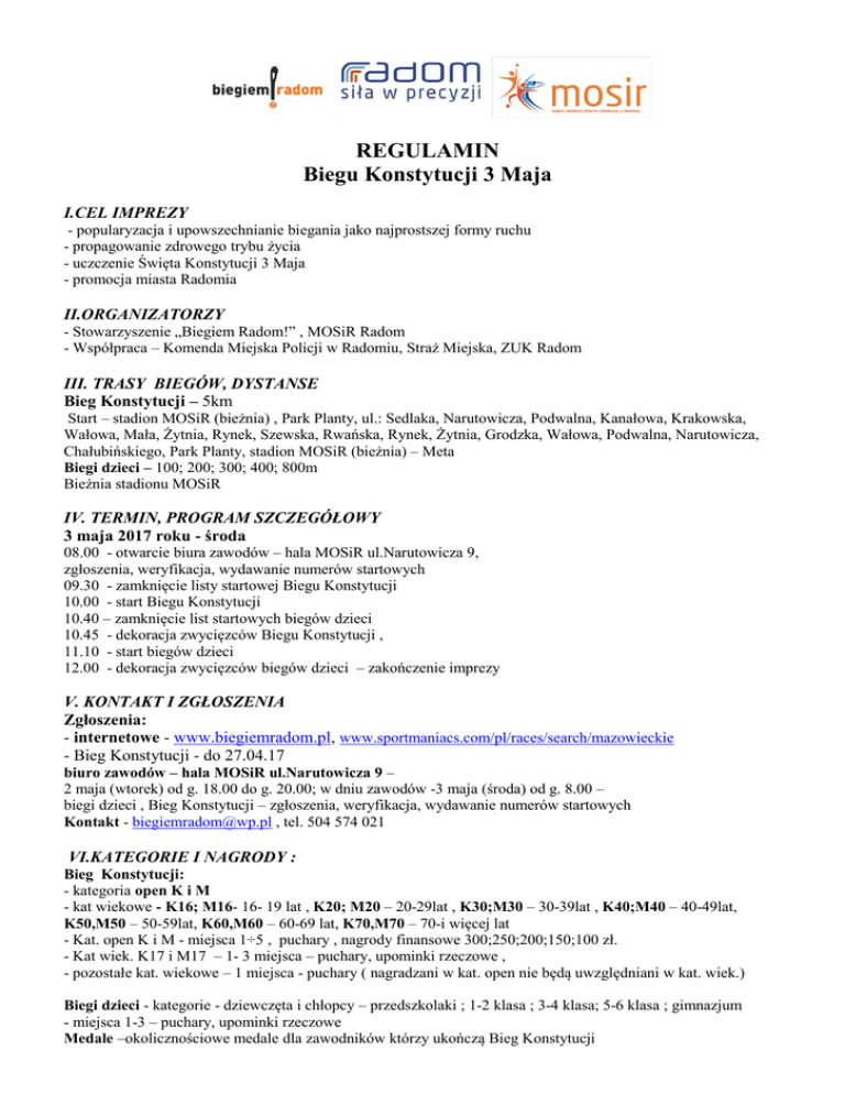 REGULAMIN Biegu Konstytucji 3 Maja I.CEL IMPREZY - popularyzacja i upowszechnianie biegania jako najprostszej formy ruchu - propagowanie zdrowego trybu życia - uczczenie Święta Konstytucji 3 Maja - promocja miasta Radomia II.ORGANIZATORZY - Stowarzyszenie „Biegiem Radom!” , MOSiR Radom - Współpraca – Komenda Miejska Policji w Radomiu, Straż Miejska, ZUK Radom III. TRASY BIEGÓW, DYSTANSE Bieg Konstytucji – 5km Start – stadion MOSiR (bieżnia) , Park Planty, ul.: Sedlaka, Narutowicza, Podwalna, Kanałowa, Krakowska, Wałowa, Mała, Żytnia, Rynek, Szewska, Rwańska, Rynek, Żytnia, Grodzka, Wałowa, Podwalna, Narutowicza, Chałubińskiego, Park Planty, stadion MOSiR (bieżnia) – Meta Biegi dzieci – 100; 200; 300; 400; 800m Bieżnia stadionu MOSiR IV. TERMIN, PROGRAM SZCZEGÓŁOWY 3 maja 2017 roku - środa 08.00 - otwarcie biura zawodów – hala MOSiR ul.Narutowicza 9, zgłoszenia, weryfikacja, wydawanie numerów startowych 09.30 - zamknięcie listy startowej Biegu Konstytucji 10.00 - start Biegu Konstytucji 10.40 – zamknięcie list startowych biegów dzieci 10.45 - dekoracja zwycięzców Biegu Konstytucji , 11.10 - start biegów dzieci 12.00 - dekoracja zwycięzców biegów dzieci – zakończenie imprezy V. KONTAKT I ZGŁOSZENIA Zgłoszenia: - internetowe - www.biegiemradom.pl, www.sportmaniacs.com/pl/races/search/mazowieckie - Bieg Konstytucji - do 27.04.17 biuro zawodów – hala MOSiR ul.Narutowicza 9 – 2 maja (wtorek) od g. 18.00 do g. 20.00; w dniu zawodów -3 maja (środa) od g. 8.00 – biegi dzieci , Bieg Konstytucji – zgłoszenia, weryfikacja, wydawanie numerów startowych Kontakt - [email protected] , tel. 504 574 021 VI.KATEGORIE I NAGRODY : Bieg Konstytucji: - kategoria open K i M - kat wiekowe - K16; M16- 16- 19 lat , K20; M20 – 20-29lat , K30;M30 – 30-39lat , K40;M40 – 40-49lat, K50,M50 – 50-59lat, K60,M60 – 60-69 lat, K70,M70 – 70-i więcej lat - Kat. open K i M - miejsca 1÷5 , puchary , nagrody finansowe 300;250;200;150;100 zł. - Kat wiek. K17 i M17 – 1- 3 miejsca – puchary, upominki rzeczowe , - pozostałe kat. wiekowe – 1 miejsca - puchary ( nagradzani w kat. open nie będą uwzględniani w kat. wiek.) Biegi dzieci - kategorie - dziewczęta i chłopcy – przedszkolaki ; 1-2 klasa ; 3-4 klasa; 5-6 klasa ; gimnazjum - miejsca 1-3 – puchary, upominki rzeczowe Medale –okolicznościowe medale dla zawodników którzy ukończą Bieg Konstytucji VII. UCZESTNICTWO - do startu w Biegu Konstytucji dopuszczeni zostaną zawodnicy ur. w 2000 roku i starsi; - zawodnicy niepełnoletni muszą posiadać zgodę rodziców, lub opiekunów na uczestnictwo; - zgłoszenie do biegu i dokonanie opłaty startowej jest równoznaczne z akceptacją regulaminu biegu; - wypełniając formularz zgłoszeniowy uczestnik oświadcza , że jest zdrowy i zdolny do udziału w zawodach; - każdy zawodnik powinien zapoznać się z regulaminem biegu i jest zobowiązany do jego przestrzegania; VIII. OPŁATY STARTOWE - SPRAWY FINANSOWE Opłata startowa: Bieg Konstytucji przelew w systemie e-przelewu – 1. termin do 28.02.17 – 20 zł, 2. termin do 27.04.17 – 30 zł biuro zawodów - 40 zł. Członkowie Stowarzyszenia „Biegiem Radom!” w systemie e-przelewu – 1.termin -10zł , 2.termin – 20 zł - w biurze zawodów - 30zł. Zwolnieni z opłaty startowej – zawodnicy z kat. wiekowej K17 i M17 i osoby, które w dniu zawodów będą miały ukończone 65 lat . W uzasadnionych sytuacjach, organizator może zwolnić zawodnika z opłaty startowej. Biegi dzieci – bez opłaty startowej, Koszty organizacyjne ponoszą organizatorzy IX. POSTANOWIENIA KOŃCOWE - ostateczna interpretacja regulaminu należy do organizatora; - Bieg Konstytucji z elektronicznym pomiarem czasu; - uczestnicy biegu biorą udział w zawodach na własną odpowiedzialność, wskazane jest ubezpieczenie na własny koszt od następstw nieszczęśliwych wypadków; PATRONAT HONOROWY Prezydent Miasta Radomia – Radosław Witkowski PATRONAT MEDIALNY Telewizja Dami; Zebrra TV, Radio Plus; Radio Rekord; Radio Eska, Radio Mazowsze , Echo Dnia; Gazeta Wyborcza, Teraz Radom ; RadomSport.pl: Sportradom.pl ; radom24.pl ; cozadzien.pl
