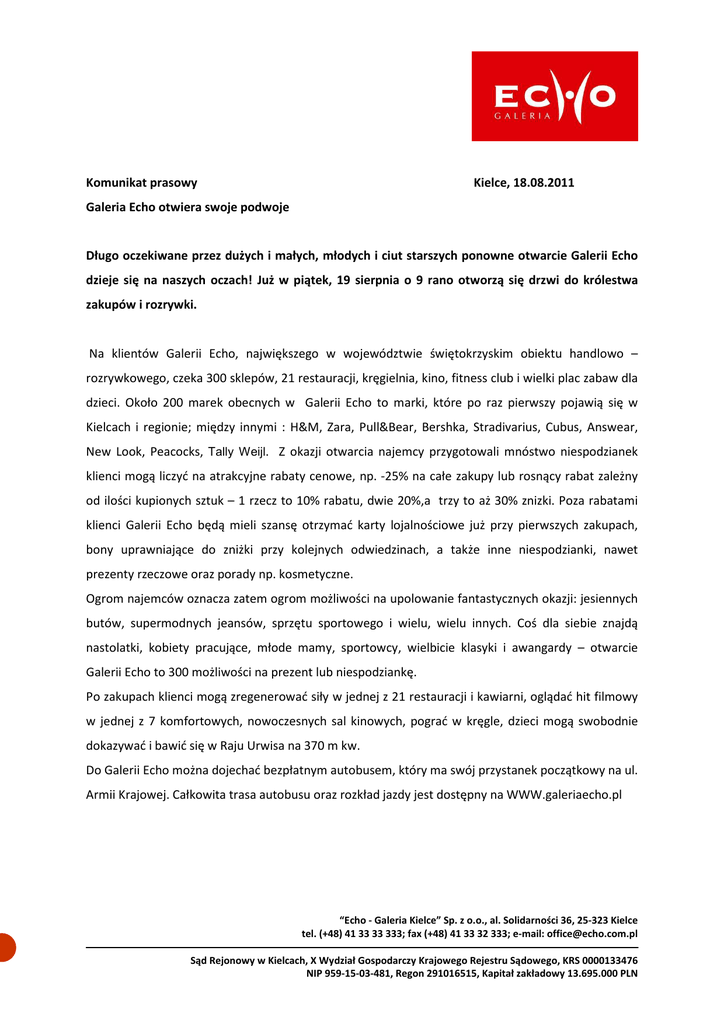 Komunikat prasowy Kielce, 18.08.2011 Galeria Echo otwiera swoje podwoje Długo oczekiwane przez dużych i małych, młodych i ciut starszych ponowne otwarcie Galerii Echo dzieje się na naszych oczach! Już w piątek, 19 sierpnia o 9 rano otworzą się drzwi do królestwa zakupów i rozrywki. Na klientów Galerii Echo, największego w województwie świętokrzyskim obiektu handlowo – rozrywkowego, czeka 300 sklepów, 21 restauracji, kręgielnia, kino, fitness club i wielki plac zabaw dla dzieci. Około 200 marek obecnych w Galerii Echo to marki, które po raz pierwszy pojawią się w Kielcach i regionie; między innymi : H&M, Zara, Pull&Bear, Bershka, Stradivarius, Cubus, Answear, New Look, Peacocks, Tally Weijl. Z okazji otwarcia najemcy przygotowali mnóstwo niespodzianek klienci mogą liczyć na atrakcyjne rabaty cenowe, np. -25% na całe zakupy lub rosnący rabat zależny od ilości kupionych sztuk – 1 rzecz to 10% rabatu, dwie 20%,a trzy to aż 30% znizki. Poza rabatami klienci Galerii Echo będą mieli szansę otrzymać karty lojalnościowe już przy pierwszych zakupach, bony uprawniające do zniżki przy kolejnych odwiedzinach, a także inne niespodzianki, nawet prezenty rzeczowe oraz porady np. kosmetyczne. Ogrom najemców oznacza zatem ogrom możliwości na upolowanie fantastycznych okazji: jesiennych butów, supermodnych jeansów, sprzętu sportowego i wielu, wielu innych. Coś dla siebie znajdą nastolatki, kobiety pracujące, młode mamy, sportowcy, wielbicie klasyki i awangardy – otwarcie Galerii Echo to 300 możliwości na prezent lub niespodziankę. Po zakupach klienci mogą zregenerować siły w jednej z 21 restauracji i kawiarni, oglądać hit filmowy w jednej z 7 komfortowych, nowoczesnych sal kinowych, pograć w kręgle, dzieci mogą swobodnie dokazywać i bawić się w Raju Urwisa na 370 m kw. Do Galerii Echo można dojechać bezpłatnym autobusem, który ma swój przystanek początkowy na ul. Armii Krajowej. Całkowita trasa autobusu oraz rozkład jazdy jest dostępny na WWW.galeriaecho.pl “Echo - Galeria Kielce” Sp. z o.o., al. Solidarności 36, 25-323 Kielce tel. (+48) 41 33 33 333; fax (+48) 41 33 32 333; e-mail: [email protected] Sąd Rejonowy w Kielcach, X Wydział Gospodarczy Krajowego Rejestru Sądowego, KRS 0000133476 NIP 959-15-03-481, Regon 291016515, Kapitał zakładowy 13.695.000 PLN Godziny otwarcia Galerii Echo Galeria HANDLOWA KINO 09.00 - 21.00 pon - sobota zgodnie z repertuarem 10.00 - 20.00 niedziela Pure Health & Fitn ess 06.30 - 22.30 pon - Piątek TESCO 08.00 - 23.00 pon - sobota 08.00 - 20.00 sobota – niedziela 09.00 - 23.00 niedziela MK Bowling - Kręgielnia DEKORA DA 10.00 - 21.00 pon - sobota 10.00 - 20.00 niedziela 10.00 - 02.00 niedziela - czwartek 10.00 - 04.00 piątek - sobota “Echo - Galeria Kielce” Sp. z o.o., al. Solidarności 36, 25-323 Kielce tel. (+48) 41 33 33 333; fax (+48) 41 33 32 333; e-mail: [email protected] Sąd Rejonowy w Kielcach, X Wydział Gospodarczy Krajowego Rejestru Sądowego, KRS 0000133476 NIP 959-15-03-481, Regon 291016515, Kapitał zakładowy 13.695.000 PLN