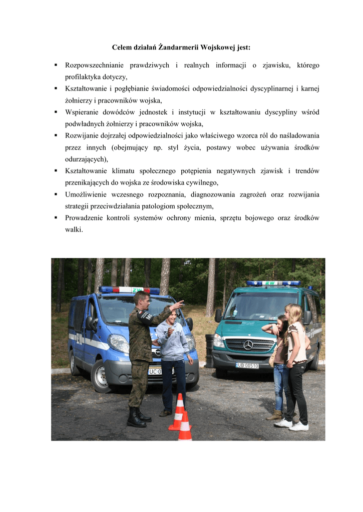 Celem działań Żandarmerii Wojskowej jest: Rozpowszechnianie prawdziwych i realnych informacji o zjawisku, którego profilaktyka dotyczy, Kształtowanie i pogłębianie świadomości odpowiedzialności dyscyplinarnej i karnej żołnierzy i pracowników wojska, Wspieranie dowódców jednostek i instytucji w kształtowaniu dyscypliny wśród podwładnych żołnierzy i pracowników wojska, Rozwijanie dojrzałej odpowiedzialności jako właściwego wzorca ról do naśladowania przez innych (obejmujący np. styl życia, postawy wobec używania środków odurzających), Kształtowanie klimatu społecznego potępienia negatywnych zjawisk i trendów przenikających do wojska ze środowiska cywilnego, Umożliwienie wczesnego rozpoznania, diagnozowania zagrożeń oraz rozwijania strategii przeciwdziałania patologiom społecznym, Prowadzenie kontroli systemów ochrony mienia, sprzętu bojowego oraz środków walki. Obszary prowadzenia działalności profilaktycznej przez Żandarmerię Wojskową: Przeciwdziałanie zażywania substancji psychoaktywnych, Profilaktyka zachowań związanych z przemocą emocjonalną w miejscu pracy, Bezpieczeństwo cyberprzestrzeni i użytkowników sieci, Przeciwdziałanie korupcji, Bezpieczeństwo w ruchu drogowym, Zabezpieczenie i ochrona obiektów imienia wojskowego, Wydawanie pozwoleń na broń oraz nadzór nad sposobem jej przechowywania.