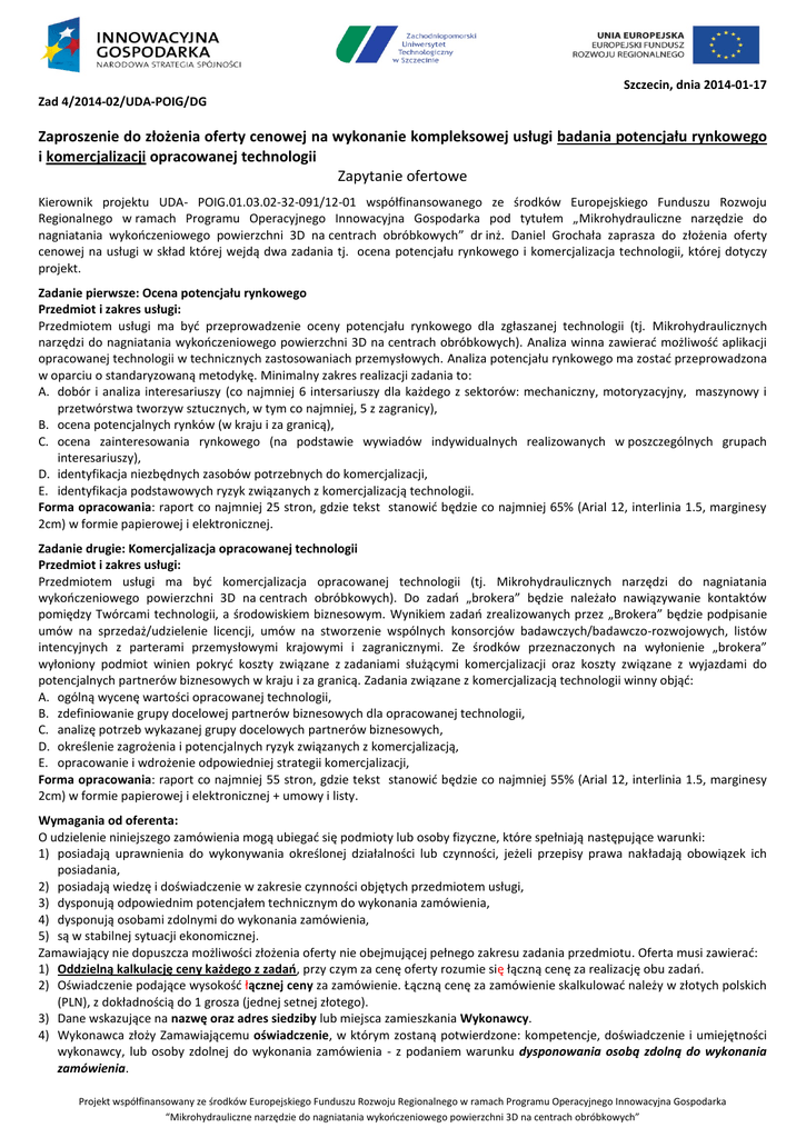 Szczecin, dnia 2014-01-17 Zad 4/2014-02/UDA-POIG/DG Zaproszenie do złożenia oferty cenowej na wykonanie kompleksowej usługi badania potencjału rynkowego i komercjalizacji opracowanej technologii Zapytanie ofertowe Kierownik projektu UDA- POIG.01.03.02-32-091/12-01 współfinansowanego ze środków Europejskiego Funduszu Rozwoju Regionalnego w ramach Programu Operacyjnego Innowacyjna Gospodarka pod tytułem „Mikrohydrauliczne narzędzie do nagniatania wykończeniowego powierzchni 3D na centrach obróbkowych” dr inż. Daniel Grochała zaprasza do złożenia oferty cenowej na usługi w skład której wejdą dwa zadania tj. ocena potencjału rynkowego i komercjalizacja technologii, której dotyczy projekt. Zadanie pierwsze: Ocena potencjału rynkowego Przedmiot i zakres usługi: Przedmiotem usługi ma być przeprowadzenie oceny potencjału rynkowego dla zgłaszanej technologii (tj. Mikrohydraulicznych narzędzi do nagniatania wykończeniowego powierzchni 3D na centrach obróbkowych). Analiza winna zawierać możliwość aplikacji opracowanej technologii w technicznych zastosowaniach przemysłowych. Analiza potencjału rynkowego ma zostać przeprowadzona w oparciu o standaryzowaną metodykę. Minimalny zakres realizacji zadania to: A. dobór i analiza interesariuszy (co najmniej 6 intersariuszy dla każdego z sektorów: mechaniczny, motoryzacyjny, maszynowy i przetwórstwa tworzyw sztucznych, w tym co najmniej, 5 z zagranicy), B. ocena potencjalnych rynków (w kraju i za granicą), C. ocena zainteresowania rynkowego (na podstawie wywiadów indywidualnych realizowanych w poszczególnych grupach interesariuszy), D. identyfikacja niezbędnych zasobów potrzebnych do komercjalizacji, E. identyfikacja podstawowych ryzyk związanych z komercjalizacją technologii. Forma opracowania: raport co najmniej 25 stron, gdzie tekst stanowić będzie co najmniej 65% (Arial 12, interlinia 1.5, marginesy 2cm) w formie papierowej i elektronicznej. Zadanie drugie: Komercjalizacja opracowanej technologii Przedmiot i zakres usługi: Przedmiotem usługi ma być komercjalizacja opracowanej technologii (tj. Mikrohydraulicznych narzędzi do nagniatania wykończeniowego powierzchni 3D na centrach obróbkowych). Do zadań „brokera” będzie należało nawiązywanie kontaktów pomiędzy Twórcami technologii, a środowiskiem biznesowym. Wynikiem zadań zrealizowanych przez „Brokera” będzie podpisanie umów na sprzedaż/udzielenie licencji, umów na stworzenie wspólnych konsorcjów badawczych/badawczo-rozwojowych, listów intencyjnych z parterami przemysłowymi krajowymi i zagranicznymi. Ze środków przeznaczonych na wyłonienie „brokera” wyłoniony podmiot winien pokryć koszty związane z zadaniami służącymi komercjalizacji oraz koszty związane z wyjazdami do potencjalnych partnerów biznesowych w kraju i za granicą. Zadania związane z komercjalizacją technologii winny objąć: A. ogólną wycenę wartości opracowanej technologii, B. zdefiniowanie grupy docelowej partnerów biznesowych dla opracowanej technologii, C. analizę potrzeb wykazanej grupy docelowych partnerów biznesowych, D. określenie zagrożenia i potencjalnych ryzyk związanych z komercjalizacją, E. opracowanie i wdrożenie odpowiedniej strategii komercjalizacji, Forma opracowania: raport co najmniej 55 stron, gdzie tekst stanowić będzie co najmniej 55% (Arial 12, interlinia 1.5, marginesy 2cm) w formie papierowej i elektronicznej + umowy i listy. Wymagania od oferenta: O udzielenie niniejszego zamówienia mogą ubiegać się podmioty lub osoby fizyczne, które spełniają następujące warunki: 1) posiadają uprawnienia do wykonywania określonej działalności lub czynności, jeżeli przepisy prawa nakładają obowiązek ich posiadania, 2) posiadają wiedzę i doświadczenie w zakresie czynności objętych przedmiotem usługi, 3) dysponują odpowiednim potencjałem technicznym do wykonania zamówienia, 4) dysponują osobami zdolnymi do wykonania zamówienia, 5) są w stabilnej sytuacji ekonomicznej. Zamawiający nie dopuszcza możliwości złożenia oferty nie obejmującej pełnego zakresu zadania przedmiotu. Oferta musi zawierać: 1) Oddzielną kalkulację ceny każdego z zadań, przy czym za cenę oferty rozumie się łączną cenę za realizację obu zadań. 2) Oświadczenie podające wysokość łącznej ceny za zamówienie. Łączną cenę za zamówienie skalkulować należy w złotych polskich (PLN), z dokładnością do 1 grosza (jednej setnej złotego). 3) Dane wskazujące na nazwę oraz adres siedziby lub miejsca zamieszkania Wykonawcy. 4) Wykonawca złoży Zamawiającemu oświadczenie, w którym zostaną potwierdzone: kompetencje, doświadczenie i umiejętności wykonawcy, lub osoby zdolnej do wykonania zamówienia - z podaniem warunku dysponowania osobą zdolną do wykonania zamówienia. Projekt współfinansowany ze środków Europejskiego Funduszu Rozwoju Regionalnego w ramach Programu Operacyjnego Innowacyjna Gospodarka “Mikrohydrauliczne narzędzie do nagniatania wykończeniowego powierzchni 3D na centrach obróbkowych” 5) Wykonawca złoży Zamawiającemu wykaz zrealizowanych prac dotyczących przedmiotu oferty. Wykaz musi obejmować co najmniej ostatnie 3 lata przed upływem złożenia oferty, a jeżeli okres prowadzenia działalności jest krótszy. Wykonawca musi wykazać, że wykonał co najmniej trzy opracowania - związane z przedmiotem usługi, rozumiane jako odrębnie zawarte umowy o wartości co najmniej 10.000,00 zł (brutto) każda. Termin realizacji usługi: Usługa świadczona będzie w okresie od 15.02.2014 do 25.04.2014 Termin zgłaszania ofert: Oczekuje się odpowiedzi w terminie do 09.02.2014. Adres nadsyłania ofert: Oferty proszę przesyłać na adres email: [email protected], w przypadku wątpliwości proszę o kontakt telefoniczny pod numerem (91)449 42 22, lub: dr inż. Daniel Grochała Zachodniopomorski Uniwersytet Technologiczny w Szczecinie Telefon: (+48) 91 449 42 66 Wydział