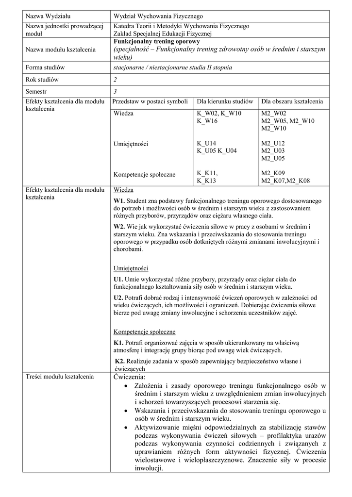 Nazwa Wydziału Wydział Wychowania Fizycznego Nazwa jednostki prowadzącej moduł Katedra Teorii i Metodyki Wychowania Fizycznego Zakład Specjalnej Edukacji Fizycznej Funkcjonalny trening oporowy Nazwa modułu kształcenia (specjalność – Funkcjonalny trening zdrowotny osób w średnim i starszym wieku) Forma studiów stacjonarne / niestacjonarne studia II stopnia Rok studiów 2 Semestr 3 Efekty kształcenia dla modułu kształcenia Przedstaw w postaci symboli Dla kierunku studiów Dla obszaru kształcenia Wiedza K_W02, K_W10 K_W16 M2_W02 M2_W05, M2_W10 M2_W10 Umiejętności K_U14 K_U05 K_U04 M2_U12 M2_U03 M2_U05 Kompetencje społeczne K_K11, K_K13 M2_K09 M2_K07,M2_K08 Efekty kształcenia dla modułu kształcenia Wiedza W1. Student zna podstawy funkcjonalnego treningu oporowego dostosowanego do potrzeb i możliwości osób w średnim i starszym wieku z zastosowaniem różnych przyborów, przyrządów oraz ciężaru własnego ciała. W2. Wie jak wykorzystać ćwiczenia siłowe w pracy z osobami w średnim i starszym wieku. Zna wskazania i przeciwskazania do stosowania treningu oporowego w przypadku osób dotkniętych różnymi zmianami inwolucyjnymi i chorobami. Umiejętności U1. Umie wykorzystać różne przybory, przyrządy oraz ciężar ciała do funkcjonalnego kształtowania siły osób w średnim i starszym wieku. U2. Potrafi dobrać rodzaj i intensywność ćwiczeń oporowych w zależności od wieku ćwiczących, ich możliwości i ograniczeń. Dobierając ćwiczenia siłowe bierze pod uwagę zmiany inwolucyjne i schorzenia uczestników zajęć. Kompetencje społeczne K1. Potrafi organizować zajęcia w sposób ukierunkowany na właściwą atmosferę i integrację grupy biorąc pod uwagę wiek ćwiczących. K2. Realizuje zadania w sposób zapewniający bezpieczeństwo własne i ćwiczących Treści modułu kształcenia Ćwiczenia: Założenia i zasady oporowego treningu funkcjonalnego osób w średnim i starszym wieku z uwzględnieniem zmian inwolucyjnych i schorzeń towarzyszących procesowi starzenia się. Wskazania i przeciwskazania do stosowania treningu oporowego u osób w średnim i starszym wieku. Aktywizowanie mięśni odpowiedzialnych za stabilizację stawów podczas wykonywania ćwiczeń siłowych – profilaktyka urazów podczas wykonywania czynności codziennych i związanych z uprawianiem różnych form aktywności fizycznej. Ćwiczenia wielostawowe i wielopłaszczyznowe. Znaczenie siły w procesie inwolucji. Metodyka kształtowania siły mięśniowej osób w średnim i starszym wieku. Planowanie treningu oporowego z uwzględnieniem wytycznych American College of Sport Medicine (ACSM). Ćwiczenia siłowe z wykorzystaniem typowych urządzeń do kształtowania siły mięśniowej (atlasy wielostanowiskowe, maszyny treningowe jednostanowiskowe, sztangi, hantle itp.) Trening z elastycznym oporem – bezpieczne ćwiczenia siłowe pozbawione momentu bezwładności. Stabilizacja postawy ciała poprzez optymalne działanie siły mięśniowej przeciwko narastającemu oporowi (taśmy gumowe, Gymstick). Ćwiczenia z odważnikami kulowymi (kettlebells). Korzyści wynikające z treningu z wykorzystaniem wolnych obciążeń na przykładzie odważników kulowych. Ćwiczenia z obciążnikami kulowymi dostosowane do potrzeb i możliwości osób w średnim i starszym wieku. Kalistenika – ćwiczenia siłowe z wykorzystaniem ciężaru własnego ciała z uwzględnieniem możliwości osób w średnim i starszym wieku. Trening na niestabilnym podłożu. Ćwiczenie równowagi jako forma treningu siłowego oraz profilaktyka upadków i urazów u osób w starszym wieku. Zasady wykonywania ćwiczeń na niestabilnych podłożach. Trening w zawieszeniu z wykorzystaniem ciężaru własnego ciała na taśmach TRX, jako forma ćwiczeń siłowych w częściowym odciążeniu. Budowa sprzętu i możliwości zastosowania. Zasady obowiązujące podczas wykonywania ćwiczenia. Stabilizacja ciała w zawieszeniu. Zastosowanie taśm TRX w ćwiczeniach indywidualnych i grupowych. Formy organizacji grupowych zajęć siłowych z osobami w średnim i starszym wieku. Bezpieczeństwo na zajęciach z osobami starszymi – asekuracja i autoasekuracja podczas wykonywania ćwiczeń. Wskazania i przeciwskazania do ćwiczeń w zależności od współistniejących zmian inwolucyjnych i schorzeń ćwiczących. Stosowane metody dydaktyczne Metody sprawdzania i kryteria oceny efektów kształcenia uzyskanych przez studentów Pokaz, opis, wykonywanie zadań ruchowych Ocenianie przygotowanych i prezentowanych zestawów ćwiczeń oporowych, test pisemny Kryteria oceny efektów kształcenia na ocenę dst: zna podstawy funkcjonalnego treningu oporowego dostosowanego do potrzeb i możliwości osób w średnim wieku i starszych z zastosowaniem różnych przyborów, przyrządów oraz ciężaru własnego ciała, ma elementarną wiedzę o metodach kształtowania siły mięśniowej i formach organizacji treningu oporowego osób w średnim wieku i starszych z uwzględnieniem wskazań i przeciwskazań do stosowania treningu oporowego, potrafi stosować podstawowe funkcjonalne ćwiczenia siłowe mając na uwadze zmiany inwolucyjne i niektóre schorzenia, stara się przejawiać dbałość o zasady bezpieczeństwa w czasie zajęć. Forma i warunki zaliczenia modułu, w tym zasady dopuszczenia do egzaminu, zaliczenia, a także forma i warunki zaliczenia poszczególnych zajęć wchodzących w zakres danego Zaliczenie na ocenę. Studenci przygotowują zestawy ćwiczeń oporowych z wykorzystaniem przyborów i przyrządów poznanych na zajęciach i prezentują je w sposób praktyczny. W trakcie prowadzący oraz pozostali studenci próbują poprawić popełniane błędy. Zestawy ćwiczeń zaliczane są na „zal.”. modułu Test składa się z pytań zamkniętych i otwartych. Pytania sprawdzają opanowanie materiału dotyczącego każdego efektu z zakresu wiedzy. Kolokwia zalicza się od 70% pozytywnych odpowiedzi: ndst – brak podstawowej