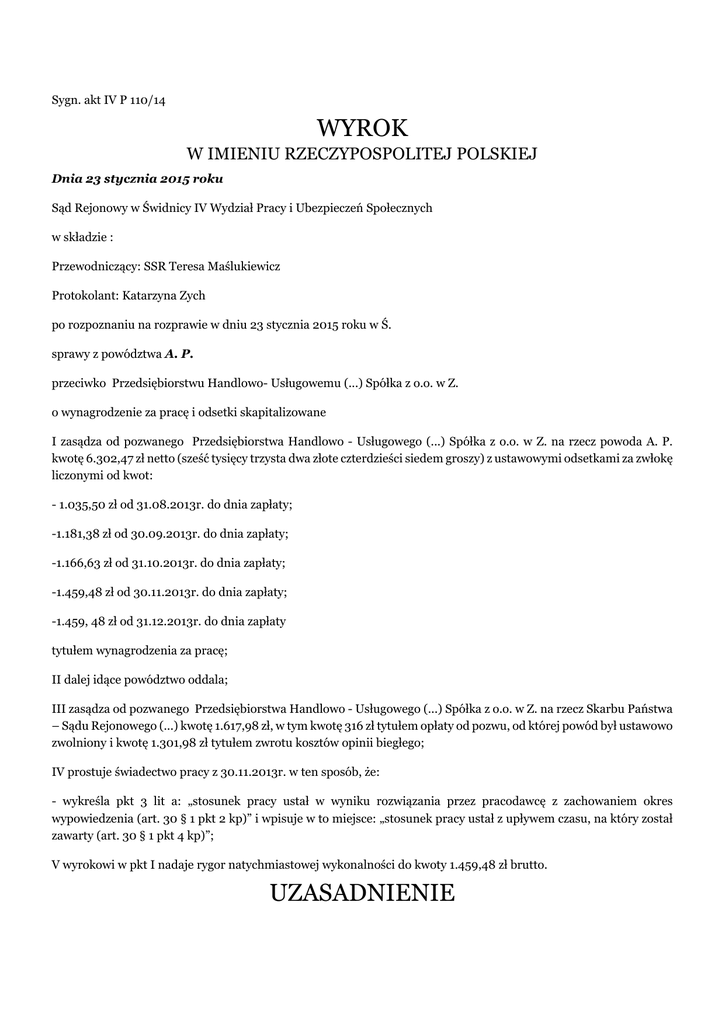 Sygn. akt IV P 110/14 WYROK W IMIENIU RZECZYPOSPOLITEJ POLSKIEJ Dnia 23 stycznia 2015 roku Sąd Rejonowy w Świdnicy IV Wydział Pracy i Ubezpieczeń Społecznych w składzie : Przewodniczący: SSR Teresa Maślukiewicz Protokolant: Katarzyna Zych po rozpoznaniu na rozprawie w dniu 23 stycznia 2015 roku w Ś. sprawy z powództwa A. P. przeciwko Przedsiębiorstwu Handlowo- Usługowemu (...) Spółka z o.o. w Z. o wynagrodzenie za pracę i odsetki skapitalizowane I zasądza od pozwanego Przedsiębiorstwa Handlowo - Usługowego (...) Spółka z o.o. w Z. na rzecz powoda A. P. kwotę 6.302,47 zł netto (sześć tysięcy trzysta dwa złote czterdzieści siedem groszy) z ustawowymi odsetkami za zwłokę liczonymi od kwot: - 1.035,50 zł od 31.08.2013r. do dnia zapłaty; -1.181,38 zł od 30.09.2013r. do dnia zapłaty; -1.166,63 zł od 31.10.2013r. do dnia zapłaty; -1.459,48 zł od 30.11.2013r. do dnia zapłaty; -1.459, 48 zł od 31.12.2013r. do dnia zapłaty tytułem wynagrodzenia za pracę; II dalej idące powództwo oddala; III zasądza od pozwanego Przedsiębiorstwa Handlowo - Usługowego (...) Spółka z o.o. w Z. na rzecz Skarbu Państwa – Sądu Rejonowego (...) kwotę 1.617,98 zł, w tym kwotę 316 zł tytułem opłaty od pozwu, od której powód był ustawowo zwolniony i kwotę 1.301,98 zł tytułem zwrotu kosztów opinii biegłego; IV prostuje świadectwo pracy z 30.11.2013r. w ten sposób, że: - wykreśla pkt 3 lit a: „stosunek pracy ustał w wyniku rozwiązania przez pracodawcę z zachowaniem okres wypowiedzenia (art. 30 § 1 pkt 2 kp)” i wpisuje w to miejsce: „stosunek pracy ustał z upływem czasu, na który został zawarty (art. 30 § 1 pkt 4 kp)”; V wyrokowi w pkt I nadaje rygor natychmiastowej wykonalności do kwoty 1.459,48 zł brutto. UZASADNIENIE A. P. w pozwie z (...) domagał się zasądzenia od (...) Spółka z o.o. z siedzibą w Z. kwoty 8.800 zł łącznie tytułem: wynagrodzenia za pracę za okres od lipca 2013r. do listopada 2013r., oraz tytułem skapitalizowanych odsetek, zobowiązanie pozwanego do wydania świadectwa pracy i odszkodowania tytułem niewydania świadectwa pracy. W uzasadnieniu pozwu podał m. in., że z pozwanym zawarł umowę o pracę na czas określony od (...) na stanowisko inżyniera budowy za wynagrodzenie 1.600 zł brutto. Pierwszą wypłatę powinien otrzymać w dniu (...), nie otrzymał jej do dnia wniesienia pozwu. Mimo tego, zawarł z pozwanym nową umowę o pracę na okres od (...) do czasu zakończenia budowy. Dostał lepsze warunki finansowe a prezes Zarządu pozwanego M. G. (1) nalegał by został, prosił o cierpliwość i obiecał, że wszystkie zaległe wynagrodzenie w najbliższym czasie zostaną w całości wypłacone. Do dnia wniesienia pozwu pozwany nie wypłacił mu dochodzonych pozwem należności. Przedsiębiorstwo Handlowo- Usługowe (...) Spółka z o.o. z siedzibą w Z. wniosła o oddalenie powództwa uzasadniając to m. in. tym, że niewypłacenie powodowi wynagrodzenia za październik i listopad 2013r. wynikało z braku płynności finansowej pozwanej oraz licznych błędów powoda, które m. in. przyczyniły się do utraty tej płynności. Świadectwo pracy zostało powodowi przesłane listem poleconym po zakończeniu stosunku pracy, co jest dopuszczalne przez prawo. Sąd ustalił: A. P. i Przedsiębiorstwo Handlowo- Usługowe (...) Spółka z o.o. z siedzibą w Z. w dniu (...). zawarli umowę o pracę na okres próbny od (...) Powód został zatrudniony na stanowisku inżyniera budowy, w pełnym wymiarze czasu pracy, za wynagrodzeniem (...) zł. Praca wykonywana była w Jednostce Wojskowej przy ul. (...) we W.. W dniu 1.10.2013r. strony zawarły umowę o pracę na czas określony od (...) przy zachowaniu dotychczasowych warunków pracy, za wynagrodzeniem (...) Bezsporne. W okresie zatrudnienia powoda pozwany nie płacił powodowi całości wynagrodzenia wynikającego z umów o pracę. Nie opłacał stosownych składek ZUS. W tym okresie pozwany za pośrednictwem T. M. (1), M. S. (1), K. G. (1) i A. B. (1) przekazał powodowi pewne kwoty, z przeznaczeniem na zakup materiałów potrzebnych na budowę przy ul. (...) we W.. Pieniądze przekazywane powodowi przez T. M. i M. S. znajdowały się w kopercie, na której nie było zapisu, co do kwoty i tytułu wypłaty (na zakup materiałów, czy tytułem wynagrodzenia za pracę i za jaki okres). Natomiast A. B. pod koniec sierpnia 2013r. z koperty otrzymanej od L. D. (1) przekazał powodowi 1.000 zł, zatrzymując dla siebie 2.000 zł. L. D. (1) nie powiedziała A. B. jaką kwotę ma przekazać powodowi, z jakiego tytułu i za jaki okres. Dowód: -faktury VAT –k.91-106 -protokół przekazania gotówki –k. 75 -korespondencja e- mailowa –k. 76-86 -zeznania świadków: A. B.-k. 57-58 T.M.-k.116 M. S. –k. 116 częściowo: L. D.-k.121 częściowo: K. G.- k. 57 -przesłuchania powoda-k.48v. -częściowe przesłuchanie pozwanego k. 212. W okresie od lipca 2013r. do 30 listopada 2013r. powodowi przysługiwało wynagrodzenie w kwocie łącznej 6.302, 47 zł ,w tym: za lipiec 2013r- 1.035,50 zł za sierpień 2013r.-1.181,38 zł za wrzesień 2013r-1.166,63 zł za październik 2013r-1.459,48 zł za listopad 2013r.-1.459,48 zł. Pozwany nie opłacał też należnych składek ZUS. Dowód: -opinia biegłego księgowego –k. 130-135 -subkonto ubezpieczonego –k. 87. W dacie 30.11.2013r. pozwany sporządził świadectwo pracy, w którym w pkt 3 a wypisał, że stosunek pracy łączący strony uległ rozwiązaniu przez pracodawcę z zachowaniem okresu wypowiedzenia (art. 30 § 1 pkt 2 kp). Bezsporne. Sąd zważył: Powództwo jest częściowo uzasadnione. Zgodnie z art. 22 § 1 kp przez nawiązanie stosunku pracy pracownik zobowiązuje się do wykonywania pracy określonego rodzaju na rzecz pracodawcy i pod jego kierownictwem oraz w miejscu i czasie wyznaczonym przez pracodawcę, a pracodawca- do zatrudnienia pracownika za wynagrodzeniem. Wynagrodzenie przysługuje za pracę wyk