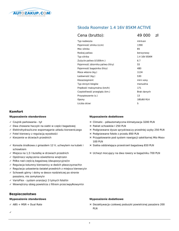 Skoda Roomster 1.4 16V 85KM ACTIVE Cena