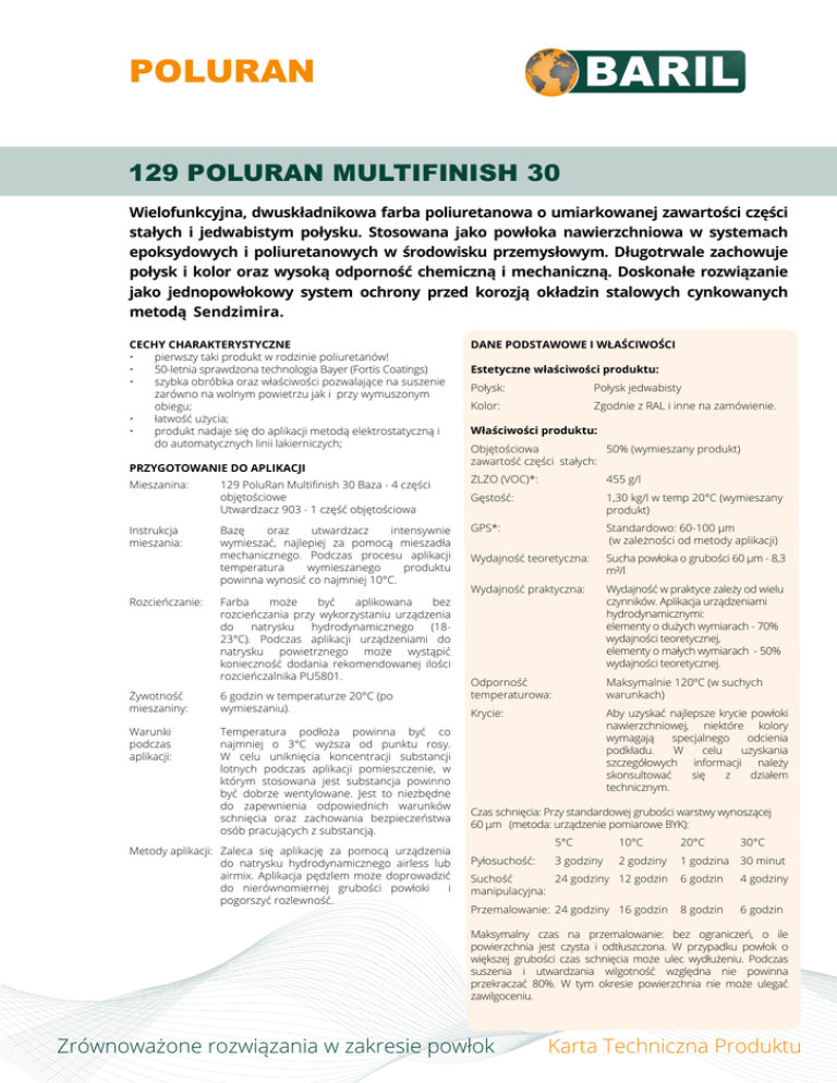 BARIL POLURAN 129 POLURAN MULTIFINISH 30 Wielofunkcyjna, dwuskładnikowa farba poliuretanowa o umiarkowanej zawartości części stałych i jedwabistym połysku. Stosowana jako powłoka nawierzchniowa w systemach epoksydowych i poliuretanowych w środowisku przemysłowym. Długotrwale zachowuje połysk i kolor oraz wysoką odporność chemiczną i mechaniczną. Doskonałe rozwiązanie jako jednopowłokowy system ochrony przed korozją okładzin stalowych cynkowanych metodą Sendzimira. CECHY CHARAKTERYSTYCZNE • pierwszy taki produkt w rodzinie poliuretanów! • 50-letnia sprawdzona technologia Bayer (Fortis Coatings) • szybka obróbka oraz właściwości pozwalające na suszenie zarówno na wolnym powietrzu jak i przy wymuszonym obiegu; • łatwość użycia; • produkt nadaje się do aplikacji metodą elektrostatyczną i do automatycznych linii lakierniczych; PRZYGOTOWANIE DO APLIKACJI Mieszanina: 129 PoluRan Multifinish 30 Baza - 4 części objętościowe Utwardzacz 903 - 1 część objętościowa Instrukcja mieszania: Bazę oraz utwardzacz intensywnie wymieszać, najlepiej za pomocą mieszadła mechanicznego. Podczas procesu aplikacji temperatura wymieszanego produktu powinna wynosić co najmniej 10°C. Rozcieńczanie: Farba może być aplikowana bez rozcieńczania przy wykorzystaniu urządzenia do natrysku hydrodynamicznego (1823°C). Podczas aplikacji urządzeniami do natrysku powietrznego może wystąpić konieczność dodania rekomendowanej ilości rozcieńczalnika PU5801. Żywotność mieszaniny: 6 godzin w temperaturze 20°C (po wymieszaniu). Warunki podczas aplikacji: Temperatura podłoża powinna być co najmniej o 3°C wyższa od punktu rosy. W celu uniknięcia koncentracji substancji lotnych podczas aplikacji pomieszczenie, w którym stosowana jest substancja powinno być dobrze wentylowane. Jest to niezbędne do zapewnienia odpowiednich warunków schnięcia oraz zachowania bezpieczeństwa osób pracujących z substancją. Metody aplikacji: Zaleca się aplikację za pomocą urządzenia do natrysku hydrodynamicznego airless lub airmix. Aplikacja pędzlem może doprowadzić do nierównomiernej grubości powłoki i pogorszyć rozlewność. DANE PODSTAWOWE I WŁAŚCIWOŚCI Estetyczne właściwości produktu: Połysk: Połysk jedwabisty Kolor: Zgodnie z RAL i inne na zamówienie. Właściwości produktu: Objętościowa 50% (wymieszany produkt) zawartość części stałych: ZLZO (VOC)*: 455 g/l Gęstość: 1,30 kg/l w temp 20°C (wymieszany produkt) GPS*: Standardowo: 60-100 μm (w zależności od metody aplikacji) Wydajność teoretyczna: Sucha powłoka o grubości 60 μm - 8,3 m²/l Wydajność praktyczna: Wydajność w praktyce zależy od wielu czynników. Aplikacja urządzeniami hydrodynamicznymi: elementy o dużych wymiarach - 70% wydajności teoretycznej, elementy o małych wymiarach - 50% wydajności teoretycznej. Odporność temperaturowa: Maksymalnie 120ºC (w suchych warunkach) Krycie: Aby uzyskać najlepsze krycie powłoki nawierzchniowej, niektóre kolory wymagają specjalnego odcienia podkładu. W celu uzyskania szczegółowych informacji należy skonsultować się z działem technicznym. Czas schnięcia: Przy standardowej grubości warstwy wynoszącej 60 μm (metoda: urządzenie pomiarowe BYK): Pyłosuchość: 5°C 10°C 20°C 30°C 3 godziny 2 godziny 1 godzina 30 minut Suchość 24 godziny 12 godzin manipulacyjna: 6 godzin 4 godziny Przemalowanie: 24 godziny 16 godzin 8 godzin 6 godzin Maksymalny czas na przemalowanie: bez ograniczeń, o ile powierzchnia jest czysta i odtłuszczona. W przypadku powłok o większej grubości czas schnięcia może ulec wydłużeniu. Podczas suszenia i utwardzania wilgotność względna nie powinna przekraczać 80%. W tym okresie powierzchnia nie może ulegać zawilgoceniu. Zrównoważone rozwiązania w zakresie powłok Karta Techniczna Produktu POLURAN 129 POLURAN MULTIFINISH 30 ZALECENIA APLIKACYJNE Rozcieńczalnik: Zalecana ilość: Rozmiar dyszy: Ciśnienie robocze: GPS*: Natrysk hydrodynamiczny PU5801 0-5% obj. min. 0,013 cala 140 bar 60-100 µm Pędzel-wałek Rozcieńczalnik: Zalecana ilość: Rozmiar dyszy: Ciśnienie robocze: GPS*: S5102 0-5% obj. 50 µm ŚRODOWISKO NATURALNE I ZDROWIE Metoda airmix PU5801 0-5% obj. min. 0,013 cala min. 70 bar 60-100 µm Natrysk powietrzny PU5801 5-10% obj. min. 2,0 mm min. 3-4 bar 60-100 µm Czyszczenie narzędzi: Niezwłocznie po aplikacji z wykorzystaniem rozcieńczalnika PU5801. OPAKWANIE I PRZECHOWYWANIE Opakowania: 20-litrowe puszki i 200-litrowe beczki. Rozcieńczalnik: 25-litrowe puszki i 200-litrowe beczki. Okres 12 miesięcy w oryginalnym szczelnie przechowywania: zamkniętym opakowaniu w temperaturze od 5°C do 40°C. Oznakowanie: Zgodnie z wytycznymi dyrektywy UE 67/548/WE dotyczącej materiałów niebezpiecznych. Substancja niebezpieczna i podrażniająca w przypadku kontaktu ze skórą, oczami oraz podczas wdychania. W przypadku kontaktu substancji z oczami należy natychmiast przemyć je dużą ilością wody oraz skontaktować się z lekarzem. Nie należy spożywać pokarmów, napojów ani palić tytoniu w miejscu aplikacji ani podczas aplikacji substancji. UN: 1263 kod AWARE: 41-IV KODOWANIE AWARE Kod AWARE (Adequate Warning and Air Requirement – wymagania dotyczące odpowiedniego ostrzeżenia i zapewnienia jakości powietrza) to system kodowania produktów zawierających lotne związki organiczne (LZO) stanowiący narzędzie wsparcia producentów wspomagajęce ocenę ryzyka i innowacyjności produktu. System ten dodatkowo może być wykorzystywany do informowania użytkowników końcowych o potencjalnie możliwym ryzyku zagrożenia zdrowia wynikającym z użytkowania produktu. System został opracowany na podstawie norweskiego systemu OAR (Occupational Air Requirement – wymagania dotyczące jakości powietrza w miejscu pracy) oraz duńskiego systemu kodowania MAL. Kod AWARE składa się z dwóch cyfr oddzielonych kreską. Obie cyfry odnoszą się do fizyko-chemicz