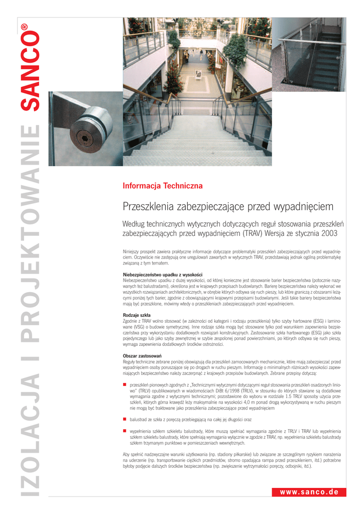 IZOLACJA I PROJEKTOWANIE SANCO ® Informacja Techniczna Przeszklenia zabezpieczające przed wypadnięciem Według technicznych wytycznych dotyczących reguł stosowania przeszkleń zabezpieczających przed wypadnięciem (TRAV) Wersja ze stycznia 2003 Niniejszy prospekt zawiera praktyczne informacje dotyczące problematyki przeszkleń zabezpieczających przed wypadnięciem. Oczywiście nie zastępują one uregulowań zawartych w wytycznych TRAV, przedstawiają jednak ogólną problematykę związaną z tym tematem. Niebezpieczeństwo upadku z wysokości Niebezpieczeństwo upadku z dużej wysokości, od której konieczne jest stosowanie barier bezpieczeństwa (potocznie nazywanych też balustradami), określona jest w krajowych przepisach budowlanych. Barierę bezpieczeństwa należy wykonać we wszystkich rozwiązaniach architektonicznych, w obrębie których odbywa się ruch pieszy, lub które graniczą z obszarami leżącymi poniżej tych barier, zgodnie z obowiązującymi krajowymi przepisami budowlanymi. Jeśli takie bariery bezpieczeństwa mają być przeszklone, mówimy wtedy o przeszkleniach zabezpieczających przed wypadnięciem. Rodzaje szkła Zgodnie z TRAV wolno stosować (w zależności od kategorii i rodzaju przeszklenia) tylko szyby hartowane (ESG) i laminowane (VSG) o budowie symetrycznej. Inne rodzaje szkła mogą być stosowane tylko pod warunkiem zapewnienia bezpieczeństwa przy wykorzystaniu dodatkowych rozwiązań konstrukcyjnych. Zastosowanie szkła hartowanego (ESG) jako szkła pojedynczego lub jako szyby zewnętrznej w szybie zespolonej ponad powierzchniami, po których odbywa się ruch pieszy, wymaga zapewnienia dodatkowych środków ostrożności. Obszar zastosowań Reguły techniczne zebrane poniżej obowiązują dla przeszkleń zamocowanych mechanicznie, które mają zabezpieczać przed wypadnięciem osoby poruszające się po drogach w ruchu pieszym. Informację o minimalnych różnicach wysokości zapewniających bezpieczeństwo należy zaczerpnąć z krajowych przepisów budowlanych. Zebrane przepisy dotyczą: ■ przeszkleń pionowych zgodnych z „Technicznymi wytycznymi dotyczącymi reguł stosowania przeszkleń osadzonych liniowo” (TRLV) opublikowanych w wiadomościach DiBt 6/1998 (TRLV), w stosunku do których stawiane są dodatkowe wymagania zgodne z wytycznymi technicznymi; pozostawione do wyboru w rozdziale 1.5 TRLV sposoby użycia przeszkleń, których górna krawędź leży maksymalnie na wysokości 4,0 m ponad drogą wykorzystywaną w ruchu pieszym nie mogą być traktowane jako przeszklenia zabezpieczające przed wypadnięciem ■ balustrad ze szkła z poręczą przebiegającą na całej jej długości oraz ■ wypełnienia szkłem szkieletu balustrady, które muszą spełniać wymagania zgodnie z TRLV i TRAV lub wypełnienia szkłem szkieletu balustrady, które spełniają wymagania wyłącznie w zgodzie z TRAV, np. wypełnienia szkieletu balustrady szkłem trzymanym punktowo w pomieszczeniach wewnętrznych. Aby spełnić nadzwyczajne warunki użytkowania (np. stadiony piłkarskie) lub związane ze szczególnym ryzykiem narażenia na uderzenie (np. transportowanie ciężkich przedmiotów, stromo opadająca rampa przed przeszkleniem, itd.) potrzebne byłoby podjęcie dalszych środków bezpieczeństwa (np. zwiększenie wytrzymałości poręczy, odbojniki, itd.). w w w. s a n c o . d e Liniowo osadzone przeszklenia pionowe w oparciu o przepisy TRLV, które nie posiadają żadnego rygla w konstrukcji lub odstającej poręczy na wysokości określonej w przepisach budowlanych, są tak zbudowane, że są w stanie przenieść obciążenia poziome. Krawędzie przeszkleń muszą być skutecznie chronione przed uderzeniami albo przez możliwość pozycjonowania (np. względem słupów, rygli, sąsiednich szyb) albo przez elementy budowlane (np. ściany lub sufity), które będą bezpośrednio graniczyć z przeszkleniem. Rodzaj szkła KATEGORIA A Przeszklenia zabezpieczające przed wypadnięciem zostały podzielone według tych reguł na trzy kategorie VSG Float VSG VSG ESG Strona narażona na obciążenie Tabela przedstawia szyby, które zostały przetestowane na obiektach w ostatnich latach. Oznacza to, że można zamontować na obiekcie szkło o takiej samej budowie, jak podano w tabeli, bez potrzeby dokumentowania odporności na uderzenie. Kategoria A Rodzaj szkła Rodzaj* podparcia Szerokość (mm) Wysokość (mm) Min. Max. Min. Max. Budowa szyby (mm) od wewnątrz do zewnątrz1 SANCO SAFE AV ISO 1 All 500 1300 1000 2000 8 ESG / SZR/ 4 SPG / 0,76 PVB / 4 SPG SANCO SAFE AV ISO 2 All 1000 2000 500 1300 8 ESG / SZR / 4 SPG / 0,76 PVB / 4 SPG SANCO SAFE AV ISO 3 All 900 2000 1000 2100 8 ESG / SZR / 5 SPG / 0,76 PVB / 5 SPG SANCO SAFE AV ISO 4 All 1000 2100 900 2000 8 ESG / SZR / 5 SPG / 0,76 PVB / 5 SPG SANCO SAFE AV ISO 5 All 1100 1500 2100 2500 5 SPG / 0,76 PVB / 5 SPG / SZR / 8 ESG SANCO SAFE AV ISO 6 All 2100 2500 1100 1500 5 SPG / 0,76 PVB / 5 SPG / SZR / 8 ESG 8 ESG / SZR / 6 SPG / 0,76 PVB / 6 SPG SANCO SAFE AV ISO 7 All 900 2500 1000 4000 SANCO SAFE AV ISO 8 All 1000 4000 900 2500 8 ESG / SZR / 6 SPG / 0,76 PVB / 6 SPG SANCO SAFE AV ISO 9 All 300 500 1000 4000 4 ESG / SZR / 4 SPG / 0,76 PVB / 4 SPG SANCO SAFE AV ISO 10 All 300 500 1000 4000 4 SPG / 0,76 PVB / 4 SPG / SZR / 4 ESG SANCO SAFE AV MONO 11 All 500 1200 1000 2000 6 SPG / 0,76 PVB / 6 SPG SANCO SAFE AV MONO 12 All 500 2000 1000 1200 6 SPG / 0,76 PVB / 6 SPG SANCO SAFE AV MONO 13 All 500 1500 1000 2500 8 SPG / 0,76 PVB / 8 SPG SANCO SAFE AV MONO 14 All 500 2500 1000 1500 8 SPG / 0,76 PVB / 8 SPG SANCO SAFE AV MONO 15 All 1200 2100 1000 3000 10 SPG / 0,76 PVB / 10 SPG SANCO SAFE AV MONO 16 All 1000 3000 1200 2100 10 SPG / 0,76 PVB / 10 SPG SANCO SAFE AV MONO 17 All 300 500 500 3000 6 SPG / 0,76 PVB / 6 SPG Dotyczy balustrad nośnych, które montowane są linowo w konstrukcji zakleszczającej wzdłuż dolnej krawędzi szkła. Poszczególne szyby połączone są ze sobą za pomocą poręczy 