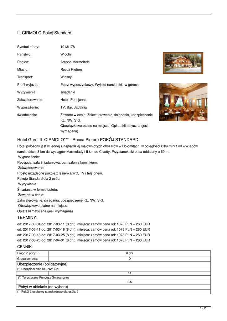 IL CIRMOLO Pokój Standard Symbol oferty: 1013/178 Państwo: Włochy Region: Arabba Marmolada Miasto: Rocca Pietore Transport: Własny Profil wyjazdu: Pobyt wypoczynkowy, Wyjazd narciarski, w górach Wyżywienie: śniadanie Zakwaterowanie: Hotel, Pensjonat Wyposażenie: TV, Bar, Jadalnia świadczenia: Zawarte w cenie: Zakwaterowanie, śniadania, ubezpieczenie KL, NW, SKI. Obowiązkowo płatne na miejscu: Opłata klimatyczna (jeśli wymagana) Hotel Garni IL CIRMOLO*** - Rocca Pietore POKÓJ STANDARD Hotel położony jest w jednej z najbardziej malowniczych obszarów w Dolomitach, w odległości kilku minut od wyciągów narciarskich, 3 km do wyciągów Marmolady i 5 km do Civetty. Przystanek ski busa oddalony o 50 m. Wyposażenie: Recepcja, sala śniadaniowa, bar, salon z kominkiem. Zakwaterowanie: Prosto urządzone pokoje z łazienką/WC, TV i telefonem. Pokoje Standard dla 2 osób. Wyżywienie: Śniadania w formie bufetu. Zawarte w cenie: Zakwaterowanie, śniadania, ubezpieczenie KL, NW, SKI. Obowiązkowo płatne na miejscu: Opłata klimatyczna (jeśli wymagana) TERMINY: od: 2017-03-04 do: 2017-03-11 (8 dni), miejsca: zamów cena od: 1078 PLN = 260 EUR od: 2017-03-11 do: 2017-03-18 (8 dni), miejsca: zamów cena od: 1078 PLN = 260 EUR od: 2017-03-18 do: 2017-03-25 (8 dni), miejsca: zamów cena od: 1078 PLN = 260 EUR od: 2017-03-25 do: 2017-04-01 (8 dni), miejsca: zamów cena od: 1078 PLN = 260 EUR CENNIK: Długość pobytu: 8 dni Grupa cenowa: D Ubezpieczenie (obligatoryjne) (*) Ubezpieczenie KL, NW, SKI (*) Turystyczny Fundusz Gwarancyjny Pobyt w obiekcie (do wyboru) 14 2.5 (*) Pokój 2 osobowy standardowo dla osób: 2 1/2 Rodzaj osoby (do wyboru) (*) Osoba dorosła (-) 246 Waluta: EUR Aktualne ceny z systemu S.A.R.T. (-) - cena usługi, podatku kalkulowana przy osobie lub gratis (*) - kwota wliczona w cenę standardową 2/2