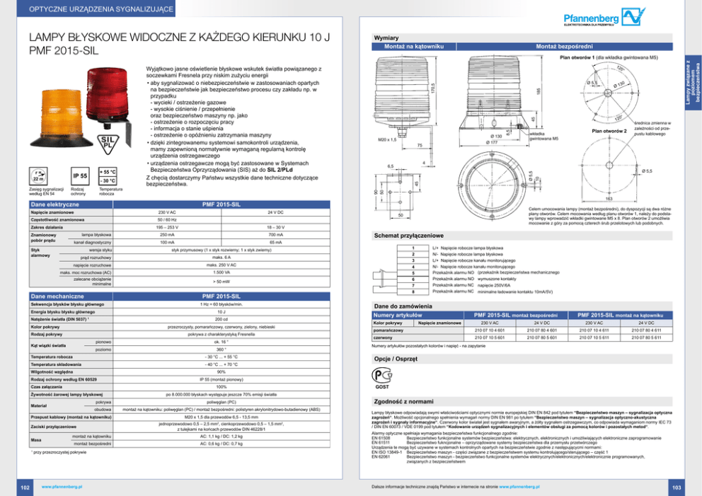 Optyczne urządzenia sygnalizujące Zasięg sygnalizacji według EN 54 Temperatura robocza Dane elektryczne 230 V AC Częstotliwość znamionowa 50 / 60 Hz Zakres działania 18 – 30 V 250 mA 700 mA kanał diagnostyczny 100 mA 65 mA wersja styku prąd rozruchowy > 50 mW 1 Hz = 60 błysków/min. 10 J 200 cd Kolor pokrywy przezroczysty, pomarańczowy, czerwony, zielony, niebieski Rodzaj pokrywy pokrywa z charakterystyką Fresnella Kąt wiązki światła pionowo ok. 16 ° poziomo 360 ° Temperatura robocza - 30 °C ... + 55 °C Temperatura składowania - 40 °C ... + 70 °C Wilgotność względna Lampy związane z poziomem bezpieczeństwa 185 170,5 45 8,5 wkładka gwintowana M5 Plan otworów 2 średnica zmienna w zależności od przepustu kablowego Ø 5,5 Schemat przyłączeniowe 1 L/+ Napięcie robocze lampa błyskowa N/- Napięcie robocze lampa błyskowa L/+ Napięcie robocze kanału monitorującego N/- Napięcie robocze kanału monitorującego Przekaźnik alarmu NO (przekaźnik bezpieczeństwa mechanicznego Przekaźnik alarmu NO wymuszone kontakty Przekaźnik alarmu NC napięcie 250V/6A Przekaźnik alarmu NC minimalne ładowanie kontaktu 10mA/5V) 2 3 4 5 6 7 8 PMF 2015-SIL Natężenie światła (DIN 5037) 1 0° 12 Celem umocowania lampy (montaż bezpośredni), do dyspozycji są dwa różne plany otworów. Celem mocowania według planu otworów 1, należy do podstawy lampy wprowadzić wkładki gwintowane M5 x 8. Plan otworów 2 umożliwia mocowanie z góry za pomocą czterech śrub przelotowych lub podobnych. 50 maks. 250 V AC zalecane obciążenie minimalne Energia błysku błysku głównego 30 Ø1 4 6,5 maks. 6 A 1.500 VA Sekwencja błysków błysku głównego Dane do zamówienia Numery artykułów Kolor pokrywy Napięcie znamionowe PMF 2015-SIL montaż bezpośredni PMF 2015-SIL montaż na kątowniku 230 V AC 24 V DC 230 V AC 24 V DC pomarańczowy 210 07 10 4 601 210 07 80 4 601 210 07 10 4 611 210 07 80 4 611 czerwony 210 07 10 5 601 210 07 80 5 601 210 07 10 5 611 210 07 80 5 611 Numery artykułów pozostałych kolorów i napięć - na zapytanie Opcje / Osprzęt 90% Rodzaj ochrony według EN 60529 Czas załączania IP 55 (montaż pionowy) 100% Żywotność żarowej lampy błyskowej Materiał poliwęglan (PC) obudowa montaż na kątowniku: poliwęglan (PC) / montaż bezpośredni: polistyren akrylonitrydowo-butadienowy (ABS) Zaciski przyłączeniowe M20 x 1,5 dla przewodów 6,5 - 13,5 mm jednoprzewodowo 0,5 – 2,5 mm2, cienkoprzewodowo 0,5 – 1,5 mm2, z tulejkami na końcach przewodów DIN 46228/1 montaż na kątowniku AC: 1,1 kg / DC: 1,2 kg montaż bezpośredni AC: 0,6 kg / DC: 0,7 kg przy przezroczystej pokrywie www.pfannenberg.pl GOST po 8.000.000 błyskach występuje jeszcze 70% emisji światła pokrywa Przepust kablowy (montaż na kątowniku) 102 75 styk przymusowy (1 x styk rozwierny; 1 x styk zwierny) maks. moc rozruchowa (AC) Dane mechaniczne 1 Ø 130 Ø 177 M20 x 1,5 24 V DC 195 – 253 V napięcie rozruchowe Masa Ø 5,5 163 lampa błyskowa Styk alarmowy 0° PMF 2015-SIL Napięcie znamionowe Znamionowy pobór prądu 12 Ø 5,5 - 30 °C Rodzaj ochrony Plan otworów 1 (dla wkładka gwintowana M5) 10 + 55 °C IP 55 Montaż bezpośredni 90 50 r= 22 m Wyjątkowo jasne oświetlenie błyskowe wskutek światła powiązanego z soczewkami Fresnela przy niskim zużyciu energii •aby sygnalizować o niebezpieczeństwie w zastosowaniach opartych na bezpieczeństwie jak bezpieczeństwo procesu czy zakładu np. w przypadku - wycieki / ostrzeżenie gazowe - wysokie ciśnienie / przepełnienie oraz bezpieczeństwo maszyny np. jako - ostrzeżenie o rozpoczęciu pracy - informacja o stanie uśpienia - ostrzeżenie o opóźnieniu zatrzymania maszyny •dzięki zintegrowanemu systemowi samokontroli urządzenia, mamy zapewnioną normatywnie wymaganą regularną kontrolę urządzenia ostrzegawczego •urządzenia ostrzegawcze mogą być zastosowane w Systemach Bezpieczeństwa Oprzyrządowania (SIS) aż do SIL 2/PLd Z chęcią dostarczymy Państwu wszystkie dane techniczne dotyczące bezpieczeństwa. Wymiary Montaż na kątowniku 45 Lampy błyskowe widoczne z każdego kierunku 10 J PMF 2015-SIL Zgodność z normami Lampy błyskowe odpowiadają swymi właściwościami optycznymi normie europejskiej DIN EN 842 pod tytułem “Bezpieczeństwo maszyn – sygnalizacja optyczna zagrożeń“. Możliwość opcjonalnego spełnienia wymagań normy DIN EN 981 po tytułem “Bezpieczeństwo maszyn – sygnalizacja optyczno-akustyczna zagrożeń i sygnały informacyjne“. Czerwony kolor świateł jest sygnałem awaryjnym, a żółty sygnałem ostrzegawczym, co odpowiada wymaganiom normy IEC 73 / DIN EN 60073 / VDE 0199 pod tytułem “Kodowanie urządzeń sygnalizacyjnych i elementów obsługi za pomocą kolorów i pozostałych metod“. Alarmy optyczne spełniaja wymagania bezpieczeństwa funkcjonalnego zgodnie: EN 61508 Bezpieczeństwo funkcjonalne systemów bezpieczeństwa: elektrycznych, elektronicznych i umożliwiających elektroniczne zaprogramowanie EN 61511 Bezpieczeństwo fukncjonalne – oprzyrządowane systemy bezpieczeństwa dla przemysłu przetwórczego Urządzenia te mogą być uzywane w systemach kontrolnych opartych na bezpieczeństwie zgodnie z następującycmi normami: EN ISO 13849-1 Bezpieczeństwo maszyn - części związane z bezpieczeństwem systemu kontrolującego/sterującego – część 1 EN 62061 Bezpieczeństwo maszyn - bezpieczeństwo funkcjonalne systemów elektrycznych/elektronicznych/elektronicznie programowanych, związanych z bezpieczeństwem Dalsze informacje techniczne znajdą Państwo w internecie na stronie www.pfannenberg.pl 103