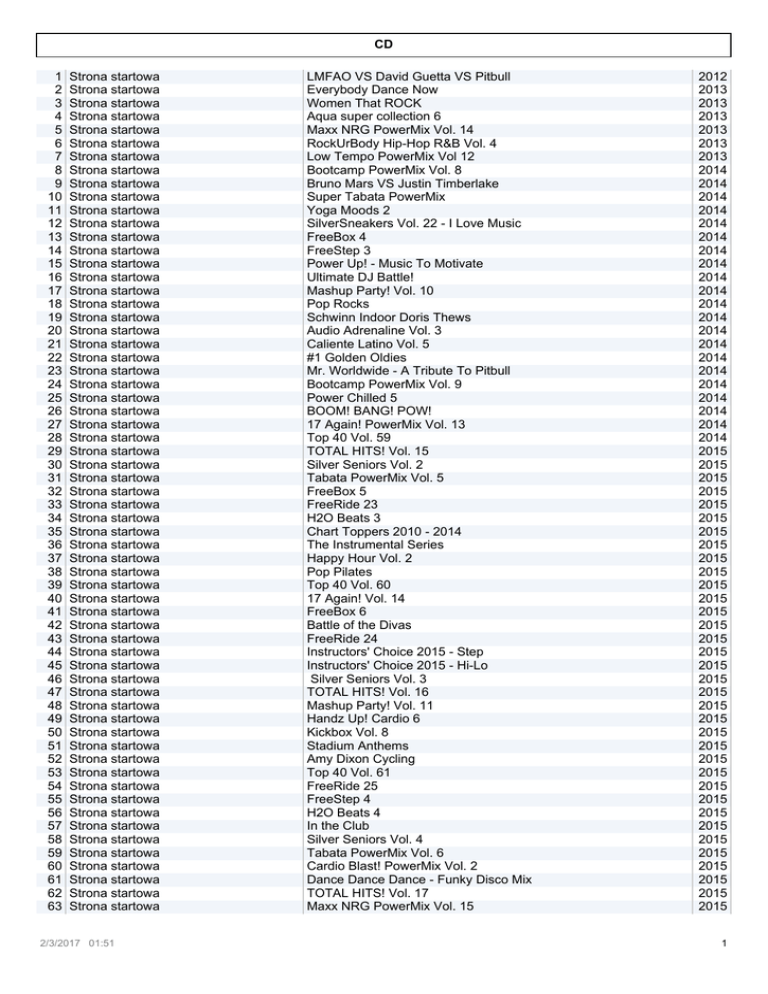 CD 1 2 3 4 5 6 7 8 9 10 11 12 13 14 15 16 17 18 19 20 21 22 23 24 25 26 27 28 29 30 31 32 33 34 35 36 37 38 39 40 41 42 43 44 45 46 47 48 49 50 51 52 53 54 55 56 57 58 59 60 61 62 63 Strona startowa Strona startowa Strona startowa Strona startowa Strona startowa Strona startowa Strona startowa Strona startowa Strona startowa Strona startowa Strona startowa Strona startowa Strona startowa Strona startowa Strona startowa Strona startowa Strona startowa Strona startowa Strona startowa Strona startowa Strona startowa Strona startowa Strona startowa Strona startowa Strona startowa Strona startowa Strona startowa Strona startowa Strona startowa Strona startowa Strona startowa Strona startowa Strona startowa Strona startowa Strona startowa Strona startowa Strona startowa Strona startowa Strona startowa Strona startowa Strona startowa Strona startowa Strona startowa Strona startowa Strona startowa Strona startowa Strona startowa Strona startowa Strona startowa Strona startowa Strona startowa Strona startowa Strona startowa Strona startowa Strona startowa Strona startowa Strona startowa Strona startowa Strona startowa Strona startowa Strona startowa Strona startowa Strona startowa 2/3/2017 01:51 LMFAO VS David Guetta VS Pitbull Everybody Dance Now Women That ROCK Aqua super collection 6 Maxx NRG PowerMix Vol. 14 RockUrBody Hip-Hop R&B Vol. 4 Low Tempo PowerMix Vol 12 Bootcamp PowerMix Vol. 8 Bruno Mars VS Justin Timberlake Super Tabata PowerMix Yoga Moods 2 SilverSneakers Vol. 22 - I Love Music FreeBox 4 FreeStep 3 Power Up! - Music To Motivate Ultimate DJ Battle! Mashup Party! Vol. 10 Pop Rocks Schwinn Indoor Doris Thews Audio Adrenaline Vol. 3 Caliente Latino Vol. 5 #1 Golden Oldies Mr. Worldwide - A Tribute To Pitbull Bootcamp PowerMix Vol. 9 Power Chilled 5 BOOM! BANG! POW! 17 Again! PowerMix Vol. 13 Top 40 Vol. 59 TOTAL HITS! Vol. 15 Silver Seniors Vol. 2 Tabata PowerMix Vol. 5 FreeBox 5 FreeRide 23 H2O Beats 3 Chart Toppers 2010 - 2014 The Instrumental Series Happy Hour Vol. 2 Pop Pilates Top 40 Vol. 60 17 Again! Vol. 14 FreeBox 6 Battle of the Divas FreeRide 24 Instructors' Choice 2015 - Step Instructors' Choice 2015 - Hi-Lo Silver Seniors Vol. 3 TOTAL HITS! Vol. 16 Mashup Party! Vol. 11 Handz Up! Cardio 6 Kickbox Vol. 8 Stadium Anthems Amy Dixon Cycling Top 40 Vol. 61 FreeRide 25 FreeStep 4 H2O Beats 4 In the Club Silver Seniors Vol. 4 Tabata PowerMix Vol. 6 Cardio Blast! PowerMix Vol. 2 Dance Dance Dance - Funky Disco Mix TOTAL HITS! Vol. 17 Maxx NRG PowerMix Vol. 15 2012 2013 2013 2013 2013 2013 2013 2014 2014 2014 2014 2014 2014 2014 2014 2014 2014 2014 2014 2014 2014 2014 2014 2014 2014 2014 2014 2014 2015 2015 2015 2015 2015 2015 2015 2015 2015 2015 2015 2015 2015 2015 2015 2015 2015 2015 2015 2015 2015 2015 2015 2015 2015 2015 2015 2015 2015 2015 2015 2015 2015 2015 2015 1 64 65 66 67 68 69 70 71 72 73 74 75 76 77 78 79 80 81 82 83 84 85 86 87 88 89 90 91 92 93 94 95 96 97 98 99 100 101 102 103 104 105 106 107 108 109 110 111 112 113 114 115 116 117 118 119 120 121 122 123 124 125 126 127 128 Strona startowa Strona startowa Strona startowa Strona startowa Strona startowa Strona startowa Strona startowa Strona startowa Strona startowa Strona startowa Strona startowa Strona startowa Strona startowa Strona startowa Strona startowa Strona startowa Strona startowa Strona startowa Strona startowa Strona startowa Strona startowa Strona startowa Strona startowa Strona startowa Strona startowa Strona startowa Strona startowa Strona startowa Strona startowa Strona startowa Strona startowa Strona startowa Strona startowa Strona startowa Strona startowa Strona startowa Strona startowa Strona startowa Strona startowa Strona startowa Strona startowa Strona startowa Strona startowa Strona startowa Strona startowa Strona startowa Strona startowa Strona startowa Strona startowa Strona startowa Strona startowa Strona startowa Strona startowa Strona startowa Strona startowa Strona startowa Strona startowa Strona startowa Strona startowa Strona startowa Strona startowa Strona startowa Strona startowa Strona startowa Strona startowa 2/3/2017 01:51 Low Tempo PowerMix 13 Silver Seniors Vol. 5 Cardio Warrior FreeRide 26 FreeStep 5 H2O Beats 5 Handz Up! Cardio 7 Viva Latino - Best of Latin Mashup Party! Vol. 12 POP goes RETRO 20 Smash Hits! Latin Tabata PowerMix Top 40 Vol. 62 17 Again! Vol. 15 Best of 2015 FreeBox 7 FreeRide 27 Millennium Step & Conditioning H2O Beats 6 SHOCKWAVE Vol. 2 TOTAL HITS! Vol. 18 70's Hits Reloaded Mat Pilates Vol. 5 Bootcamp Vol. 10 Battle of the Brits! Cycling Shannon Fable Top AU Hits Silver Seniors Vol. 6 Music for Active Aging L. Biscontini Pop Pilates - POP 5 Instructors' Choice 2016 - Cardio Instructors' Choice 2016 - Step Top 40 Vol. 63 H2O Beats 7 FreeStep 6 FreeRide 28 FreeBox 8 TOTAL HITS! Vol. 19 Best of 2000's Vol 2 Tropical House PowerMix Ride PowerMix Vol. 4 Instrumental Cardio Gregg Cook Cykling Mashup Party! Vol. 13 PowerChilled 6 Best of 2016 HIIT IT! Outrageous Oldies The Loco-Motion Top 40 Vol. 65 Best of Mashup Party! Vol. 2 Free Box 9 FreeRide 29 Free Step 7 H2O Beats 8 Top 40 Vol. 64 Silver Seniors Vol. 7 A Tribute to Prince & David Bowie TOTAL HITS! Vol. 20 Instrumental Cardio Handz Up! Cardio 8 Chill - Tropical House Edition TOTAL HITS! Vol. 21 A Tribute To Calvin Harris Handz Up! Cardio 9 Baby Boomer 2015 2015 2015 2015 2015 2015 2015 2015 2015 2015 2016 2016 2016 2016 2016 2016 2016 2016 2016 2016 2016 2016 2016 2016 2016 2016 2016 2016 2016 2016 2016 2016 2016 2016 2016 2016 2016 2016 2016 2016 2016 2016 2016 2016 2016 2016 2016 2016 2016 2016 2016 2016 2016 2016 2016 2016 2016 2016 2016 2016 2016 2017 2017 2017 2017 2
