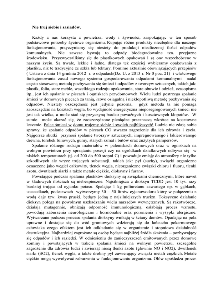 Nie truj siebie i sąsiadów. Każdy z nas korzysta z powietrza, wody i żywności, zaspokajając w ten sposób podstawowe potrzeby życiowe organizmu. Kupując różne produkty niezbędne dla naszego funkcjonowania, przyczyniamy się niestety do produkcji niezliczonej ilości odpadów komunalnych. Nie zawsze bywają to odpady biodegradowalne tzn. przyjazne środowisku. Przyzwyczailiśmy się do plastikowych opakowań i są one wszechobecne w naszym życiu. Są trwałe, lekkie i ładne, dlatego też częściej wybieramy opakowania z plastiku, niż te tradycyjne ze szkła lub tektury. Pomimo aktualnie obowiązujących przepisów ( Ustawa z dnia 14 grudnia 2012 r. o odpadach(Dz. U. z 2013 r. Nr 0 poz. 21) i właściwego funkcjonowania zasad nowego systemu gospodarowania odpadami komunalnymi nadal często stosowaną metodą pozbywania się śmieci i odpadów z tworzyw sztucznych, takich jak: plastik, folia, stare meble, wszelkiego rodzaju opakowania, stare obuwie i odzież, czasopisma itp., jest ich spalanie w piecach i ogniskach przydomowych. Wielu ludzi postrzega spalanie śmieci w domowych piecach za tanią, łatwo osiągalną i niekłopotliwą metodę pozbywania się odpadów. Niestety oszczędność jest jedynie pozorna, gdyż metoda ta nie pomaga zaoszczędzić na kosztach węgla, bo wydajność energetyczna nieposegregowanych śmieci nie jest tak wielka, a może stać się przyczyną bardzo poważnych i kosztownych kłopotów. W sumie może okazać się, że zaoszczędzone pieniądze przeznaczą wkrótce na kosztowne leczenie. Paląc śmieci w domu trujemy siebie i swoich najbliższych! Ludzie nie zdają sobie sprawy, że spalanie odpadów w piecach CO stwarza zagrożenie dla ich zdrowia i życia. Najgorsze skutki przynosi spalanie tworzyw sztucznych, impregnowanego i lakierowanego drewna, torebek foliowych, gumy, starych szmat i butów oraz zużytych pampersów. Spalanie różnego rodzaju materiałów w paleniskach domowych oraz w ogniskach na wolnym powietrzu przy sprzątaniu posesji czy na ogródkach działkowych odbywa się w niskich temperaturach (tj. od 200 do 500 stopni C) i powoduje emisję do atmosfery nie tylko szkodliwych ale wręcz trujących substancji, takich jak: pył (suchy), związki organiczne oznaczone jako węgiel całkowity, tlenek węgla, nieorganiczne związki chloru i fluoru, tlenki azotu, dwutlenek siarki a także metale ciężkie, dioksyny i furany. Powstające podczas spalania plastików dioksyny są związkami chemicznymi, które nawet w śladowych ilościach są niebezpieczne. Najsilniejsza z dioksyn TCDD jest 10 tys. razy bardziej trująca od cyjanku potasu. Spalając 1 kg poliuretanu zawartego np. w gąbkach, uszczelkach, podeszwach wytworzymy 30 – 50 litrów cyjanowodoru który w połączeniu z wodą daje tzw. kwas pruski, będący jedną z najsilniejszych trucizn. Toksyczne działanie dioksyn polega na powolnym uszkadzaniu wielu narządów wewnętrznych. Są rakotwórcze, działają mutagennie, obniżają odporność immunologiczną, osłabiają proces wzrostu, powodują zaburzenia neurologiczne i hormonalne oraz poronienia i wysypki alergiczne. Wytwarzane podczas procesu spalania dioksyny wnikają w ściany domów. Opadając na pola uprawne i dostając się do wód gruntowych wdzierają się do łańcucha pokarmowego człowieka czego efektem jest ich odkładanie się w organizmie i stopniowa działalność destrukcyjna. Najbardziej zagrożone są osoby będące najbliżej źródła skażenia – pozbywający się odpadów i ich sąsiedzi. W odniesieniu do zanieczyszczeń emitowanych przez domowe kominy i powstających w trakcie spalania śmieci na wolnym powietrzu, szczególne zagrożenie dla zdrowia ludzi i zwierząt niosą tlenki azotu (głównie NO i NO2), dwutlenek siarki (SO2), tlenek węgla, a także drobny pył zawierający związki metali ciężkich. Metale ciężkie mogą wywoływać zaburzenia w funkcjonowaniu organizmu. Ołów upośledza proces syntezy hemoglobiny, negatywnie wpływa na funkcjonowanie szpiku kostnego i wątroby, obniża poziom witaminy D w organizmie, powoduje zmiany we krwi i naczyniach, wpływa na poziom żelaza w ustroju czego efektem jest anemia. Kadm i jego związki, którego niewielkie ilości wpływają niekorzystnie na układ immunologiczny, zaliczony jest do czynników rakotwórczych. Wynikiem zatrucia kadmem jest także choroba itai–itai, która oprócz uszkodzeń nerek objawia się rozmiękczeniem kości i ich łamliwością. Niekorzystnie działają pary rtęci, które powodują odczyny zapalne i zaburzenia ośrodkowego układu nerwowego. Jednocześnie należy podkreślić, że wyżej wymienione związki chemiczne powstałe wskutek spalania odpadów z tworzyw sztucznych w paleniskach gospodarstwa domowego maja bardzo negatywny wpływ na stan techniczny przewodów kominowych poprzez tworzenie się tak zwanej sadzy mokrej, która działa destrukcyjnie na ścianki przewodów kominowych. Sadza ta jest bardzo trudna do usunięcia, a zapalenie się jej w przewodzie kominowym jest groźne dla otoczenia i może spowodować pożar budynku. W Polsce obowiązuje ustawowy zakaz spalania odpadów komunalnych w urządzeniach nie przystosowanych do tego celu. To my sami musimy mieć świadomość, na co narażamy siebie i sąsiadów paląc śmieci a wielu ludzi nie uświadamia sobie wagi problemu, jak bardzo szkodzą sobie i innym postępując w ten sposób. Musimy uświadomić sobie jak bardzo szkodliwe jest wprowadzenie do atmosfery substancji pochodzących ze spalania odpadów w nie przystosowanych do tego urządzeniach. Nie wolno nam truć siebie i innych!. Urząd Gminy Frysztak
