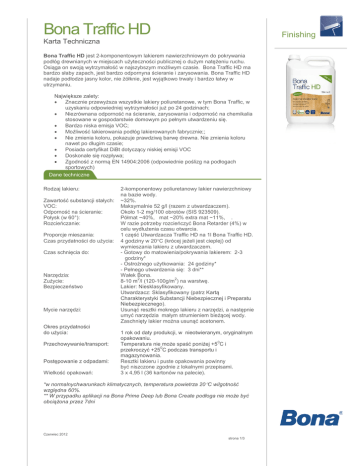 Bona Traffic HD Finishing Karta Techniczna Bona Traffic HD jest 2-komponentowym lakierem nawierzchniowym do pokrywania podłóg drewnianych w miejscach użyteczności publicznej o dużym natężeniu ruchu. Osiąga on swoją wytrzymałość w najszybszym możliwym czasie. Bona Traffic HD ma bardzo słaby zapach, jest bardzo odpornyna ścieranie i zarysowania. Bona Traffic HD nadaje podłodze jasny kolor, nie żółknie, jest wyjątkowo trwały i bardzo łatwy w utrzymaniu. Największe zalety: Znacznie przewyższa wszystkie lakiery poliuretanowe, w tym Bona Traffic, w uzyskaniu odpowiedniej wytrzymałości już po 24 godzinach; Niezrównana odporność na ścieranie, zarysowania i odporność na chemikalia stosowane w gospodarstwie domowym po pełnym utwardzeniu się. Bardzo niska emisja VOC; Możliwość lakierowania podłóg lakierowanych fabrycznie;; Nie zmienia koloru, pokazuje prawdziwą barwę drewna. Nie zmienia koloru nawet po długim czasie; Posiada certyfikat DiBt dotyczący niskiej emisji VOC Doskonale się rozpływa; Zgodność z normą EN 14904:2006 (odpowiednie poślizg na podłogach sportowych) Dane techniczne Rodzaj lakieru: Zawartość substancji stałych: VOC: Odporność na ścieranie: Połysk (w 60°): Rozcieńczanie: Proporcje mieszania: Czas przydatności do użycia: Czas schnięcia do: Narzędzia: Zużycie: Bezpieczeństwo Mycie narzędzi: Okres przydatności do użycia: Przechowywanie/transport: Postępowanie z odpadami: Wielkość opakowań: 2-komponentowy poliuretanowy lakier nawierzchniowy na bazie wody. ~32%. Maksymalnie 52 g/l (razem z utwardzaczem). Około 1-2 mg/100 obrotów (SIS 923509). Półmat ~40%, mat ~20% extra mat ~11%, . W razie potrzeby rozcieńczyć Bona Retarder (4%) w celu wydłużenia czasu otwarcia. 1 część Utwardzacza Traffic HD na 1l Bona Traffic HD. 4 godziny w 20C (krócej jeżeli jest cieplej) od wymieszania lakieru z utwardzaczem. - Gotowy do matowienia/pokrywania lakierem: 2-3 godziny* - Ostrożnego użytkowania: 24 godziny* - Pełnego utwardzenia się: 3 dni** Wałek Bona. 2 2 8-10 m /l (120-100g/m ) na warstwę. Lakier: Niesklasyfikowany. Utwardzacz: Sklasyfikowany (patrz Kartą Charakterystyki Substancji Niebezpiecznej i Preparatu Niebezpiecznego). Usunąć resztki mokrego lakieru z narzędzi, a następnie umyć narzędzia małym strumieniem bieżącej wody. Zaschnięty lakier można usunąć acetonem. 1 rok od daty produkcji, w nieotwieranym, oryginalnym opakowaniu. 0 Temperatura nie może spaść poniżej +5 C i 0 przekroczyć +25 C podczas transportu i magazynowania. Resztki lakieru i puste opakowania powinny być niszczone zgodnie z lokalnymi przepisami. 3 x 4,95 l (36 kartonów na palecie). *w normalnychwarunkach klimatycznych, temperatura powietrza 20C wilgotność względna 60%. ** W przypadku aplikacji na Bona Prime Deep lub Bona Create podłoga nie może być obciążona przez 7dni Czerwiec 2012 strona 1/3 Bona Traffic HD Finishing Karta Techniczna Przygotowanie Przed przystąpieniem do aplikacji powierzchnia musi być wcześniej zagruntowana lakierem podkładowym Bona. Upewnić się, czy podłoga jest odpowiednio przygotowana do lakierowania. Powierzchnia, która ma być lakierowana musi być dobrze wyszlifowana do surowego drewna, sucha i wolna od pyłu po szlifowaniu, oleju, wosku i innych zanieczyszczeń. Doprowadzić lakier do temperatury pokojowej, włożyć filtr, wstrząsnąć pojemnikiem 0 przed użyciem. Optymalne warunki do lakierowania są pomiędzy 18-25 C i 40-60% wilgotności względnej powietrza. Wysoka temperatura i niska wilgotność powietrza skracają czas schnięcia, a niska temperatura i wysoka wilgotność wydłużają czas schnięcia lakieru. Temperatura podłogi, powietrza i lakieru nie może spaść poniżej + 13 ° C podczas lakierowania i schnięcia. Przygotowanie podłóg wcześniej lakierowanych. Lakier Bona Traffic może być używany do nakładania na uprzednio lakierowane podłogi, ale przyczepność kolejnej warstwy lakieru należy zawsze sprawdzić przed użyciem! Podłogi zabezpieczone woskiem, pastą lub podobnymi środkami nie mogą być lakierowane. Przed przystąpieniem do aplikacji, podłoga powinna być przygotowana produktem Bona Prep. Szczegółowa instrukcja nakładania dodatkowej warstwy lakieru jest dostępna do pobrania na stronie www.bona.com. Systemy aplikacji Na surowe drewno: 1x Lakier podkładowy Bona Matowienie granulacja 150 2-3x Bona Traffic HD Na podłogi wcześniej lakierowane: 1x Bona Prep System 1-2x Bona Traffic HD Uwaga: Ze względu na ryzyko nadmiernego pęcznienia drewna nie zaleca się aplikacji więcej niż dwóch warstw lakieru dziennie Aplikacja 1. 2. 3. Dodać Utwardzacz Traffic HD do lakieru i założyć dołączony do opakowania filtr. Zamknąć szczelnie opakowanie i natychmiast zacząć wstrząsać mieszaninę, przez co najmniej 1 minutę. W przypadku używania mniejszej ilości lakieru, odlać pożądaną jego ilość do osobnego pojemnika, dodać utwardzacz (1 część utwardzacza na litr lakieru) i wymieszać jak wyżej. Mieszanina lakieru z utwardzaczem powinna być zużyta bezpośrednio po wymieszaniu nie później jednak niż w ciągu 4 godzin. Aplikować lakier przy użyciu wałka Bona. Rozprowadzać lakier po podłodze płynnymi ruchami na przemian w poprzek i wzdłuż słojów drewna unikając tworzenia się kałuż. Zawsze lakierować "mokre do mokrego", aby uniknąć powstawania nakładek. Pozostawić do wyschnięcia przed nałożeniem kolejnych warstw lakieru. Przewidywany jest nieco dłuższy czas schnięcia dla każdej następnej aplikowanej warstwy lakieru. W razie potrzeby przed ostatnią aplikacją lakieru po wyschnięciu powierzchni, należy ściąć powstałe włosy drewna i wyrównać strukturę drewna matowiąc podłogę przy użyciu Bona Scrad lub Bona siatki ściernej o granulacji 150 lub drobniejszej. Po tej operacji przed nałożeniem kolejnej warstwy lakieru usunąć pył z podłogi. Uwaga: Jeżeli czas schnięcia lakieru jes