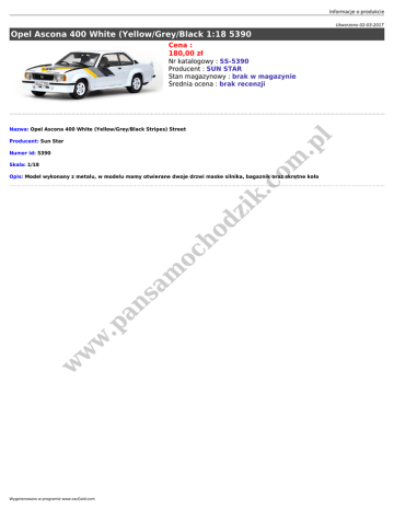 Informacje o produkcie Utworzono 02-03-2017 Opel Ascona 400 White (Yellow/Grey/Black 1:18 5390 Cena : 180,00 zł Nr katalogowy : SS-5390 Producent : SUN STAR Stan magazynowy : brak w magazynie Średnia ocena : brak recenzji l Nazwa: Opel Ascona 400 White (Yellow/Grey/Black Stripes) Street .p Producent: Sun Star om Numer id: 5390 Skala: 1/18 w w w .p an sa m oc ho dz ik .c Opis: Model wykonany z metalu, w modelu mamy otwierane dwoje drzwi maske silnika, bagaznik oraz skrętne koła Wygenerowano w programie www.oscGold.com