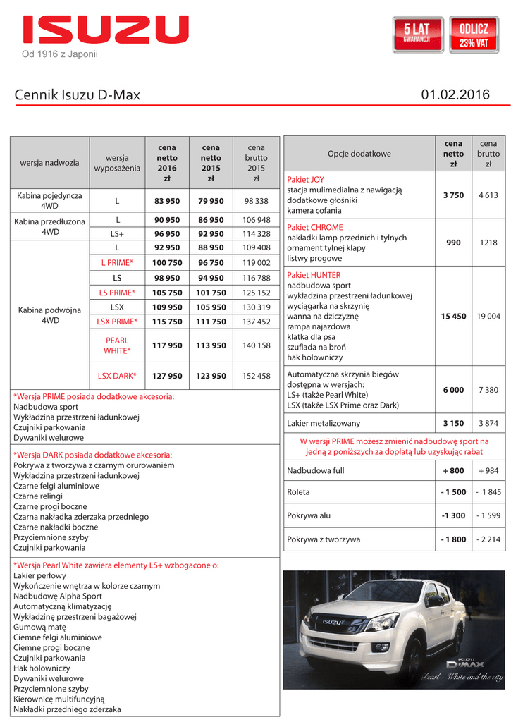 Od 1916 z Japonii Cennik Isuzu D-Max wersja nadwozia Kabina pojedyncza 4WD Kabina przedłużona 4WD Kabina podwójna 4WD 01.02.2016 cena netto 2016 zł cena netto 2015 zł cena brutto 2015 zł L 83 950 79 950 98 338 L 90 950 86 950 106 948 LS+ 96 950 92 950 114 328 L 92 950 88 950 109 408 L PRIME* 100 750 96 750 119 002 LS 98 950 94 950 116 788 LS PRIME* 105 750 101 750 125 152 LSX 109 950 105 950 130 319 LSX PRIME* 115 750 111 750 137 452 PEARL WHITE* 117 950 113 950 140 158 LSX DARK* 127 950 123 950 152 458 wersja wyposażenia *Wersja PRIME posiada dodatkowe akcesoria: Nadbudowa sport Wykładzina przestrzeni ładunkowej Czujniki parkowania Dywaniki welurowe *Wersja DARK posiada dodatkowe akcesoria: Pokrywa z tworzywa z czarnym orurowaniem Wykładzina przestrzeni ładunkowej Czarne felgi aluminiowe Czarne relingi Czarne progi boczne Czarna nakładka zderzaka przedniego Czarne nakładki boczne Przyciemnione szyby Czujniki parkowania *Wersja Pearl White zawiera elementy LS+ wzbogacone o: Lakier perłowy Wykończenie wnętrza w kolorze czarnym Nadbudowę Alpha Sport Automatyczną klimatyzację Wykładzinę przestrzeni bagażowej Gumową matę Ciemne felgi aluminiowe Ciemne progi boczne Czujniki parkowania Hak holowniczy Dywaniki welurowe Przyciemnione szyby Kierownicę multifuncyjną Nakładki przedniego zderzaka cena netto zł cena brutto zł Pakiet JOY stacja mulimedialna z nawigacją dodatkowe głośniki kamera cofania 3 750 4 613 Pakiet CHROME nakładki lamp przednich i tylnych ornament tylnej klapy listwy progowe 990 1218 Pakiet HUNTER nadbudowa sport wykładzina przestrzeni ładunkowej wyciągarka na skrzynię wanna na dziczyznę rampa najazdowa klatka dla psa szuflada na broń hak holowniczy 15 450 19 004 Automatyczna skrzynia biegów dostępna w wersjach: LS+ (także Pearl White) LSX (takźe LSX Prime oraz Dark) 6 000 7 380 Lakier metalizowany 3 150 3 874 Opcje dodatkowe W wersji PRIME możesz zmienić nadbudowę sport na jedną z poniższych za dopłatą lub uzyskując rabat Nadbudowa full + 800 + 984 Roleta - 1 500 - 1 845 Pokrywa alu -1 300 - 1 599 Pokrywa z tworzywa - 1 800 - 2 214 L S LS S LS+ S LSX S/S S S S S S S S S S S S S S S S S S S S S S S S S S S S S S S S S S S S S S S S S S S S S S S S S S S S S S S S S S S S S S S S S S S S S S S S S S S S S S S S S S S S S S - - - S - S - S S S - - - -/S -/S S/- S/- S S -/S S S S/- S S -/S S S -/S - S S S/S S S S S S S S/S S S S S S - - - - - - S - S S S S S S S S S S S S S S S S S KOMFORT Immobiliser / autoalarm System zapobiegający blokowaniu kół podczas hamowania - ABS System elektronicznego rozdziału siły hamowania - EBD System stabilizacji toru jazdy - ESC System kontroli trakcji - TCS Przednie poduszki powietrzne (kierowca, pasażer) Elektroniczny mechanizm różnicowy o ograniczonym poślizgu Boczne poduszki powietrzne Przednie pasy bezpieczeństwa zintegrowane z systemem SRS Regulacja wysokości przednich pasów bezpieczeństwa Tylne pasy bezpieczeństwa Kurtynowe poduszki powietrzne System bezpieczeństwa biernego - SRS w połączeniu z poduszkami powietrznymi Kontrolka zapięcia pasów bezpieczeństwa ISOFIX - kabina podwójna Zaczep do holownaia (przód) Osłona miski olejowej Osłona skrzynki rozdzielczej Osłona zbiornika paliwa Teleskopowa kolumna kierownicza Poszerzone błotniki Uchwyty wewnętrzne skrzyni ładunkowej - kabina przedłużona i podwójna Uchwyty zewnętrzne skrzyni ładunkowej - kabina pojedyncza Centralna klamka tylnej klapy czarna / w kolorze Centralna klamka tylnej klapy w kolorze nadwozia Centralna klamka tylnej klapy (chromowana) Boczne klamki tylnej klapy (w kolorze nadwozia) kabina pojedyncza Antena (montowana na dachu centralnie z przodu / z boku) Światła do jazdy dziennej Światła do jazdy dziennej z lampami przeciwmgielnymi Reflektory (światła mijania i drogowe) halogenowe Reflektory (światła mijania i drogowe) projekcyjne Światła przeciwmgielne przednie / tylne Przedni zderzak z szarego tworzywa Przedni zderzak w kolorze nadwozia Tylny zderzak z ochronnymi nakładkami Chromowane wykończenie tylnego zderzaka Przedni grill z tworzywa czarnego / szarego Przedni grill chromowany Lusterka boczne w obudowie z szarego tworzywa sterowane manualnie Progi boczne Lusterka boczne w obudowie chromowanej ogrzewane, sterowane elektrycznie z kierunkowskazami Chromowana listwa na przedniej masce Chromowane progi boczne Zamek centralny Zamek centralny sterowany z kluczyka Tylne światła LED Trzecie światło stop AUDIO STYLIZACJA BEZPIECZEŃSTWO Specyfikacja Osłona tylnej ściany kabiny - kabina pojedyncza Uchwyty w słupkach A Kolumna kierownicza z regulacją kąta pochylenia Kierownica i uchwyt dźwigni zmiany biegów z tworzywa Kierownica i uchwyt dźwigni zmiany biegów skórzane Wspomaganie kierownicy Tempomat sterowany z kierownicy Zegar Przednie szyby sterowane elektrycznie Tylne szyby sterowane elektrycznie - kabina podwójna System zapobiegający przytrzaśnięciu palców po stronie kierowcy Ogrzewana tylna szyba Tryb przerywany pracy wycieraczek Regulowany tryb pracy wycieraczek Uchwyty na napoje Drzwi przednie/deska rozdzielcza/pomiędzy przednimi fotelami Osłony przeciwsłoneczne kierowcy i pasażera Podnóżek kierowcy Otwieranie wlewu paliwa z wnętrza pojazdu Klimatyzacja manualna Klimatyzacja automatyczna Popielniczka i zapalniczka Gniazdo 12V w schowku po stronie pasażera Schowek pasażera / zamykany na kluczyk Wieszak na ubranie Regulowane zagłówki 2 składane tylne siedzenia - kabina przedłużona Tylna kanapa składana oraz dzielona (60/40 – siedzisko) – kabina podwójna Schowki w oparciach przednich foteli Podłokietnik w tylnej kanapie Lampka oświetlenia wnętrza Lampki do czytania dla kierowcy i pasażera przód / tył Regulowana wysokość fotela kierowcy Tapicerka skórzana Fotel kierowcy z elektryczną regulacją położenia Ogrzewane fotele przednie Wskaźniki z multifunkcyjnym wyświetlaczem centralnym Schowek w konsoli centralnej Schowek w konsoli central