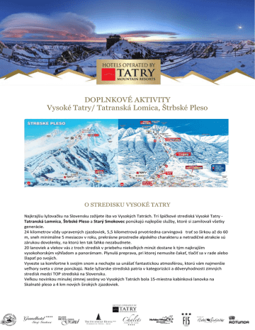 DOPLNKOVÉ AKTIVITY Vysoké Tatry/ Tatranská Lomica, Štrbské Pleso O STREDISKU VYSOKÉ TATRY Najkrajšiu lyžovačku na Slovensku zažijete iba vo Vysokých Tatrách. Tri špičkové strediská Vysoké Tatry Tatranská Lomnica, Štrbské Pleso a Starý Smokovec ponúkajú najlepšie služby, ktoré si zamilovali všetky generácie. 24 kilometrov vždy upravených zjazdoviek, 5,5 kilometrová prvotriedna carvingová trať so šírkou až do 60 m, sneh minimálne 5 mesiacov v roku, prekrásne prostredie alpského charakteru a netradičné atrakcie sú zárukou dovolenky, na ktorú len tak ľahko nezabudnete. 20 lanoviek a vlekov vás z troch stredísk v priebehu niekoľkých minút dostane k tým najkrajším vysokohorským výhľadom a panorámam. Plynulá preprava, pri ktorej nemusíte čakať, tlačiť sa v rade alebo šlapať po svojich. Vyvezte sa komfortne k svojim snom a nechajte sa unášať fantastickou atmosférou, ktorú vám najmenšie veľhory sveta v zime ponúkajú. Naše lyžiarske strediská patria v kategorizácii a dôveryhodnosti zimných stredísk medzi TOP strediská na Slovensku. Veľkou novinkou minulej zimnej sezóny vo Vysokých Tatrách bola 15-miestna kabínková lanovka na Skalnaté pleso a 4 km nových širokých zjazdoviek. NOČNÉ SÁNKOVANIE Miesto: Hrebienok Počet osôb: neobmedzene Cena: 8€ (jedna jazda lanovka + sane) Popis: Nezabudnuteľný večer plný zábavy a dobrodružstva počas nočnej sánkovačky s možnosťou občerstvenia priamo na svahu (varené vínko, čaj) Obmedzenie: Koná sa pri minimálnom počte 10 os. a teplote vyššej ako -20°C, utorok, piatok a sobota VÝLET NA LOMNICKÝ ŠTÍT Miesto: Lomnický Štít Počet osôb: podľa prevádzky lanovky Cena: 46€ (vývoz a zvoz lanovkou) Popis: Z údolnej stanice v Tatranskej Lomnici vedie 4 miestna kabínková lanovka na medzistanicu Štart, odkiaľ Vás vyvezie nová moderná 15-miestna gondola na Skalnaté pleso. Odtiaľ Vás na štít vyvezie unikátna visutá červená lanovka, ktorá prekonáva 855 metrové prevýšenie a jazda trvá 8,5 minúty. Obmedzenie: prevádzka lanoviek záleží na počasí LYŽIARSKE PRETEKY Miesto: Tatranská Lomnica – Čučoriedky západ Počet osôb: neobmedzene Cena: 2.000€ Popis: Radi pre vás zorganizujeme lyžiarske preteky s možnosťou občerstvenia priamo na svahu. Bude pre vás pripravená ohraničená trať, časomiera, s možnosťou doplnenia o cieľový oblúk a ozvučenie Obmedzenie: počasie FUN TOOLS A SÁNKOVAČKA Miesto: Tatranská Lomnica, Štrbské Pleso, Starý Smokovec Počet osôb: neobmedzene Cena: od 5€/osoba Popis: Zabavte sa na zimných funtools - adrenalínových atrakciách, ktoré garantujú výbornú zábavu aj pre nelyžiarov. Skifox, Snowbike, Snowscoot, Snowtubing, radi vám poradíme Obmedzenie: počasie TATRANSKÁ VEČERA ZÁŽITKOV Miesto: Pizza&Pasta Štart Počet osôb: 20 osôb v tatraku Cena: 42€ (vývoz lanovkou a tatrakom, večera, prípitok) Popis: Po zotmení začína ten pravý gurmánsky zážitok. V tom čase začína aj naša jedinečná Tatranská večera zážitkov v Reštaurácii Pizza&Pasta. Doprajte si netradičný večer plný gurmánskych špecialít zo svetových kuchýň. Nebude chýbať aj dávka adrenalínu, ako sa na správne horské prostredie patrí – jazda na tatraku je niečím skutočne dobrodružným. Obmedzenie: Snehové podmienky, kapacita reštaurácie do 150 miest FRESH TRACK Miesto: Lomnické Sedlo, Skalnaté Pleso Počet osôb: neobmedzene Čas: 7:00 – budete prví na svahu Cena: 29€ Popis: Zalyžujte si spolu s profesionálnym sprievodcom ešte pred oficiálnym spustením lanoviek! Lanovky Vás vyvezú až do výšky 2 200 m n. m. a z Lomnického sedla (v prípade nevhodných snehových podmienok na Skalnaté pleso) si vychutnáte niekoľko jázd po dokonalej zjazdovke a ako vyvrcholenie si doprajte chutné raňajky na terase na Skalnatom Plese. Obmedzenie: snehové podmienky, počasie Náš event koordinátor pre Vás rád zabezpečí aktivity a teambuilding na mieru!