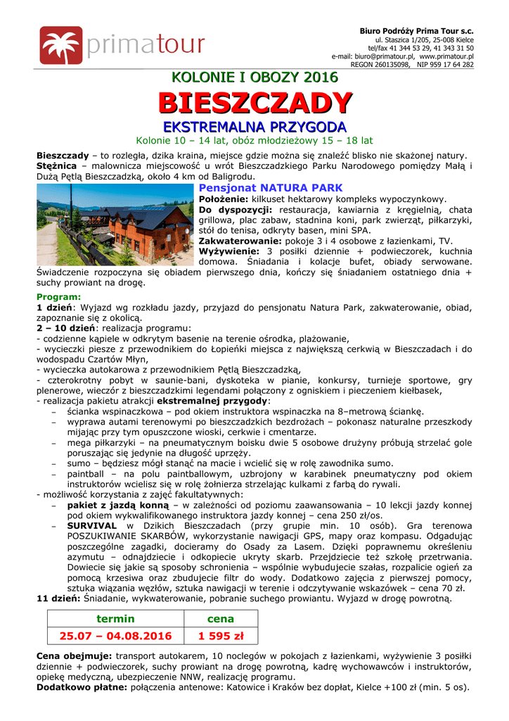 Biuro Podróży Prima Tour s.c. ul. Staszica 1/205, 25-008 Kielce tel/fax 41 344 53 29, 41 343 31 50 e-mail: [email protected], www.primatour.pl REGON 260135098, NIP 959 17 64 282 KOLONIE I OBOZY 2016 BIESZCZADY EKSTREMALNA PRZYGODA Kolonie 10 – 14 lat, obóz młodzieżowy 15 – 18 lat Bieszczady – to rozległa, dzika kraina, miejsce gdzie można się znaleźć blisko nie skażonej natury. Stężnica – malownicza miejscowość u wrót Bieszczadzkiego Parku Narodowego pomiędzy Małą i Dużą Pętlą Bieszczadzką, około 4 km od Baligrodu. Pensjonat NATURA PARK Położenie: kilkuset hektarowy kompleks wypoczynkowy. Do dyspozycji: restauracja, kawiarnia z kręgielnią, chata grillowa, plac zabaw, stadnina koni, park zwierząt, piłkarzyki, stół do tenisa, odkryty basen, mini SPA. Zakwaterowanie: pokoje 3 i 4 osobowe z łazienkami, TV. Wyżywienie: 3 posiłki dziennie + podwieczorek, kuchnia domowa. Śniadania i kolacje bufet, obiady serwowane. Świadczenie rozpoczyna się obiadem pierwszego dnia, kończy się śniadaniem ostatniego dnia + suchy prowiant na drogę. Program: 1 dzień: Wyjazd wg rozkładu jazdy, przyjazd do pensjonatu Natura Park, zakwaterowanie, obiad, zapoznanie się z okolicą. 2 – 10 dzień: realizacja programu: - codzienne kąpiele w odkrytym basenie na terenie ośrodka, plażowanie, - wycieczki piesze z przewodnikiem do Łopieńki miejsca z największą cerkwią w Bieszczadach i do wodospadu Czartów Młyn, - wycieczka autokarowa z przewodnikiem Pętlą Bieszczadzką, - czterokrotny pobyt w saunie-bani, dyskoteka w pianie, konkursy, turnieje sportowe, gry plenerowe, wieczór z bieszczadzkimi legendami połączony z ogniskiem i pieczeniem kiełbasek, - realizacja pakietu atrakcji ekstremalnej przygody: – ścianka wspinaczkowa – pod okiem instruktora wspinaczka na 8–metrową ściankę. – wyprawa autami terenowymi po bieszczadzkich bezdrożach – pokonasz naturalne przeszkody mijając przy tym opuszczone wioski, cerkwie i cmentarze. – mega piłkarzyki – na pneumatycznym boisku dwie 5 osobowe drużyny próbują strzelać gole poruszając się jedynie na długość uprzęży. – sumo – będziesz mógł stanąć na macie i wcielić się w rolę zawodnika sumo. – paintball – na polu paintballowym, uzbrojony w karabinek pneumatyczny pod okiem instruktorów wcielisz się w rolę żołnierza strzelając kulkami z farbą do rywali. - możliwość korzystania z zajęć fakultatywnych: – pakiet z jazdą konną – w zależności od poziomu zaawansowania – 10 lekcji jazdy konnej pod okiem wykwalifikowanego instruktora jazdy konnej – cena 250 zł/os. – SURVIVAL w Dzikich Bieszczadach (przy grupie min. 10 osób). Gra terenowa POSZUKIWANIE SKARBÓW, wykorzystanie nawigacji GPS, mapy oraz kompasu. Odgadując poszczególne zagadki, docieramy do Osady za Lasem. Dzięki poprawnemu określeniu azymutu – odnajdziecie i odkopiecie ukryty skarb. Przejdziecie też szkołę przetrwania. Dowiecie się jakie są sposoby schronienia – wspólnie wybudujecie szałas, rozpalicie ogień za pomocą krzesiwa oraz zbudujecie filtr do wody. Dodatkowo zajęcia z pierwszej pomocy, sztuka wiązania węzłów, sztuka nawigacji w terenie i odczytywanie wskazówek – cena 70 zł. 11 dzień: Śniadanie, wykwaterowanie, pobranie suchego prowiantu. Wyjazd w drogę powrotną. termin cena 25.07 – 04.08.2016 1 595 zł Cena obejmuje: transport autokarem, 10 noclegów w pokojach z łazienkami, wyżywienie 3 posiłki dziennie + podwieczorek, suchy prowiant na drogę powrotną, kadrę wychowawców i instruktorów, opiekę medyczną, ubezpieczenie NNW, realizację programu. Dodatkowo płatne: połączenia antenowe: Katowice i Kraków bez dopłat, Kielce +100 zł (min. 5 os).