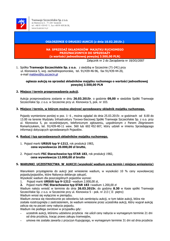 OGŁOSZENIE O DRUGIEJ AUKCJI (z dnia 10.02.2015r.) NA SPRZEDAŻ SKŁADNIKÓW MAJĄTKU RUCHOMEGO PRZEZNACZONYCH DO SPRZEDAŻY (o wartości jednostkowej powyżej 3.500,00 PLN) Załącznik nr 2 do Zarządzenia nr 18/DO/2007 1. Spółka Tramwaje Szczecińskie Sp. z o.o. z siedzibą w Szczecinie (71-241) przy ul. Klonowica 5, woj. zachodniopomorskie, tel. 91/439-46-96, fax 91/439-44-20, e-mail [email protected] ogłasza aukcję na sprzedaż składników majątku ruchomego o wartości jednostkowej powyżej 3.500,00 PLN 2. Miejsce i termin przeprowadzenia aukcji. Aukcja przeprowadzona zostanie w dniu 26.03.2015r. o godzinie 09,00 w siedzibie Spółki Tramwaje Szczecińskie Sp. z o.o. w Szczecinie przy ul. Klonowica 5, pok. nr 103. 3. Miejsce i termin, w którym można obejrzeć sprzedawany składnik majątku ruchomego. Pojazdy wymienione poniżej w poz. 1- 6 , można oglądać do dnia 25.03.2015r. w godzinach od 8.00 do 13.00 na terenie Wydziału Infrastruktury Torowo-Sieciowej Spółki Tramwaje Szczecińskie Sp. z o.o. przy ul. Klonowica 5, po wcześniejszym, telefonicznym zgłoszeniu, uzgodnionym z Panem Zbigniewem Romańczukiem, tel. 91/439-40-11 wew. 560 lub 602 452 607, który udzieli w imieniu Sprzedającego informacji dotyczących sprzedawanych Pojazdów. 4. Rodzaj i typ sprzedawanych składników majątku ruchomego. 1. Pojazd marki URSUS typ V-1212, rok produkcji 1983, cena wywoławcza 20.000,00 zł brutto, 2. Pojazd marki FSC Starachowice typ STAR 183, rok produkcji 1982, cena wywoławcza 12.000,00 zł brutto 5. WARUNKI UCZESTNICTWA W AUKCJI (wysokość wadium oraz termin i miejsce wniesienia) Warunkiem przystąpienia do aukcji jest wniesienie wadium, w wysokości 10 % ceny wywoławczej pojazdu/pojazdów, które Nabywca deklaruje zakupić. Wysokość wadium dla poszczególnych pojazdów wynosi: 1. Pojazd marki URSUS typ V-1212 –wadium 2.000,00 zł, 2. Pojazd marki FSC Starachowice typ STAR 183 –wadium 1.200,00 zł Wadium należy wnieść w terminie do dnia 26.03.2015r. do godziny 8.30 w Kasie spółki Tramwaje Szczecińskie Sp. z o.o. w Szczecinie przy ul. Klonowica 5 - pok. nr 213 ( II piętro) Wadium wnosi się wyłącznie w pieniądzu. Wadium zwraca się niezwłocznie po odwołaniu lub zamknięciu aukcji, w tym także aukcji, która nie została rozstrzygnięta z zastrzeżeniem, że wadium wniesione przez uczestnika aukcji, który wygrał aukcję zalicza się na poczet ceny nabycia pojazdu. Wadium nie podlega zwrotowi w przypadku gdy: – uczestnik aukcji, któremu udzielono przybicia nie uiścił ceny nabycia w wymaganym terminie 21 dni od dnia przybicia, tracąc prawo zakupu tramwajów, – umowa nie została zawarta z przyczyn Kupującego, w wymaganym terminie 31 dni od dnia przybicia na aukcji. 6. WARUNEK PRZEPROWADZENIA AUKCJI Warunkiem przeprowadzenia aukcji będzie stawienie się co najmniej jednego potencjalnego nabywcy, który spełni również warunek wymieniony w pkt 5 niniejszego ogłoszenia. Aukcja nie zostanie przeprowadzona jeżeli żaden z uczestników aukcji nie zaoferuje co najmniej ceny wywoławczej. 7. Podczas aukcji obowiązywać będzie minimalna wysokość postąpienia, która wynosi 100,00 zł za jeden pojazd. Po ustaniu postąpień prowadzący aukcję, uprzedzając obecnych, po trzecim ogłoszeniu zamknie aukcję i udzieli przybicia licytantowi, który zaoferował najwyższą cenę. 8. Wpłacenie ceny nabycia i podpisanie umowy sprzedaży Cena nabycia pozostała do zapłaty przez Nabywcę pomniejszona jest o kwotę wadium, którą Nabywca wpłacił na poczet tej ceny przed aukcją. Nabywca zobowiązany jest zapłacić cenę nabycia przed podpisaniem umowy, w terminie do 21 dni od udzielenia Nabywcy przybicia. Cenę nabycia należy wpłacić przelewem na konto Spółki Tramwaje Szczecińskie Sp. z o.o.. Warunek wpłaty ceny nabycia na konto Spółki Tramwaje Szczecińskie Spółka z o.o. w terminie 21 dni od dnia przybicia, dotrzymany będzie jedynie w sytuacji gdy środki pieniężne znajdą się na koncie Spółki. Nie będzie brana pod uwagę data stempla pocztowego/bankowego. Po zapłaceniu przez Kupującego ceny nabycia, nastąpi zawarcie umowy sprzedaży przedmiotu aukcji. Termin zawarcia umowy ustalony będzie w drodze odrębnych uzgodnień po rozstrzygnięciu aukcji, z zastrzeżeniem, że nie będzie dłuższy niż 31 dni od dnia przybicia. Informacje i dokumenty, które nabywca zobowiązany jest przedstawić/złożyć przed podpisaniem lub wraz z podpisaną umową sprzedaży do Działu Zamówień Publicznych i Marketingu Spółki Tramwaje Szczecińskie Sp. z o.o.: 1. jeżeli Nabywcą jest firma ( również osoba fizyczna prowadząca zarejestrowana działalność gospodarczą ), wówczas złożyć należy kserokopie następujących dokumentów, potwierdzone za zgodność z oryginałem: - Aktualny odpis z właściwego rejestru albo aktualne zaświadczenie o wpisie do ewidencji działalności gospodarczej, - NIP, - REGON, - oraz w formie kserokopii dowód zapłaty ceny nabycia. 2. jeżeli Nabywcą jest osoba fizyczna, (nie prowadząca zarejestrowanej działalności gospodarczej), wówczas podać należy następujące dane:: Nazwisko i imię, Adres zamieszkania, Do wglądu: dowód osobisty, celem potwierdzenia imienia i nazwiska nabywcy, numeru dowodu osobistego i numeru Pesel; oraz w formie kserokopii dowód zapłaty ceny nabycia. Wydanie Nabywcy przedmiotu sprzedaży, nastąpi po zapłaceniu ceny nabycia i podpisaniu umowy, w terminie ustalonym ze Sprzedającym. Pojazd/pojazdy przechodzą na własność Nabywcy z chwilą zapłaty i ich wydania. 9. Unieważnienie ( odwołanie ) i powtórzenie aukcji. Zmiana warunków uczestnictwa w aukcji. Jeżeli warunki wymienione w pkt 5, 6 i 8 niniejszego ogłoszenia nie zostaną spełnione, aukcja zostanie unieważniona. Aukcja zostanie powtórzona, jeżeli poprzednia aukcja została unieważniona i nie zakończyła się zawarciem umowy sprzedaży. Aukcja może być powtórzona tylko jeden raz. W przypadku, gdy