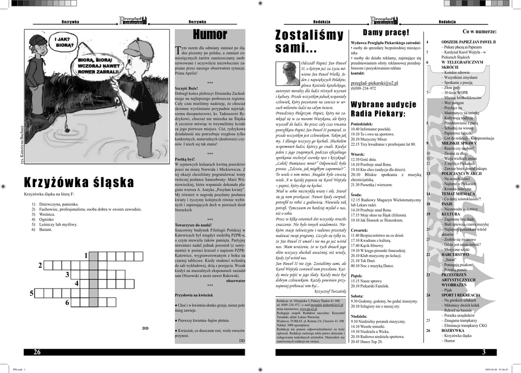 Rozr y wka Rozr y wka Humor T ym razem dla odmiany zamiast po śląsku piszemy po polsku, a zamiast comiesięcznych żartów zamieszczamy zaobserwowane i oczywiście niezwłocznie zapisane przez naszego obserwatora sytuacje. Prima Aprilis! rys. Katarzyna Buchacz *** Szczęść Boże! Dobiegł końca plebiscyt Dziennika Zachodniego na najlepszego proboszcza regionu. Cały czas mieliśmy nadzieję, że chociaż skromne wyróżnienie przypadnie największemu duszpasterzowi, ks. Tadeuszowi Rydzykowi, chociaż nie mieszka na Śląsku A szczerze mówiąc to trzymaliśmy kciuki za jego pierwsze miejsce. Cóż, rydzykowa działalność nie potrzebuje rozgłosu tylko konkretnych, materialnych (dosłownie) czynów. I niech się tak stanie! *** Poetką być! W sejmowych kuluarach kwitną prawdziwi poeci na miarę Norwida i Mickiewicza. Z tej okazji chcieliśmy pogratulować weny twórczej posłance Samoobrony- Marii Wiśniowieckiej, która wspaniale dokonała plagiatu wiersza A. Asnyka „Posyłam kwiaty”. My również w nagrodę posyłamy posłance kwiaty i życzymy kolejnych równie wybitnych i zapierających dech w piersiach dzieł literackich. K r z y ż ó w k a ś l ąsk a Krzyżówka śląska na literę F: 1) 2) 3) 4) 5) 6) Dziewczyna, panienka. Fachowiec, profesjonalista; osoba dobra w swoim zawodzie. Woźnica. Ognisko Leśniczy lub myśliwy. Bażant. *** Towarzysze do nauki! Szacowny budynek Filologii Polskiej w Katowicach był niegdyś siedzibą PZPR-u, o czym niewielu żaków pamięta. Partyjny inwentarz nadal jednak pozostał (z sentymentu) w postaci krzeseł z napisem PZPRKatowice, wygrawerowanym z boku na czarnej tabliczce. Kiedy studenci wchodzą do sali wykładowej, drżą z przejęcia. Wszak kiedyś na muzealnych eksponatach zasiadał sam Olszowski a może nawet Rakowski. obserwator *** 1 2 3 4 5 Przysłowia na kwiecień. 6 ● Choć i w kwietniu słonko grzeje, nieraz pole śnieg zawieje. ● Pierwszy kwietnia–bajów pletnia. DD 26 PP6.indd 1 Redakcja Redakcja ● Kwiecień, co deszczem rosi, wiele owoców przynosi. DD Z os t aliś m y s ami . . . Odszedł Papież Jan Paweł II, o którym już za życia mówiono Jan Paweł Wielki. Jeden z największych Polaków, głowa Kościoła katolickiego, autorytet moralny dla ludzi różnych wyznań i kultury. Przede wszystkim jednak wspaniały człowiek, który pozostanie na zawsze w sercach milionów ludzi na całym świecie. Prawdziwy Pielgrzym. Papież, który nie zamknął się w za murami Watykanu, ale który wyszedł do ludzi. Bo przez cały czas trwania pontyfikatu Papież Jan Paweł II pamiętał, że przede wszystkim jest człowiekiem. Takim jak my. I dlatego wszyscy go kochali. Słuchałem wspomnień ludzi, którzy go znali. Kiedyś jeden z jego znajomych, podczas oficjalnego spotkania rozłożył szeroko ręce i krzyknął: „Lolek! Pamiętasz mnie?” Odpowiedź była prosta: „Zdzisiu, jak mógłbym zapomnieć?”. To wiele o nim mówi. Anegdot było zresztą wiele. A w każdej pojawia się Karol Wojtyła – papież, który daje się kochać. Miał w sobie niezwykłą wiarę i siłę. Starał się ją nam przekazać. Nawet kiedy cierpiał, potrafił to robić z godnością. Niewielu tak potrafi. Tymczasem on bardziej myślał o nas, niż o sobie. Przez te kilka ostatnich dni wszystko straciło znaczenie. Nie było innych wiadomości. Niektóre stacje telewizyjne i radiowe przestały nadawać swoje programy. Liczyło się tylko to, że Jan Paweł II umarł i nie ma go już wśród nas. Mam wrażenie, że w tych dniach jego słów wszyscy słuchali uważniej, niż wtedy, kiedy żył wśród nas. Jan Paweł II nie żyje. Zostaliśmy sami, ale Karol Wojtyła zostawił nam przesłanie. Każdy może pójść w jego ślady. Każdy może być dobrym człowiekiem. Każdy powinien przynajmniej próbować nim być... Krzysztof Turzański Redakcja: ul. Olimpijska 3; Piekary Śląskie 41–940 tel. 0509–234–972 ; e–mail:przeglad–[email protected] stona internetowa: www.pp.u2.pl Redaguje zespół. Redaktor naczelny: Krzysztof Turzański, skład: Łukasz Warzecha. Wydawca: TURKAT, ul. Różana 2/6; Chorzów 41–500 Nakład: 3000 egzemplarzy Redakcja nie ponosi odpowiedzialności za treść ogłoszeń. Redakcja zastrzega sobie prawo skracania i redagowania nadesłanych artykułów. Materiałów nie zamówionych redakcja nie zwraca. Co w numerze: Damy pracę! Wydawca Przeglądu Piekarskiego zatrudni: • osoby do sprzedaży bezpośredniej miesięcznika • osoby do działu reklamy, zajmujące się przedstawianiem oferty reklamowej przedsiębiorcom i pozyskiwaniem reklam kontakt: 4 5 6 przeglad–[email protected] (0)509–234–972 7 W y b r a n e a u d y cje Radia P iek ar y : Poniedziałek: 10.40 Informator poselski. 19.10 To i owo na sportowo. 20.10 Muzyczny Mixer. 22.15 Trzy kwadranse z przebojami lat 80. 8 Wtorek: 12.10 Gość dnia. 14.10 Przeboje znad Renu. 19.10 Kto chce (audycja dla dzieci). 20.10 Bliskie spotkania z muzyką chrześcijańską. 21.30 Piosenką i wierszem. 10 11 12 Środa: 12.15 Radiowy Magazyn Wielotematyczny lub Lekarz radzi. 14.10 Przeboje znad Renu. 17.15 Moje okno na Śląsk (felieton). 19.10 Jak Ślonzok ze Ślonzokiem. 14 Czwartek: 11.40 Bezpieczeństwo na co dzień. 17.10 Kwadrans z kulturą. 17.40 Kącik filmowy. 19.10 W kręgu piosenki francuskiej. 20.10 Klub muzyczny po kolacji. 21.10 Tok Duet. 00.10 Noc z muzyką Dance. 20 Piątek: 15.15 Nasze sprawy. 20.10 Piekarski Familok. 23 Sobota: 9.30 Godomy, godomy, bo godać muszymy. 20.10 Szlagiery nie z naszej ery. 24 Niedziela: 9.10 Niedzielny poranek muzyczny. 14.10 Wesołe minutki. 19.10 Niedziela u Wicka. 20.10 Radiowa niedziela sportowa. 20.45 Dance Top 20. 9 13 18 19 21 22 25 26 ODSZEDŁ PAPIEŻ JAN PAWEŁ II – Piekary płaczą za Papieżem – Kardynał Karol Wojtyła - w Piekarach Śląskich W TELEGRAFICZNYM SKRÓCIE – Końskie zdrowie – Wszystkimi zmysłami – Spotkanie z poezją – Złote gody – 30-lecie WOPR – Miesiąc krótkof