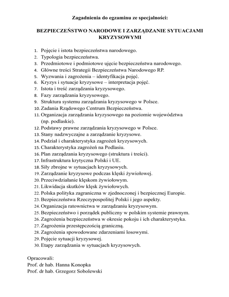 Zagadnienia do egzaminu ze specjalności: BEZPIECZEŃSTWO NARODOWE I ZARZĄDZANIE SYTUACJAMI KRYZYSOWYMI 1. Pojęcie i istota bezpieczeństwa narodowego. 2. Typologia bezpieczeństwa. 3. Przedmiotowe i podmiotowe ujęcie bezpieczeństwa narodowego. 4. Główne treści Strategii Bezpieczeństwa Narodowego RP. 5. Wyzwania i zagrożenia – identyfikacja pojęć. 6. Kryzys i sytuacje kryzysowe – interpretacja pojęć. 7. Istota i treść zarządzania kryzysowego. 8. Fazy zarządzania kryzysowego. 9. Struktura systemu zarządzania kryzysowego w Polsce. 10. Zadania Rządowego Centrum Bezpieczeństwa. 11. Organizacja zarządzania kryzysowego na poziomie województwa (np. podlaskie). 12. Podstawy prawne zarządzania kryzysowego w Polsce. 13. Stany nadzwyczajne a zarządzanie kryzysowe. 14. Podział i charakterystyka zagrożeń kryzysowych. 15. Charakterystyka zagrożeń na Podlasiu. 16. Plan zarządzania kryzysowego (struktura i treści). 17. Infrastruktura krytyczna Polski i UE. 18. Siły zbrojne w sytuacjach kryzysowych. 19. Zarządzanie kryzysowe podczas klęski żywiołowej. 20. Przeciwdziałanie klęskom żywiołowym. 21. Likwidacja skutków klęsk żywiołowych. 22. Polska polityka zagraniczna w zjednoczonej i bezpiecznej Europie. 23. Bezpieczeństwa Rzeczypospolitej Polski i jego aspekty. 24. Organizacja ratownictwa w zarządzaniu kryzysowym. 25. Bezpieczeństwo i porządek publiczny w polskim systemie prawnym. 26. Zagrożenia bezpieczeństwa w okresie pokoju i ich charakterystyka. 27. Zagrożenia przestępczością graniczną. 28. Zagrożenia spowodowane zdarzeniami losowymi. 29. Pojęcie sytuacji kryzysowej. 30. Etapy zarządzania w sytuacjach kryzysowych. Opracowali: Prof. dr hab. Hanna Konopka Prof. dr hab. Grzegorz Sobolewski