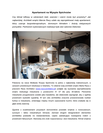 Apartament na Wyspie Spichrzów Czy klimat loftowy w odcieniach bieli, szarości i czerni może być przytulny? Jak najbardziej. Architekt wnętrz Marcie Racy udało się zaprojektować mały apartament, który czaruje bezpretensjonalnym, domowym klimatem i ilością nietypowych pomysłów. Partnerem wykonawczym realizacji była sieć salonów Dekorian. Położona na rzece Motławie Wyspa Spichrzów to jedna z najbardziej malowniczych, a zarazem prestiżowych lokalizacji w Gdańsku. To właśnie tutaj architekt wnętrz Marta Raca z pracowni Raca Architekci (www.raca-architekci.pl) podjęła się wyzwania zaprojektowania wnętrz niedużego mieszkania o powierzchni 41 m² dla pary 30-latków. Pierwotnie mieszkanie przygotowane zostało jako kawalerka, ale właściciele zapragnęli, aby z ogólnej przestrzeni wydzielić sypialnię. W tym celu architektka znacznie przearanżowała rozkład funkcji w mieszkaniu, zmieniając między innymi usytuowanie kuchni, która znalazła się w głębi strefy dziennej Zgodnie z oczekiwaniami przyszłych domowników powstało wnętrze o nowoczesnym, surowym i lekko industrialnym klimacie. Zamiast drogich designerskich elementów architektka postawiła na niestandardowe, często zaskakujące rozwiązania rodem z przestrzeni fabrycznych. Stanowią one znak rozpoznawczy i atut mieszkania. Klimat wnętrza budują m.in. pomalowane na biało ceglane płytki zakupione w salonie z wyposażeniem wnętrz Dekorian ( www.dekorian.pl ) oraz industrialne oświetlenie - czarne kable poprowadzone po suficie i „nagie” żarówki z kolorowymi oplotami. Ta surowość materiałów została złagodzona subtelnymi mandalami, które stały się motywem przewodnim wystroju. Najciekawszą z nich- sowę, architektka umieściła w salonie. Jest to wielkoformatowy nadruk na płycie PCV. Zabieg ten pozwolił na przełamanie monotonii głównej ściany. Bardzo ważną rolę we wnętrzu pełnią kolory. Architekt Marta Raca zdecydowała się na chłodne biele, czernie i szarości z palety kanadyjskiej marki Para Paints (więcej informacji na www.para.pl ), które tworzą w apartamencie spokojną, zrównoważoną aurę. W całym mieszkaniu zastosowano farbę Elite Ceramic 4090 (Para Paints) o podwyższonej odporności na usuwanie zabrudzeń, która ułatwi właścicielom utrzymanie mieszkania w czystości. Pomimo zastosowania chłodnych odcieni we wnętrzu panuje przytulny, domowy klimat. Przełamaniem stonowanej kolorystyki są niebieskie akcenty w postaci tekstyliów i dekoracji. Pomysłowym rozwiązaniem jest duży stół usytuowany na granicy salonu i otwartej kuchni. Może on w zależności od potrzeb pełnić funkcję stołu jadalnianego, biurka do pracy, a dzięki regulacji wysokości również dodatkowego blatu kuchennego. Centralna ściana w kuchni pomalowana została farbą tablicową włoskiej marki Metropolis (dostępna w salonach Dekorian), po powierzchni której można pisać kredą. Jest to idealne miejsce do zapisywania przepisów kulinarnych, dat ważnych spotkań czy listy zakupów spożywczych. Łazienka podobnie jak całość mieszkania jest minimalistyczna i utrzymana w chłodnej tonacji. Wobec braku ceramiki na ścianach architektka zdecydowała się na farbę Platinum Plus 4200 Kitchen & Bath marki Para Paints, która dedykowana jest do pomieszczeń „wilgotnych”. Całość ociepla drewniany blat i stołek w kolorze naturalnego drewna. Aby uczynić to wnętrze wyjątkowym Marta Raca wykorzystała efekt odbicia lustrzanego. Zainspirowana okładką książki Paula Ardena stworzyła grafikę, która dopiero w sąsiedztwie lustra nabiera pełnego sensu - „Whatever you think, think the oposite". W sypialni zwraca uwagę pomysłowe łóżko, którego stelaż i bezgłowie wykonane zostały z odpowiednio przygotowanych palet drewnianych. To kolejny industrialny akcent w mieszkaniu. Partnerem wykonawczym realizacji była sieć salonów z wyposażeniem wnętrz Dekorian (www.dekorian.pl), która dysponuje wszelkiego rodzaju materiałami wykończeniowymi do ścian i podłóg.