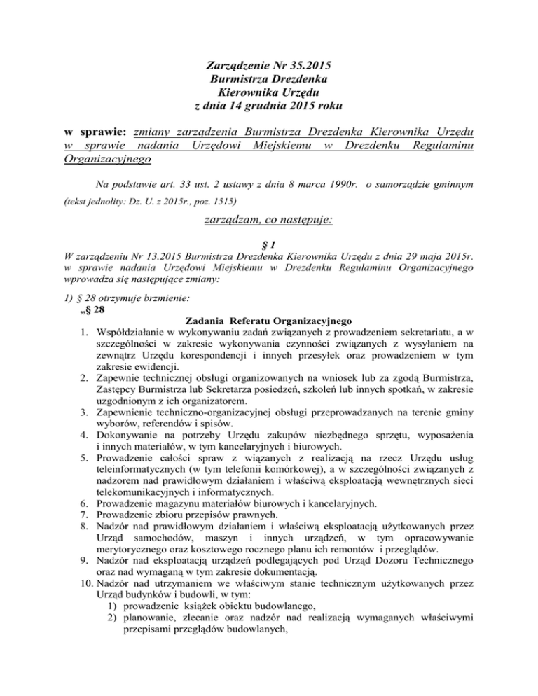 Zarządzenie Nr 35.2015 Burmistrza Drezdenka Kierownika Urzędu z dnia 14 grudnia 2015 roku w sprawie: zmiany zarządzenia Burmistrza Drezdenka Kierownika Urzędu w sprawie nadania Urzędowi Miejskiemu w Drezdenku Regulaminu Organizacyjnego Na podstawie art. 33 ust. 2 ustawy z dnia 8 marca 1990r. o samorządzie gminnym (tekst jednolity: Dz. U. z 2015r., poz. 1515) zarządzam, co następuje: §1 W zarządzeniu Nr 13.2015 Burmistrza Drezdenka Kierownika Urzędu z dnia 29 maja 2015r. w sprawie nadania Urzędowi Miejskiemu w Drezdenku Regulaminu Organizacyjnego wprowadza się następujące zmiany: 1) § 28 otrzymuje brzmienie: „§ 28 Zadania Referatu Organizacyjnego 1. Współdziałanie w wykonywaniu zadań związanych z prowadzeniem sekretariatu, a w szczególności w zakresie wykonywania czynności związanych z wysyłaniem na zewnątrz Urzędu korespondencji i innych przesyłek oraz prowadzeniem w tym zakresie ewidencji. 2. Zapewnie technicznej obsługi organizowanych na wniosek lub za zgodą Burmistrza, Zastępcy Burmistrza lub Sekretarza posiedzeń, szkoleń lub innych spotkań, w zakresie uzgodnionym z ich organizatorem. 3. Zapewnienie techniczno-organizacyjnej obsługi przeprowadzanych na terenie gminy wyborów, referendów i spisów. 4. Dokonywanie na potrzeby Urzędu zakupów niezbędnego sprzętu, wyposażenia i innych materiałów, w tym kancelaryjnych i biurowych. 5. Prowadzenie całości spraw z wiązanych z realizacją na rzecz Urzędu usług teleinformatycznych (w tym telefonii komórkowej), a w szczególności związanych z nadzorem nad prawidłowym działaniem i właściwą eksploatacją wewnętrznych sieci telekomunikacyjnych i informatycznych. 6. Prowadzenie magazynu materiałów biurowych i kancelaryjnych. 7. Prowadzenie zbioru przepisów prawnych. 8. Nadzór nad prawidłowym działaniem i właściwą eksploatacją użytkowanych przez Urząd samochodów, maszyn i innych urządzeń, w tym opracowywanie merytorycznego oraz kosztowego rocznego planu ich remontów i przeglądów. 9. Nadzór nad eksploatacją urządzeń podlegających pod Urząd Dozoru Technicznego oraz nad wymaganą w tym zakresie dokumentacją. 10. Nadzór nad utrzymaniem we właściwym stanie technicznym użytkowanych przez Urząd budynków i budowli, w tym: 1) prowadzenie książek obiektu budowlanego, 2) planowanie, zlecanie oraz nadzór nad realizacją wymaganych właściwymi przepisami przeglądów budowlanych, 3) opracowywanie merytorycznego oraz kosztowego rocznego planu ich remontów i przeglądów. 11. Planowanie, zlecanie i nadzór nad realizacją, zgodnie z aktualnymi przepisami, badań elektrycznych dotyczących maszyn, urządzeń i instalacji w zakresie ochrony przeciwporażeniowej i przeciwpożarowej oraz prowadzenie związanej z tym dokumentacji. 12. Wykonywanie drobnych napraw i prac konserwacyjnych w Urzędzie. 13. Nadzór nad firmami zewnętrznymi świadczącymi usługi na rzecz Urzędu i na jego terenie w zakresie działania Referatu, w tym nad przestrzeganiem przez nie obowiązujących przepisów BHP i P-POŻ przy realizacji tych prac, ze szczególnym uwzględnieniem wymagań określonych w art. 208 Kodeksu pracy. 14. Wykonywanie czynności związanych z ewidencją środków trwałych oraz współpraca w tym zakresie z Referatem Finansowo-Budżetowym. 15. Zapewnienie ochrony fizycznej Urzędu. 16. Prowadzenie spraw związanych z dekoracją miasta w okresach świątecznych. 17. Prowadzenie analiz działań prowadzonych w zakresie zadań Referatu oraz zgłaszanie Burmistrzowi wniosków mających na celu ich usprawnienie oraz obniżenie ponoszonych w monitorowanych obszarach kosztów. 18. Zadania związane z informatyką: 1) administrowanie stroną internetową Urzędu, 2) administrowanie stroną Biuletynu Informacji Publicznej Urzędu, 3) koordynowanie wszelkich działań informatycznych w Urzędzie, 4) wdrażanie nowych rozwiązań informatycznych, 5) podejmowanie działań dotyczących konserwacji i napraw sprzętu komputerowego, 6) monitorowanie pracy i wykorzystywania sprzętu komputerowego, 7) dokonywanie oceny i klasyfikacji sprzętu komputerowego do wymiany lub naprawy w wyspecjalizowanych serwisach, 8) prowadzenie i aktualizowanie ewidencji sprzętu komputerowego i oprogramowań, 9) nadzór nad legalnością wykorzystywanego w Urzędzie sprzętu i oprogramowań, 10) szkolenie pracowników w zakresie obsługi systemu informatycznego, 11) administrowanie siecią gminną. 19. Nawiązywanie kontaktów i współpraca z instytucjami dysponującymi środkami finansowymi przeznaczonymi na rozwój turystyki, kultury i sportu oraz aktywizację gospodarczą Gminy. 20. Planowanie i wdrażanie do realizacji przedsięwzięć związanych z promocją Gminy oraz współdziałanie z innymi podmiotami w zakresie ich organizacji. 21. Współpraca i utrzymywanie stałych kontaktów z miastami partnerskimi. 22. Prowadzenie ewidencji pól biwakowych i innych obiektów, w których świadczone są usługi hotelarskie. 23. Organizacja spotkań i wyjazdów związanych z realizacją zadań należących do właściwości referatu. 24. Prowadzenie spraw organizacyjnych związanych z wnioskami dotyczącymi wykorzystania Funduszy Sołeckich oraz współpraca z właściwymi komórkami Urzędu w zakresie ich realizacji. 25. Prowadzenie rejestru samorządowych instytucji kultury. 26. Inicjowanie i koordynowanie zadań w zakresie publikacji oraz wydawnictw promocyjnych, w tym dotyczących wydawania gazety samorządowej. 27. Prowadzenie dokumentacji oraz spraw związanych z przystępowaniem i uczestnictwem Gminy w stowarzyszeniach i związkach gmin. 28. Kompletowanie materiałów do informatorów przygotowywanych i opracowywanych przez wydawnictwa zewnętrzne. 29. Koordynacja działań związanych z obchodami świąt, rocznic państwowych i lokalnych. 30. Prowadzenie spraw związanych ze stypendiami sportowymi i naukowymi. 31. Prowadzenie spraw związanych z przygotowaniem i utrzymaniem kąpielisk oraz miejsc wykorzy