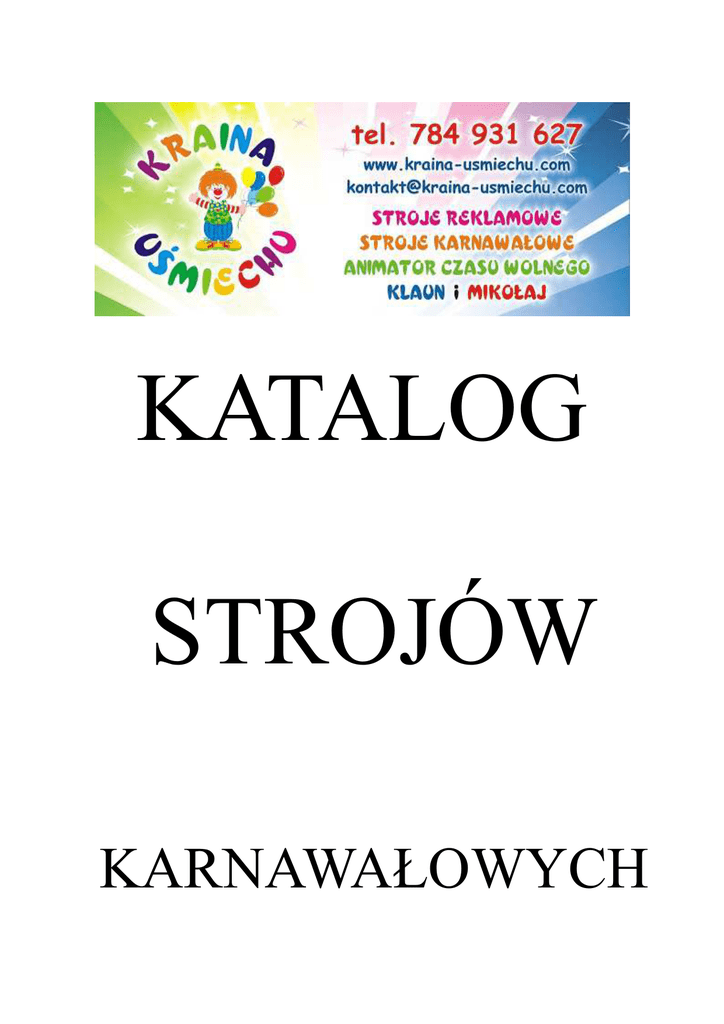KATALOG STROJÓW KARNAWAŁOWYCH DZIEWCZYNKA 2 LATA (86-92) KRÓLICZEK MAŁPKA PIESEK DALMATYŃCZYK ŻYRAFA DZIEWCZYNKA 3-4 LATA (98-104) KRÓLICZEK MAŁPKA PIESEK DALMATYŃCZYK ŻYRAFA CZERWONY KAPTUREK CZERWONY KAPTUREK DIABEŁEK DZIEWCZYNKA 4-6 (110-116) KRÓLEWNA ŚNIEŻKA KRÓLOWA IZOLDA KRÓLOWA RENESANSU PIRATKA KOWBOJKA INDIANKA CZERWONY KAPTUREK MOTYLEK CZAROWNICA BIEDRONKA INDIANKA EKO ANIOŁEK KRÓLOWA BALU DIABLICA PIĘKNA KSIĘŻNICZKA KSIĘŻNICZKA AMELIA KRÓLICZEK MAŁPKA DZIEWCZYNKA 7-9 (122-128) KSIĘŻNICZKA AMELIA KRÓLOWA RENESANSU BŁĘKITNA KSIĘŻNICZKA KOWBOJKA INDIANKA PSZCZÓŁKA KOBIETA KOŚCIOTRUP CZAROWNICA CZAROWNICA DIABLICA PIĘKNA KSIĘŻNICZKA DZIEWCZYNKA 10-12 LAT (134-140-146) KRÓLEWNA ŚNIEŻKA KSIĘŻNICZKA AMELIA KOWBOJKA PSZCZÓŁKA INDIANKA CZAROWNICA DIABLICA KSIĘŻNICZKA PIĘKNA KSIĘŻNICZKA