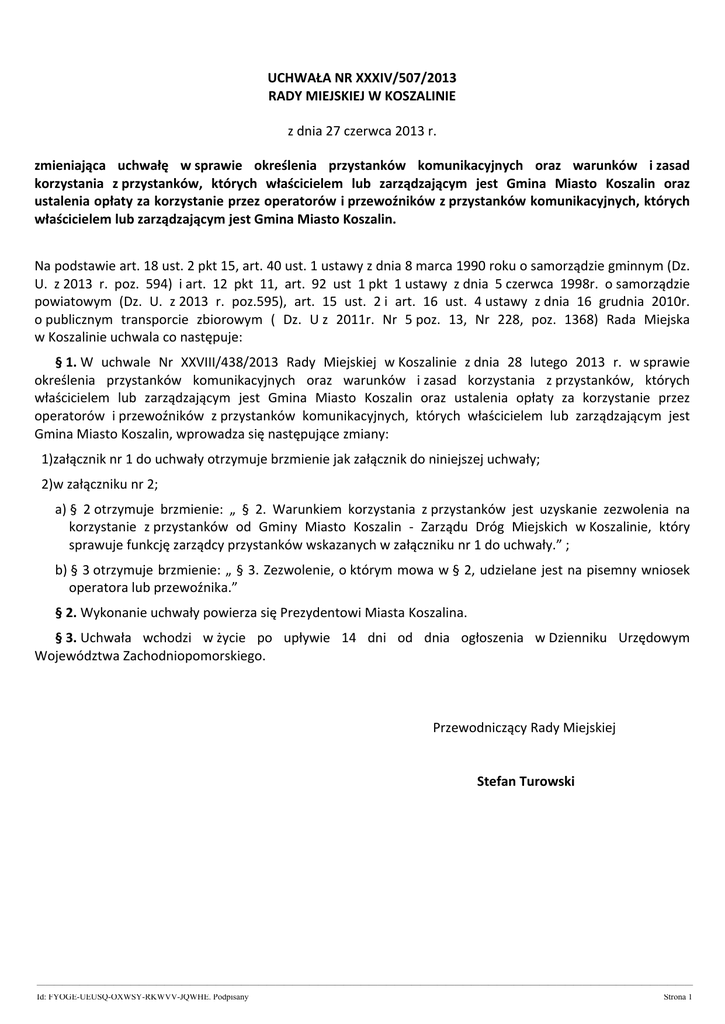 UCHWAŁA NR XXXIV/507/2013 RADY MIEJSKIEJ W KOSZALINIE z dnia 27 czerwca 2013 r. zmieniająca uchwałę w sprawie określenia przystanków komunikacyjnych oraz warunków i zasad korzystania z przystanków, których właścicielem lub zarządzającym jest Gmina Miasto Koszalin oraz ustalenia opłaty za korzystanie przez operatorów i przewoźników z przystanków komunikacyjnych, których właścicielem lub zarządzającym jest Gmina Miasto Koszalin. Na podstawie art. 18 ust. 2 pkt 15, art. 40 ust. 1 ustawy z dnia 8 marca 1990 roku o samorządzie gminnym (Dz. U. z 2013 r. poz. 594) i art. 12 pkt 11, art. 92 ust 1 pkt 1 ustawy z dnia 5 czerwca 1998r. o samorządzie powiatowym (Dz. U. z 2013 r. poz.595), art. 15 ust. 2 i art. 16 ust. 4 ustawy z dnia 16 grudnia 2010r. o publicznym transporcie zbiorowym ( Dz. U z 2011r. Nr 5 poz. 13, Nr 228, poz. 1368) Rada Miejska w Koszalinie uchwala co następuje: § 1. W uchwale Nr XXVIII/438/2013 Rady Miejskiej w Koszalinie z dnia 28 lutego 2013 r. w sprawie określenia przystanków komunikacyjnych oraz warunków i zasad korzystania z przystanków, których właścicielem lub zarządzającym jest Gmina Miasto Koszalin oraz ustalenia opłaty za korzystanie przez operatorów i przewoźników z przystanków komunikacyjnych, których właścicielem lub zarządzającym jest Gmina Miasto Koszalin, wprowadza się następujące zmiany: 1)załącznik nr 1 do uchwały otrzymuje brzmienie jak załącznik do niniejszej uchwały; 2)w załączniku nr 2; a) § 2 otrzymuje brzmienie: „ § 2. Warunkiem korzystania z przystanków jest uzyskanie zezwolenia na korzystanie z przystanków od Gminy Miasto Koszalin - Zarządu Dróg Miejskich w Koszalinie, który sprawuje funkcję zarządcy przystanków wskazanych w załączniku nr 1 do uchwały.” ; b) § 3 otrzymuje brzmienie: „ § 3. Zezwolenie, o którym mowa w § 2, udzielane jest na pisemny wniosek operatora lub przewoźnika.” § 2. Wykonanie uchwały powierza się Prezydentowi Miasta Koszalina. § 3. Uchwała wchodzi w życie po upływie 14 dni od dnia ogłoszenia w Dzienniku Urzędowym Województwa Zachodniopomorskiego. Przewodniczący Rady Miejskiej Stefan Turowski ————————————————————————————————————————————————————————————————————————————— Id: FYOGE-UEUSQ-OXWSY-RKWVV-JQWHE. Podpisany Strona 1 Załącznik Nr 1 do Uchwały nr XXXIV/507/2013 Rady Miejskiej w Koszalinie z dnia 27 czerwca 2013r. WYKAZ PRZYSTANKÓW KOMUNIKACYJNYCH, KTÓRYCH WŁAŚCICIELEM LUB ZARZĄDZAJĄCYM JEST GMINA MIASTO KOSZALIN Lp. 1 1 2 3 4 5 6 7 8 9 10 11 12 13 14 15 16 17 18 19 20 21 22 23 24 25 26 27 28 29 30 31 32 33 34 35 36 37 38 39 40 Nazwa ulicy/rejon 2 1 Maja 1 Maja 4 Marca 4 Marca 4 Marca 4 Marca 4 Marca 4 Marca 4 Marca Armii Krajowej Armii Krajowej Armii Krajowej Armii Krajowej Armii Krajowej Armii Krajowej Armii Krajowej Armii Krajowej Armii Krajowej Bohaterów Warszawy Bohaterów Warszawy Bohaterów Warszawy Bohaterów Warszawy Bohaterów Warszawy Bohaterów Warszawy BoWiD BoWiD BoWiD BoWiD BoWiD BoWiD BoWiD Tytusa Chałubińskiego Tytusa Chałubińskiego Tytusa Chałubińskiego Tytusa Chałubińskiego Energetyków Juliana Fałata Juliana Fałata Juliana Fałata Franciszkańska Numer *** 3 01 02 01 02 04 03 05 06 07 02 04 03 05 07 09 01 06 11 01 03 02 05 07 04 02 01 04 06 03 08 05 02 01 04 03 02 02 01 03 01 Nazwa przystanku 4 Andersa Bank Jednostka Wojskowa Reymonta Wojska Polskiego Wojska Polskiego Gnieźnieńska Gnieźnieńska Połczyńska Kosmos Bank Dworzec PKP pętla Dworzec PKP pętla Dworzec PKP pętla Dworzec PKP pętla Dworzec PKP Niepodległości Kościół Morska Mieszka I Brzozowa Brzozowa Syrenki Syrenki Przemysłowa Mieszka I ZORD Przemysłówka Zakłady Przetwórcze Kospel Kospel pętla Szpital Szpital Leśna Centrum Edukacji Morska Szkoła Wańkowicza Jana Pawła II Energetyków ————————————————————————————————————————————————————————————————————————————— Id: FYOGE-UEUSQ-OXWSY-RKWVV-JQWHE. Podpisany Strona 2 Lp. 1 41 42 43 44 45 46 47 48 49 50 51 52 53 54 55 56 57 58 59 60 61 62 63 64 65 66 67 68 69 70 71 72 73 74 75 76 77 78 79 80 81 82 83 84 85 86 87 88 89 Nazwa ulicy/rejon 2 Franciszkańska Franciszkańska Francuska Francuska Gdańska Gdańska Gdańska Gdańska Gdańska Gdańska Gdańska/ Darłowska Gdańska /Darłowska Gnieźnieńska Gnieźnieńska Gnieźnieńska Gnieźnieńska Gnieźnieńska Gnieźnieńska Gnieźnieńska Gnieźnieńska Gnieźnieńska Gnieźnieńska Gnieźnieńska Gnieźnieńska Gnieźnieńska Holenderska Holenderska Jamneńska Jamneńska Jamneńska Jamneńska Jamneńska Jamneńska Jamneńska Jana Pawła II Jana Pawła II Jana Pawła II Jana Pawła II Jana Pawła II Jedności Armii Krajowej Armii Krajowej Koszalińska Koszalińska Koszalińska Koszalińska Koszalińska Koszalińska Kościuszki Numer *** 3 02 04 02 04 02 01 07 04 03 06 05 08 02 01 04 03 06 08 05 07 10 12 09 11 14 02 04 01 02 03 04 05 06 08 02 01 03 04 05 02 02 04 02 01 04 03 05 06 02 Nazwa przystanku 4 Energetyków Bosmańska Grecka Fińska Orląt Lwowskich Oskara Lange Stacja Paliw Rolna Kędzierzyn Kędzierzyn Gorzebądź Gorzebądź Połczyńska Modrzejewskiej Szkoła 4 Marca Strażacka Kamieniarska pętla Paderewskiego Cmentarz Cmentarz Cmentarz nowy Kościół Diamentowa Okrężna Maltańska Brytyjska Północna Północna Szkoła pętla Szkoła pętla Wichrowa Wichrowa Filtrowa Politechnika Fałata Jagoszewskiego Staszica Władysława IV Basen Kolejowa * Kolejowa** Ariadna Ariadna Żyzna Żyzna Kwiatowa Kwiatowa Piłsudskiego —————————————————————————————————————————————————————————————————