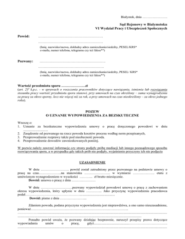 Białystok, dnia …………………. Sąd Rejonowy w Białymstoku VI Wydział Pracy i Ubezpieczeń Społecznych Powód: ………………………………………………… ………………………………………………… (Imię, nazwisko/nazwa, dokładny adres zamieszkania/siedziby, PESEL/KRS* e-maila, numer telefonu, telegramu czy też faksu**) Pozwany: …………………………………………………. …………………………………………………. (Imię, nazwisko/nazwa, dokładny adres zamieszkania/siedziby, PESEL/ KRS* e-maila, numer telefonu, telegramu czy też faksu**) Wartość przedmiotu sporu …………………zł (art. 231 k.p.c. - w sprawach o roszczenia pracowników dotyczące nawiązania, istnienia lub rozwiązania stosunku pracy wartość przedmiotu sporu stanowi, przy umowach na czas określony – suma wynagrodzenia za pracę za okres sporny, lecz nie więcej niż za rok, a przy umowach na czas nieokreślony – za okres jednego roku). POZEW O UZNANIE WYPOWIEDZENIA ZA BEZSKUTECZNE Wnoszę o: 1. Uznanie za bezskuteczne wypowiedzenia umowy o pracę doręczonego powodowi w dniu ............................. 2. Zasądzenie od pozwanego na rzecz powoda kosztów procesu według norm przepisanych, 3. Przeprowadzenie rozprawy także pod nieobecność powoda. 4. Przeprowadzenie dowodów zawnioskowanych poniżej. W pozwie należy zawrzeć informację czy strony podjęły próbę mediacji lub innego pozasądowego sposobu rozwiązywania sporu, a w przypadku gdy takich prób nie podjęły, wyjaśnienie przyczyny ich nie podjęcia UZASADNIENIE W dniu ……………………. powód został zatrudniony przez pozwanego na podstawie umowy o pracę na czas………………..na stanowisku ………………….. w wymiarze ………………. etatu z umówionym wynagrodzeniem w wysokości ………... zł brutto miesięcznie. Dowód: umowa o pracę z dnia ………………… W dniu ……………………….pozwany wypowiedział powodowi umowę o pracę z zachowaniem okresu wypowiedzenia, który upłynie w dniu ………….. Jako przyczynę wypowiedzenia pracodawca podał…………………………………………......................................... Dowód: pismo z dnia …………………... Zdaniem powoda, podana przyczyna wypowiedzenia jest nieprawdziwa, a ono samo nieuzasadnione, ponieważ………………………………………………………………………….. ………………....................................................................................................................................................... ................................................................................................................................................. Ponadto powód uważa, że pozwany działając bezprawnie, naruszył przepisy prawa dotyczące wypowiadania umów o pracę, gdyż.........................................……………………………. ............................................................................................................................................................................... ................................................................................................................................................. Dowód: zeznania świadków: - (imię i nazwisko, adres zamieszkania) - (imię i nazwisko, adres zamieszkania) W świetle przedstawionych okoliczności powództwo jest uzasadnione i zasługuje na uwzględnienie w całości. Strony podjęły/nie podjęły próby mediacji lub innego pozasądowego sposobu rozwiązania sporu ………………………………………………………………………………………………….. (w przypadku, gdy takich prób nie podjęto – należy wyjaśnić przyczyny powyższego) ………………………… / podpis powoda / Załączniki: 1. Odpis pozwu dla pozwanego 2. Kopia umowy o pracę 3. Kopia pisma wypowiadającego umowę o pracę Dodatkowe wyjaśnienia: Roszczeniem alternatywnym wobec żądania uznania wypowiedzenia za bezskuteczne jest roszczenie odszkodowawcze, które może być zgłoszone od razu w pozwie, zamiast żądania uznania bezskuteczności wypowiedzenia. Ponadto w trakcie procesu możliwa jest modyfikacja powództwa i zastąpienie jednego z roszczeń alternatywnych drugim. Sprawy pracownicze do 50 tysięcy złotych wolne są od opłaty, powyżej tej kwoty pobiera się opłatę stosunkową 5% od wartości przedmiotu sporu (oraz od wszystkich pism podlegających opłacie) - opłatę sądową od pozwu uiszczamy w znakach sądowych (kupionych w kasie sądu), lub przelewam na numer konta 36 1010 0055 2963 0040 3600 0006 Sąd zgodnie z Dz.U.2014.101 art. 149 (1) może zastosować uproszczoną formę doręczenia, niż za pośrednictwem poczty, komornika, osób zatrudnionych w sądzie czy sądowej służby doręczeniowej, a mianowicie np. telefonu, e-maila, telegramu czy też faksu. Gdy istnieje taka możliwość, powód może wskazać numer telefonu, adres mailowy, numer telegramu czy też faksu, celem uproszczonej formy przyśpieszenia rozpoznania spraw. Skompletowane dokumenty należy złożyć w biurze podawczym lub przesłać pocztą do Sądu. * informacje obowiązkowe ** informacje nieobowiązkowe www.bialystok.sr.gov.pl